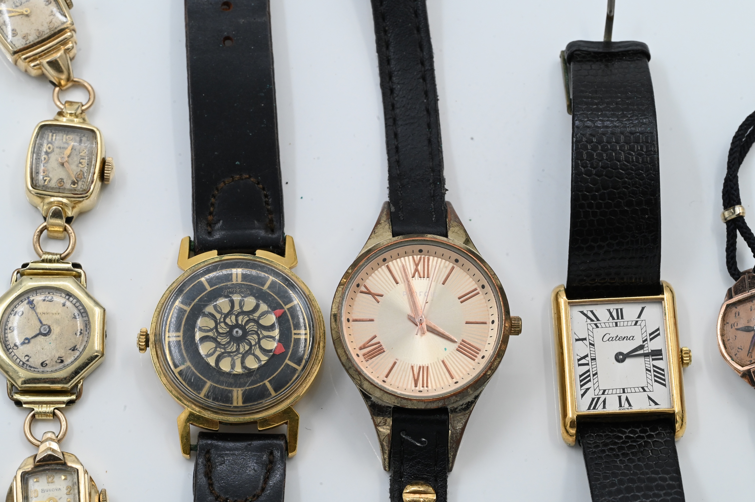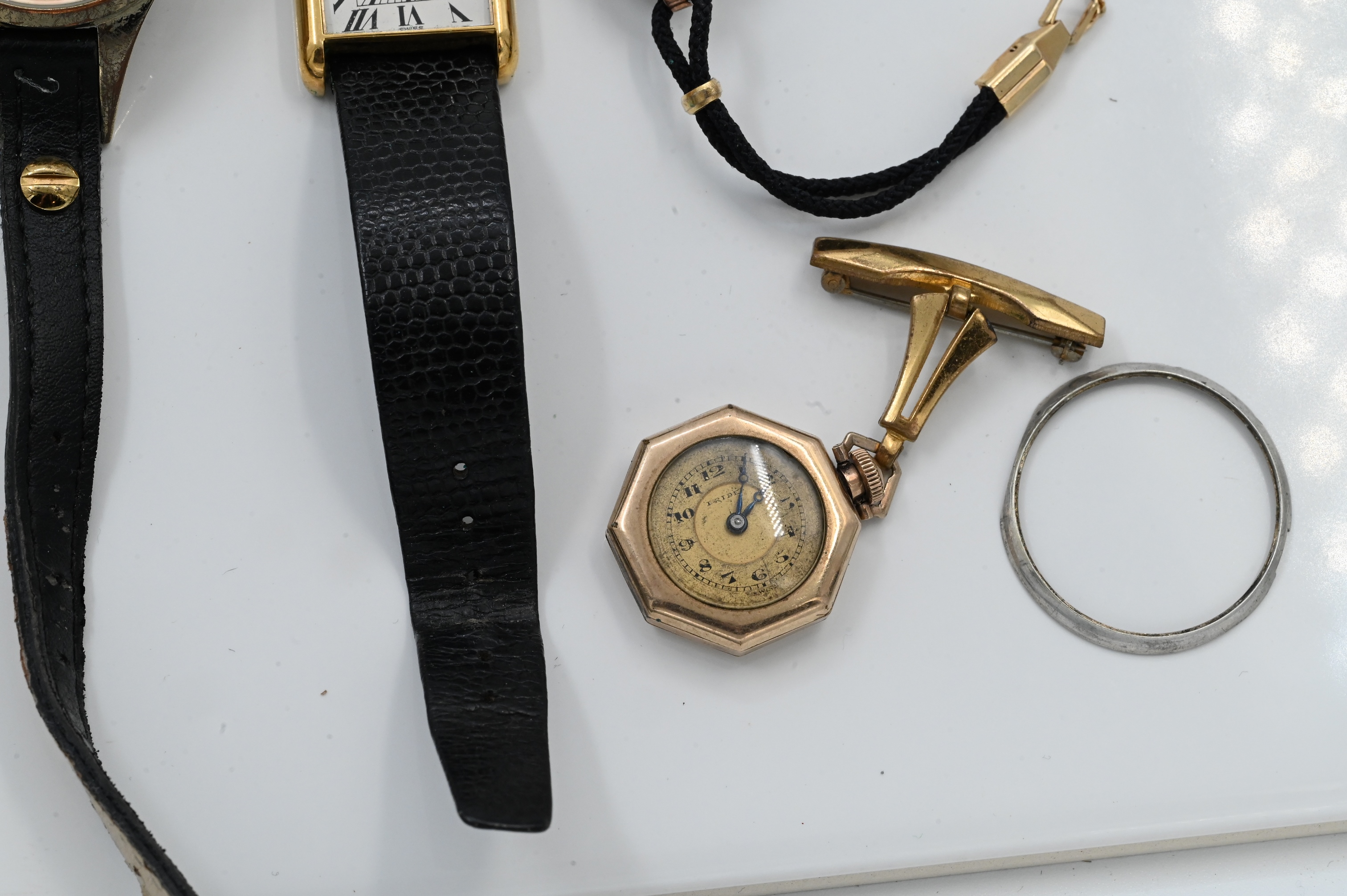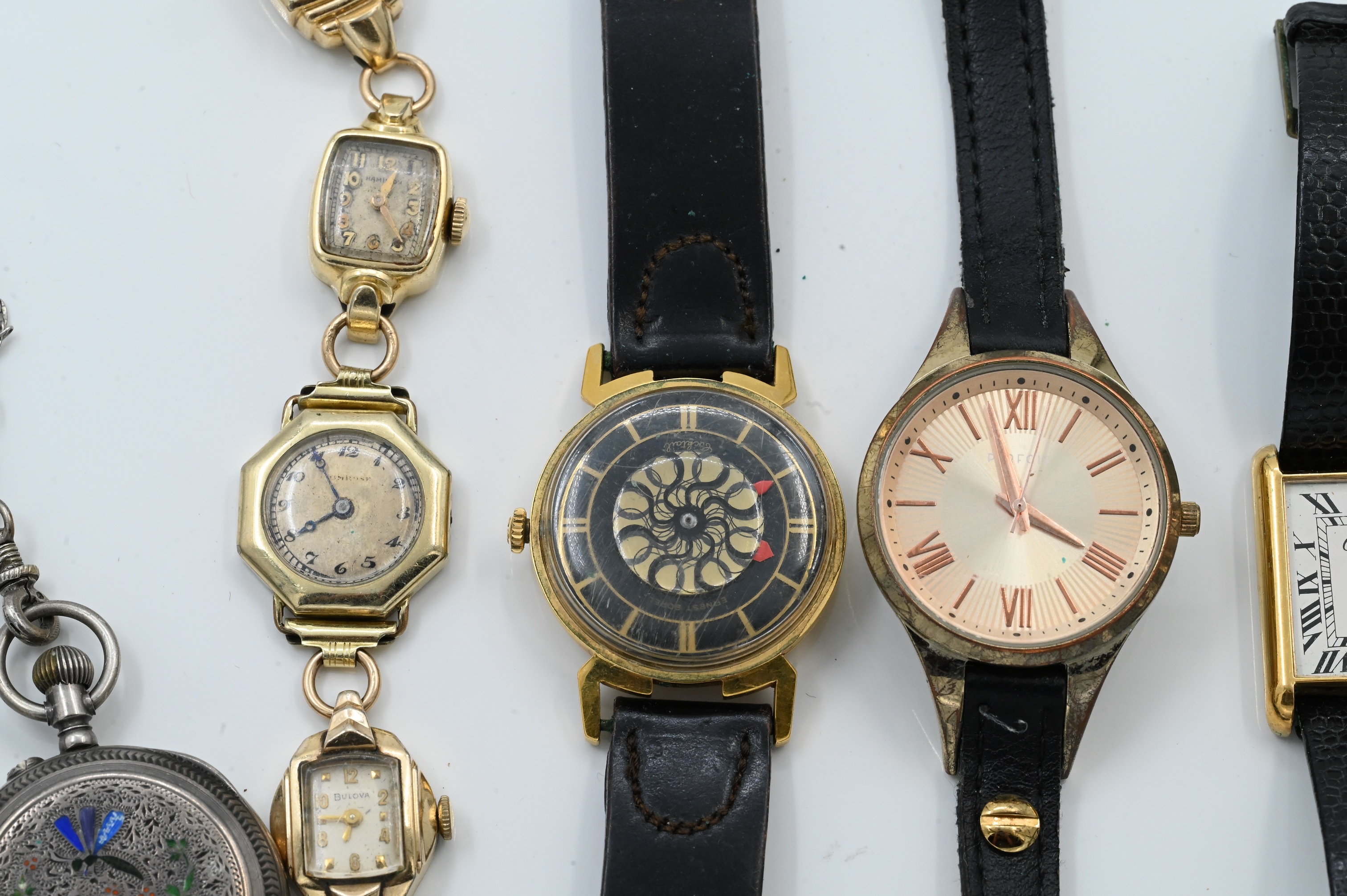 to include Ernest Barrel cocktail, silver and enamel pocket watch, several ladies watches, etc