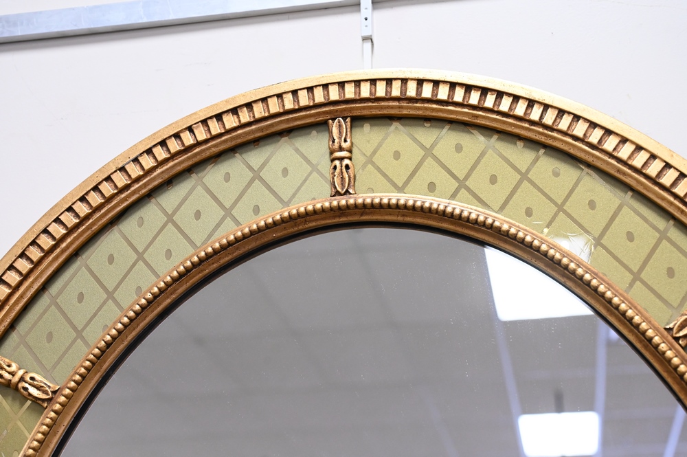 John Widdicomb Oval Mirror, having reverse painted and gilt wood frame, 42″ x 33″.