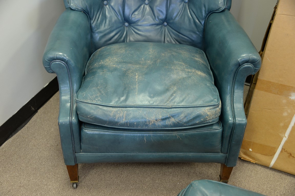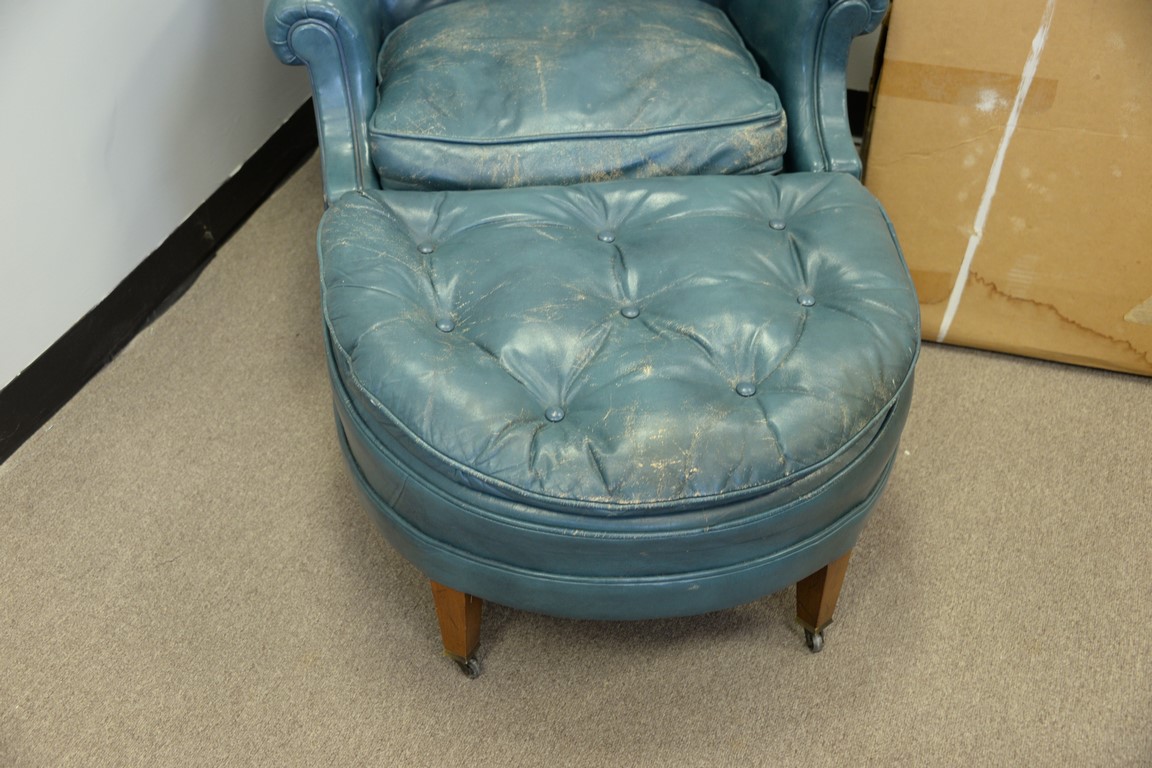 Lot 145: Leather blue easy chair and ottoman some wear.