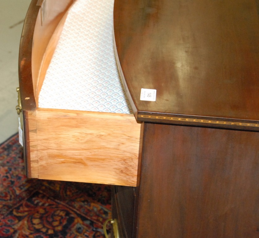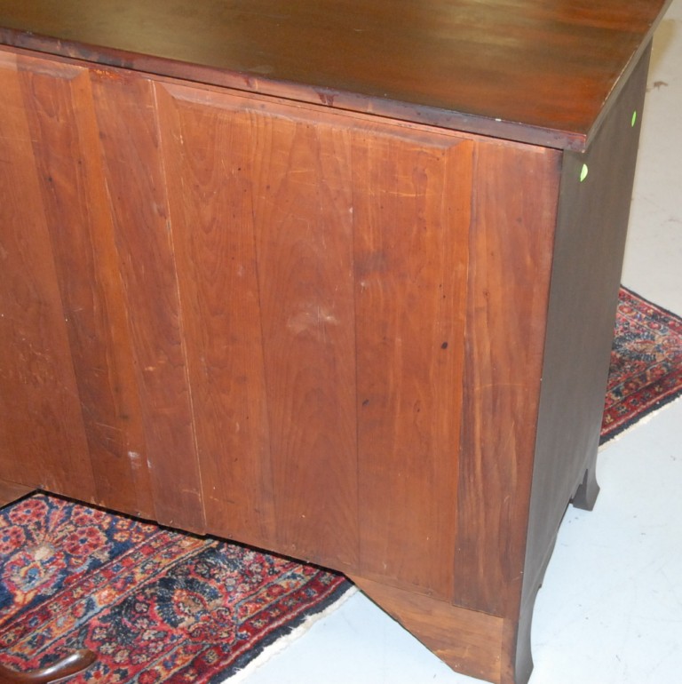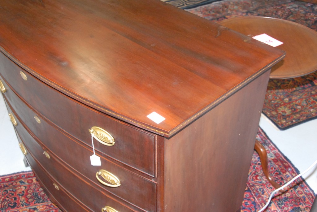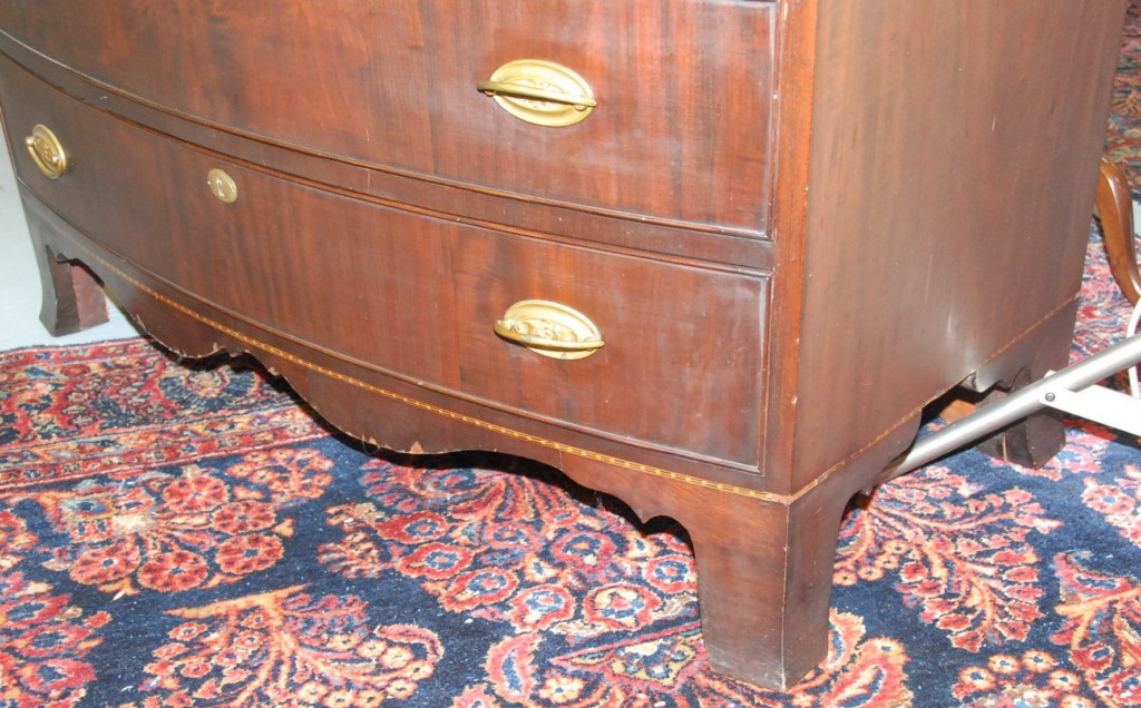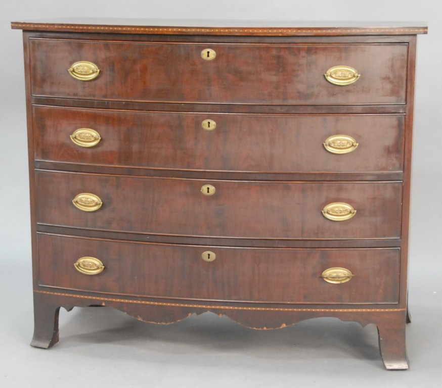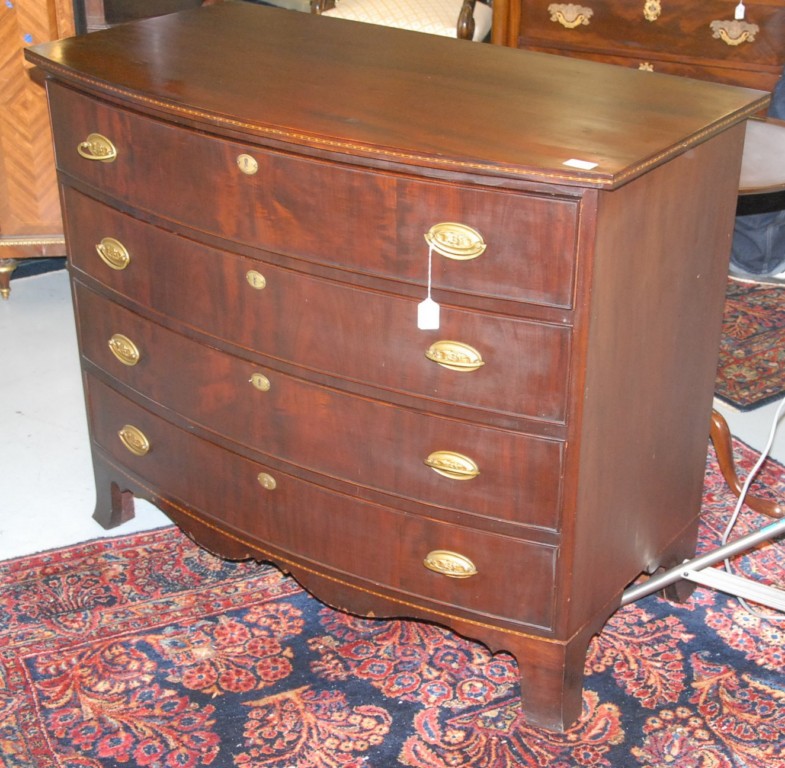 Margolis mahogany four drawer chest Federal style with bowed front and inlays set on bracket feet, made to match lot #144.