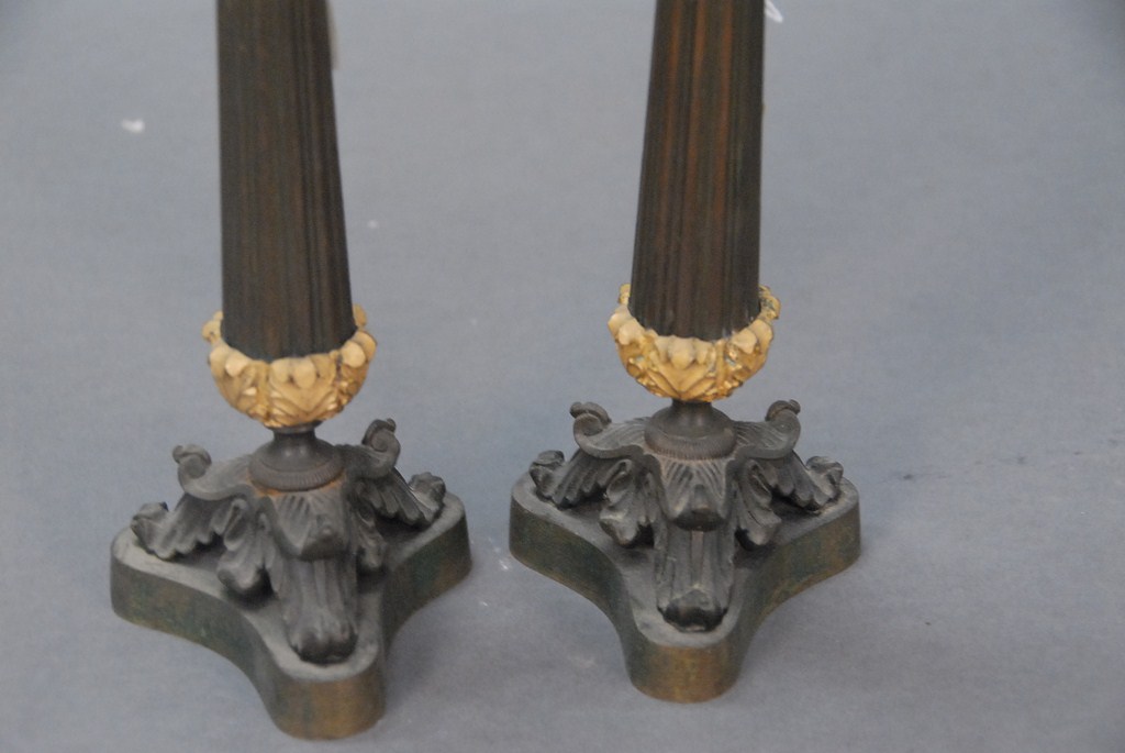 Pair of bronze and gilt bronze candlesticks. Provenance: From prominent Woodbridge, Connecticut family collection. ht. 10in.