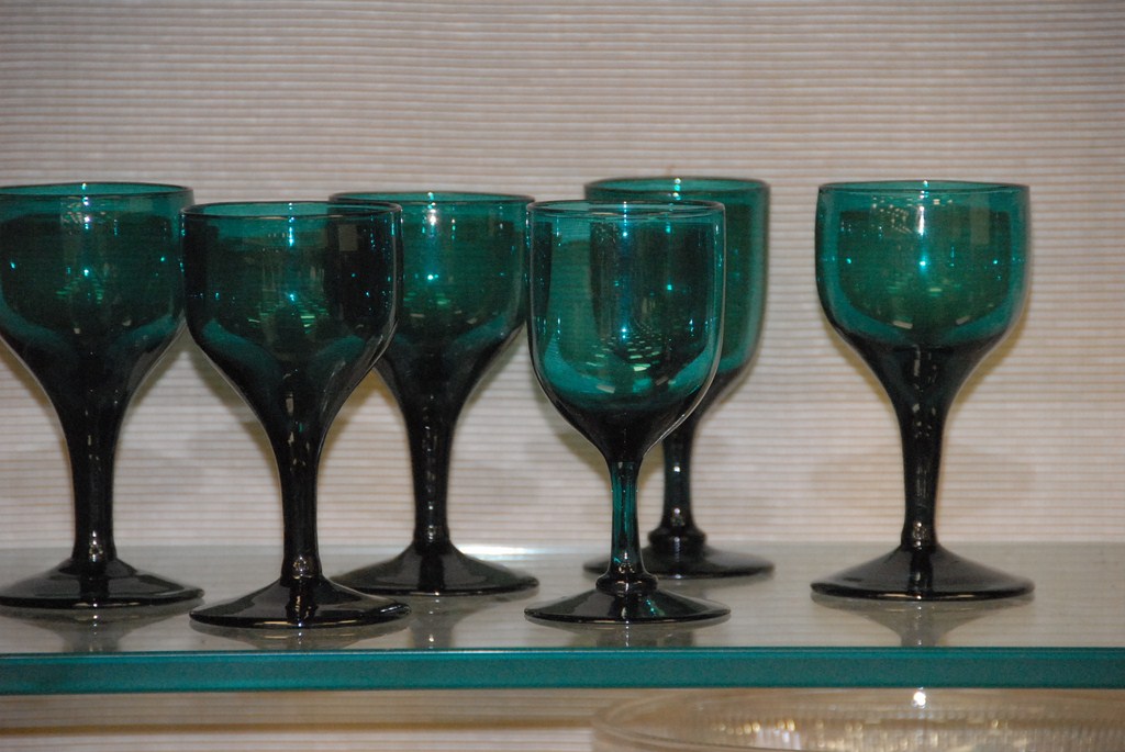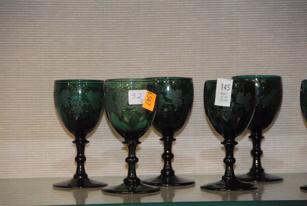 Set of twelve emerald green stems with etched grapes and leaves, ht. 5.