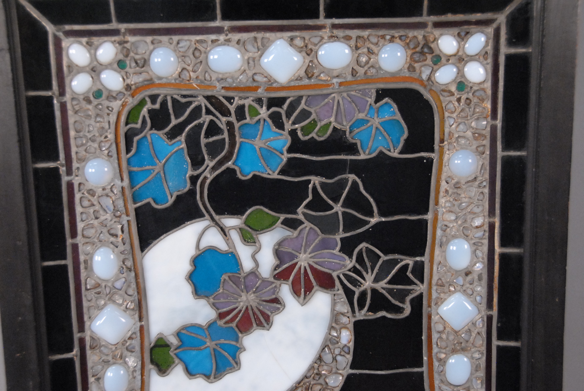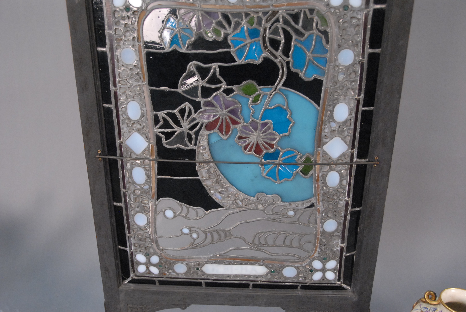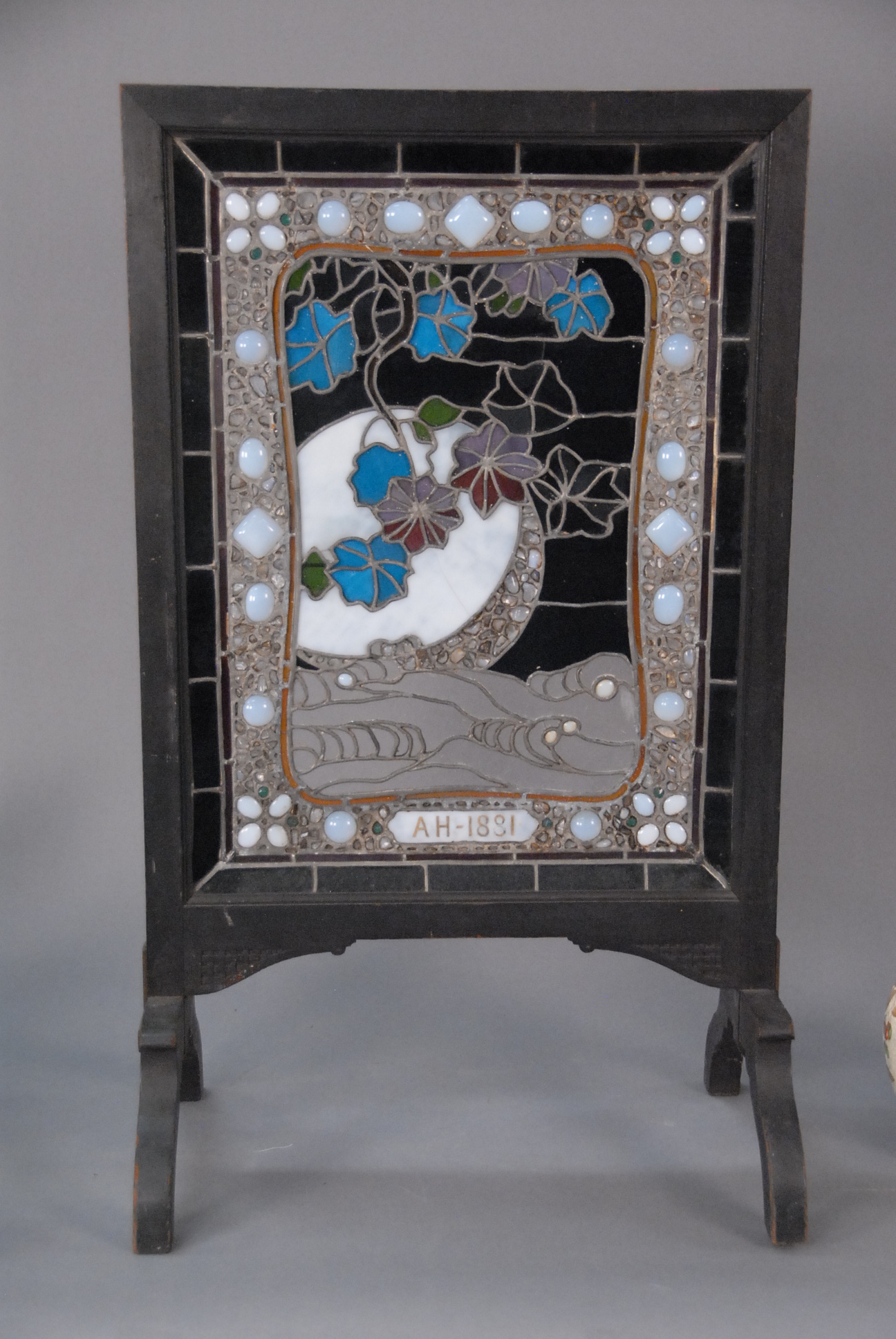 Stained and leaded glass panel mounted as fire screen, dated 1881. ht. 34in. wd. 20in.