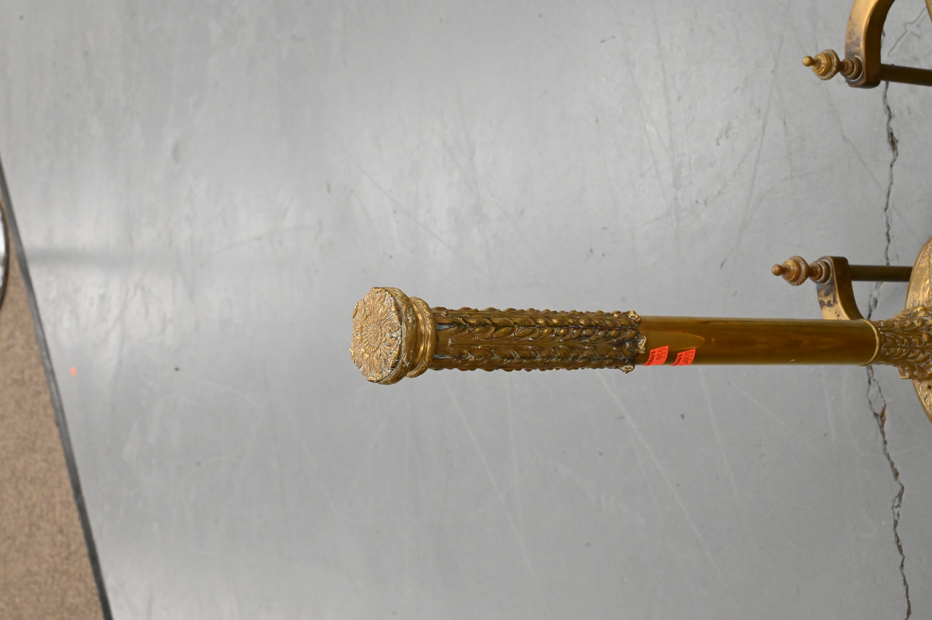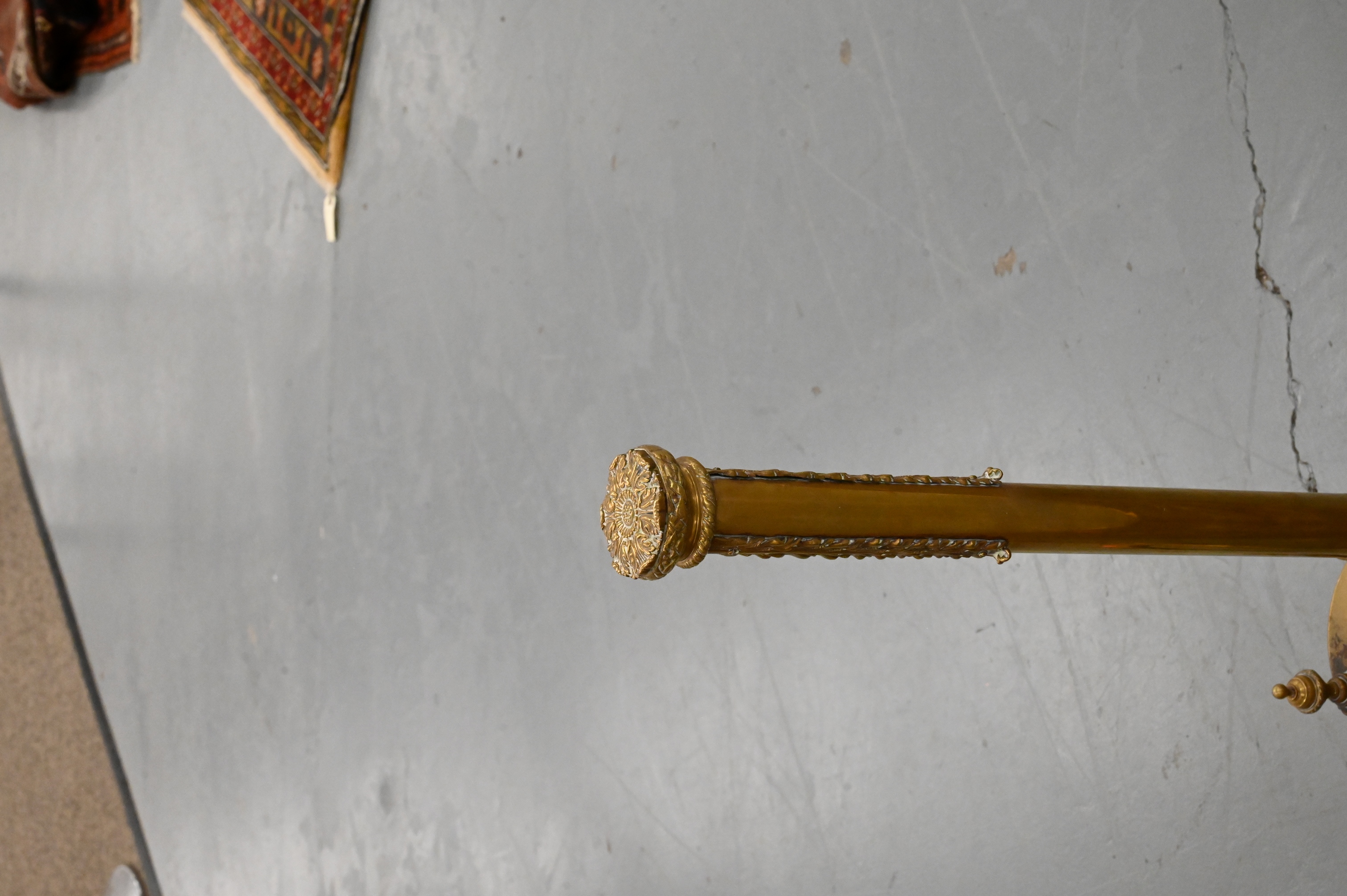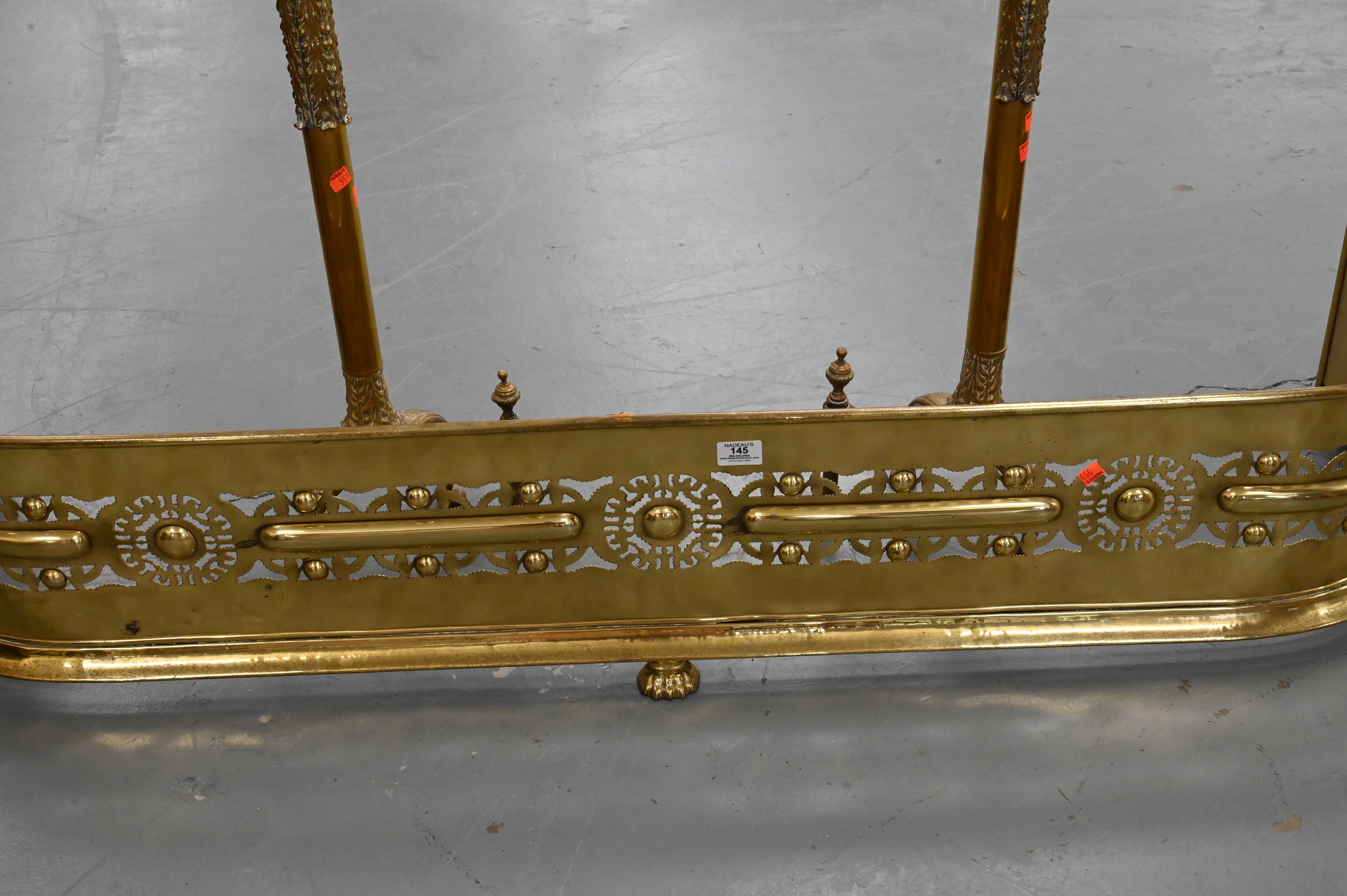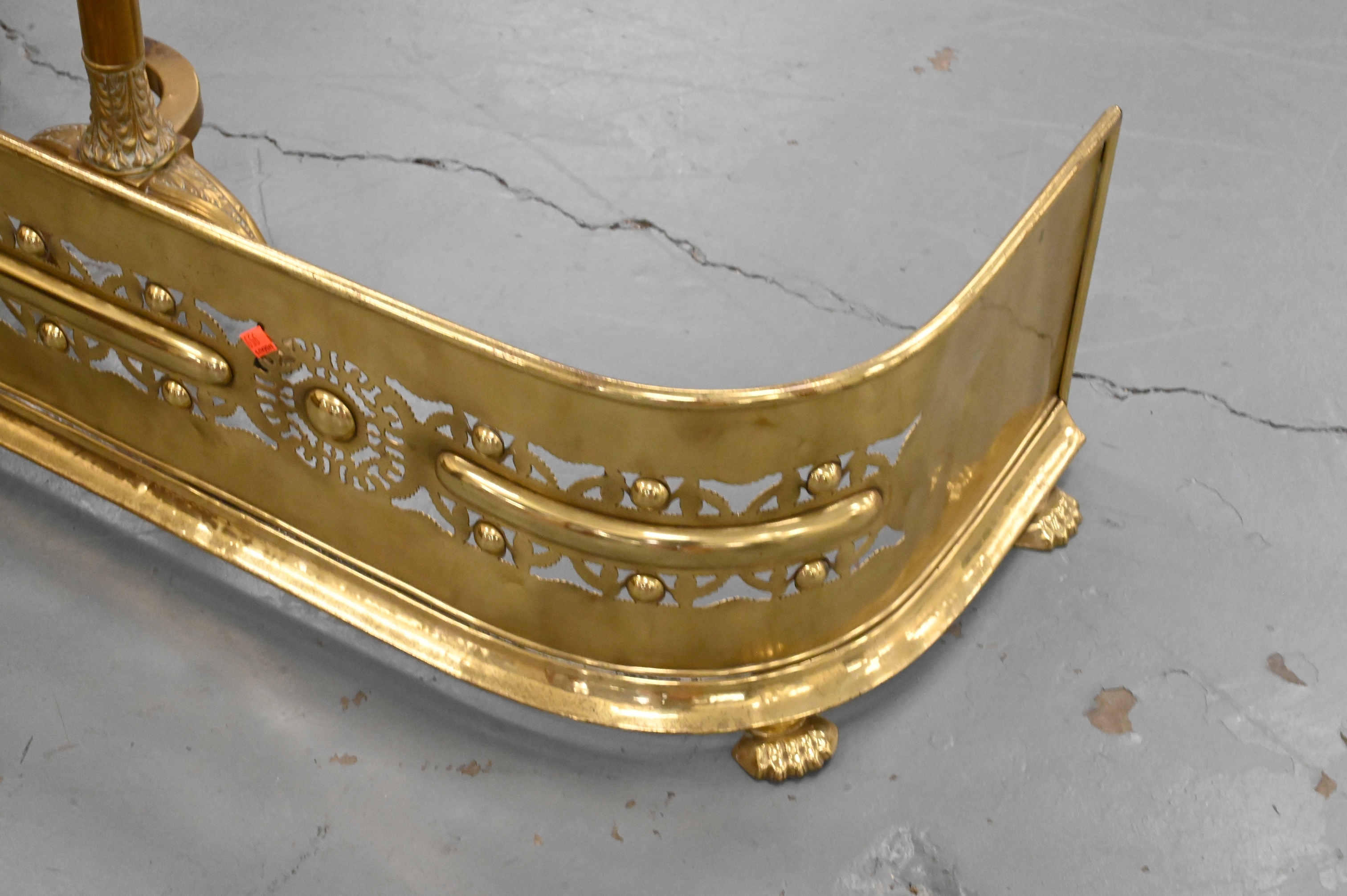 a pair of column form andirons, along with a Georgian style firefender having scrolling motif over paw feet