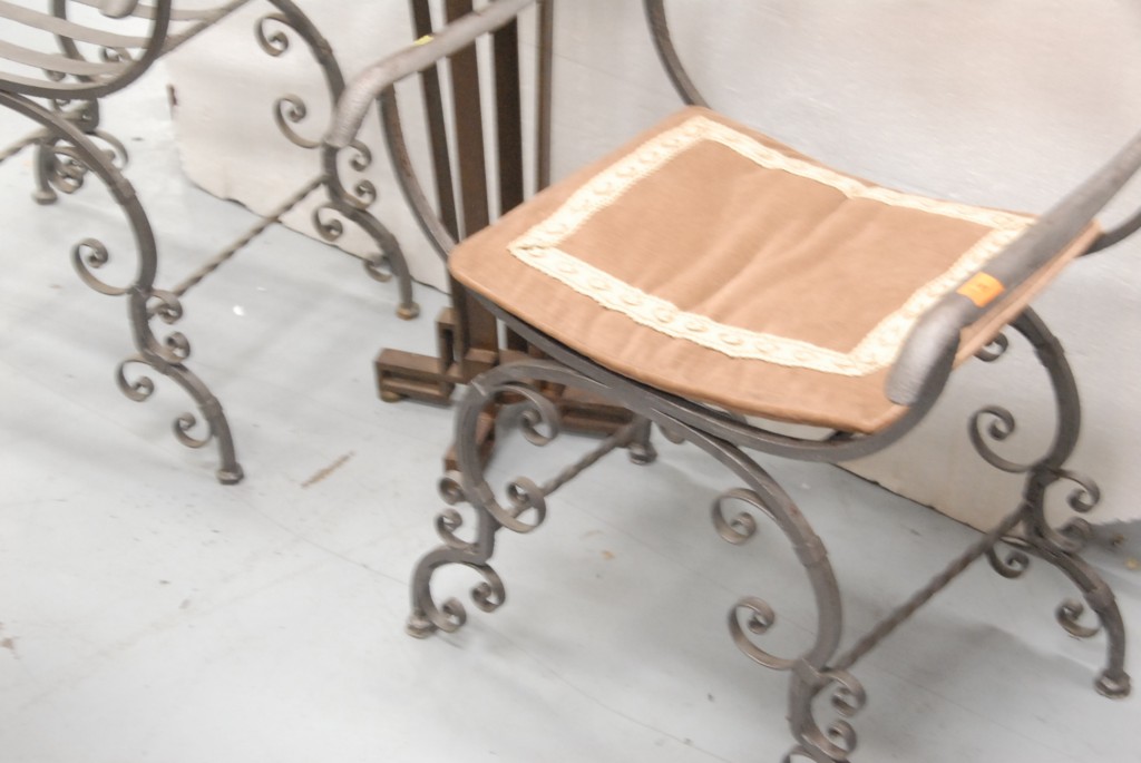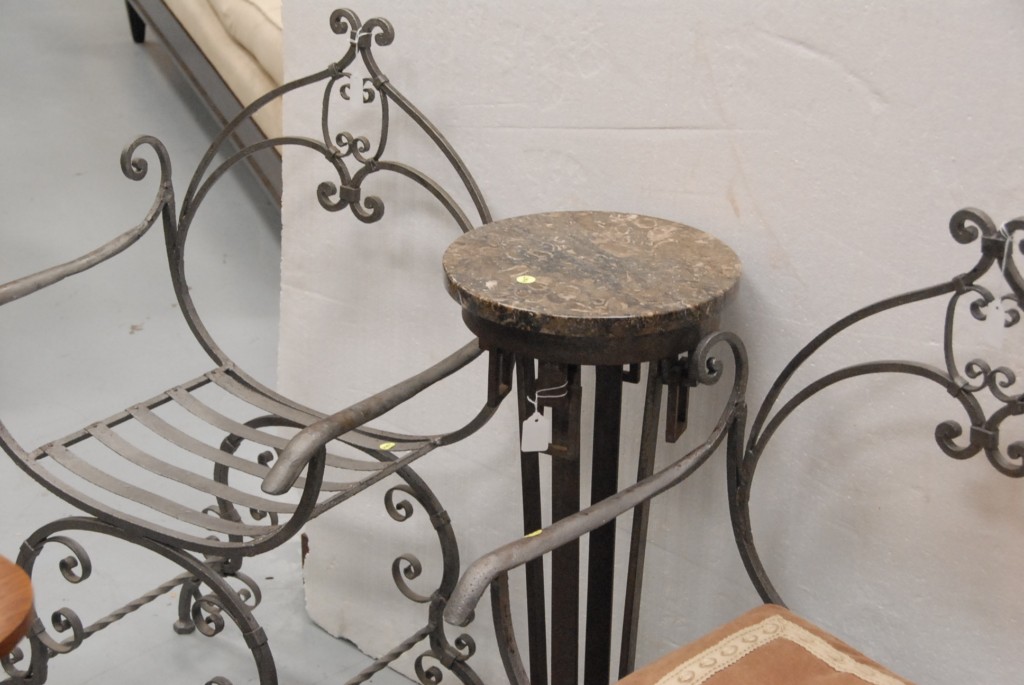 Three piece lot pair of iron armchairs and iron stand with marble top.