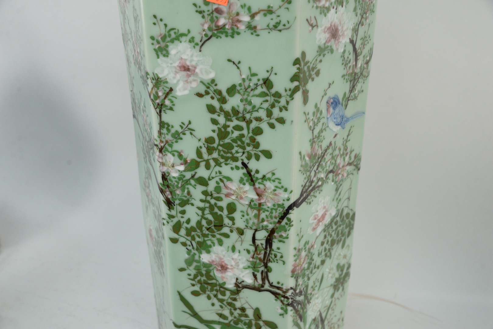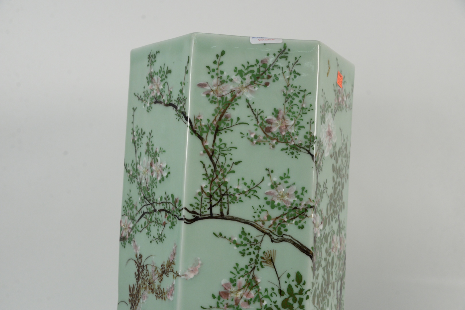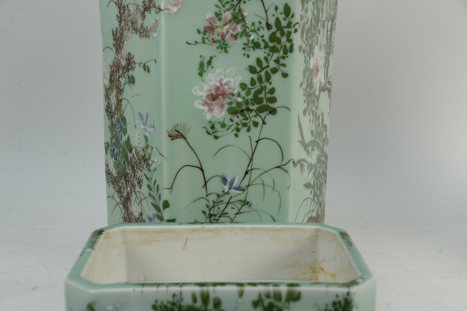 Lot 145: Two Japanese Celadon Glazed Pieces to include a Japanese hexagonal, celadon umbrella stand, height 24 inches along with matching oblong jardiniere, height 4 inches, width 11 inches, both with raised branches and flowers.