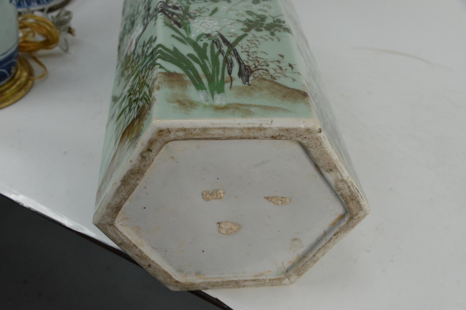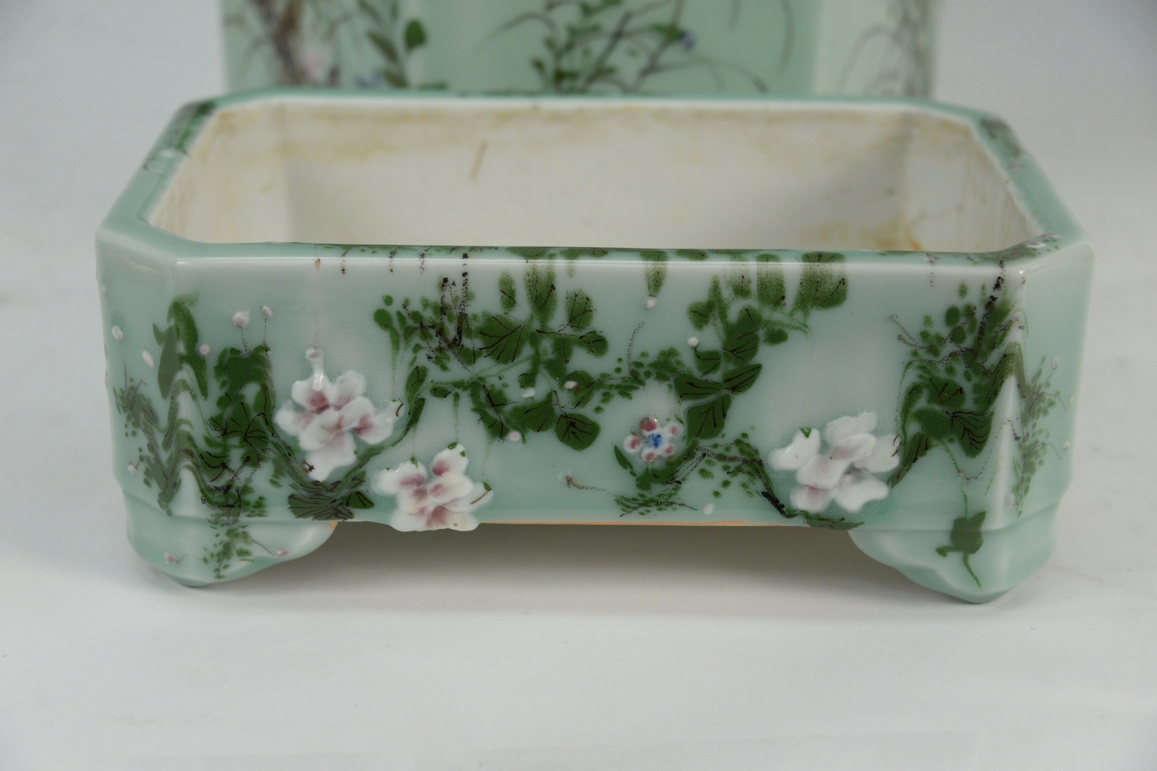 Two Japanese Celadon Glazed Pieces to include a Japanese hexagonal, celadon umbrella stand, height 24 inches along with matching oblong jardiniere, height 4 inches, width 11 inches, both with raised branches and flowers.