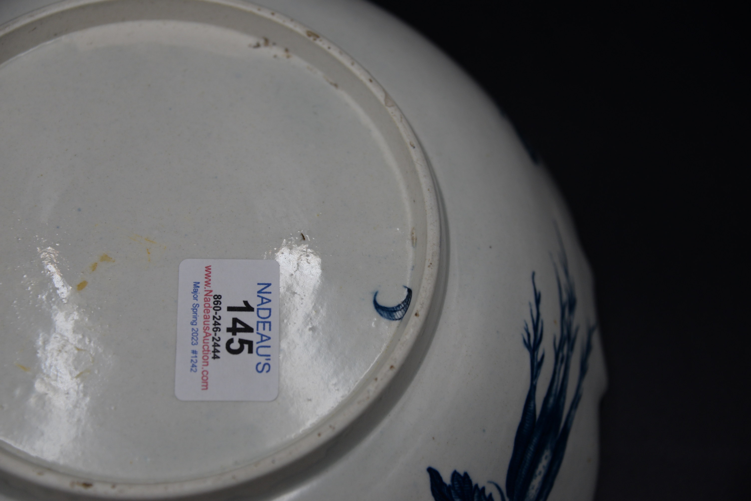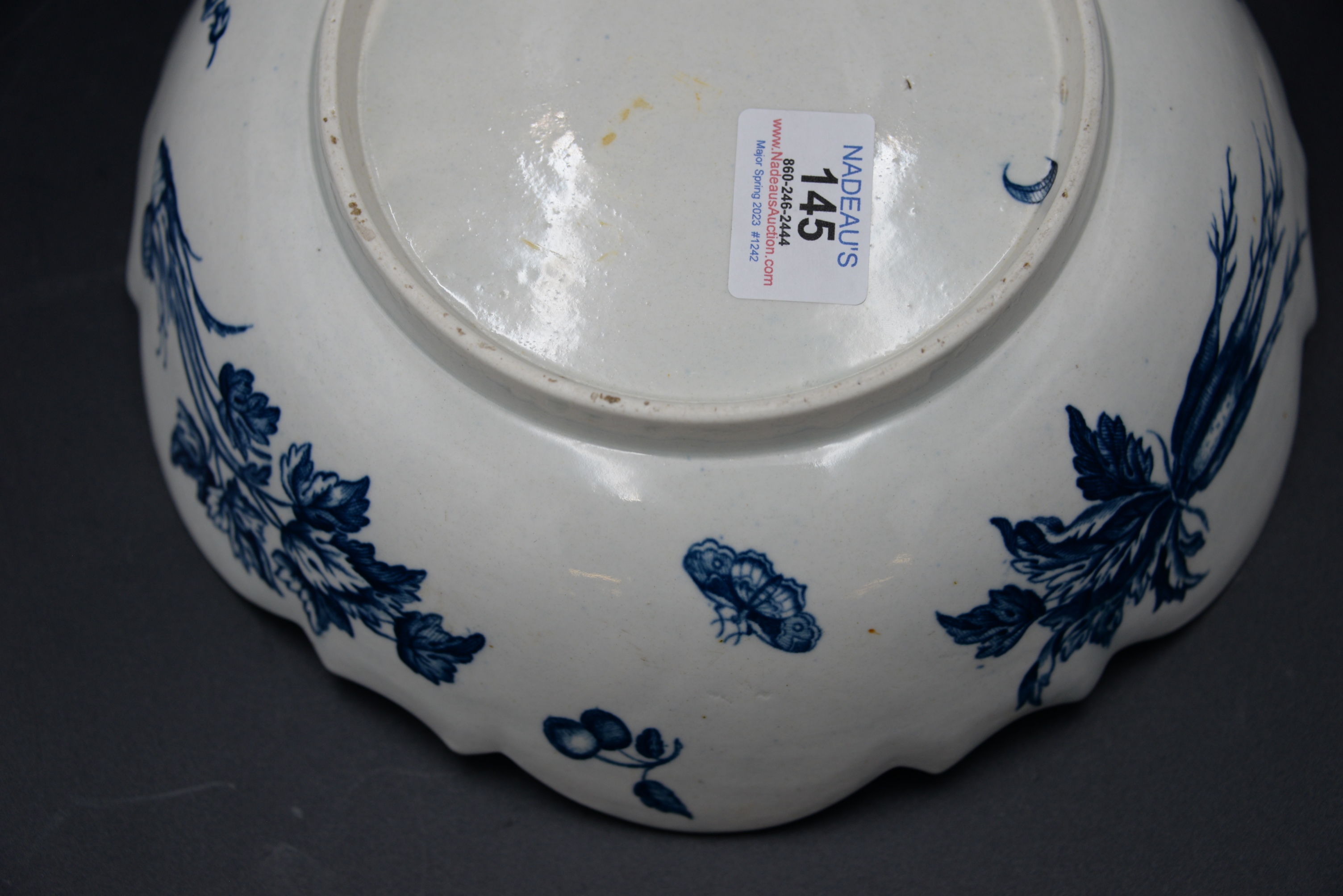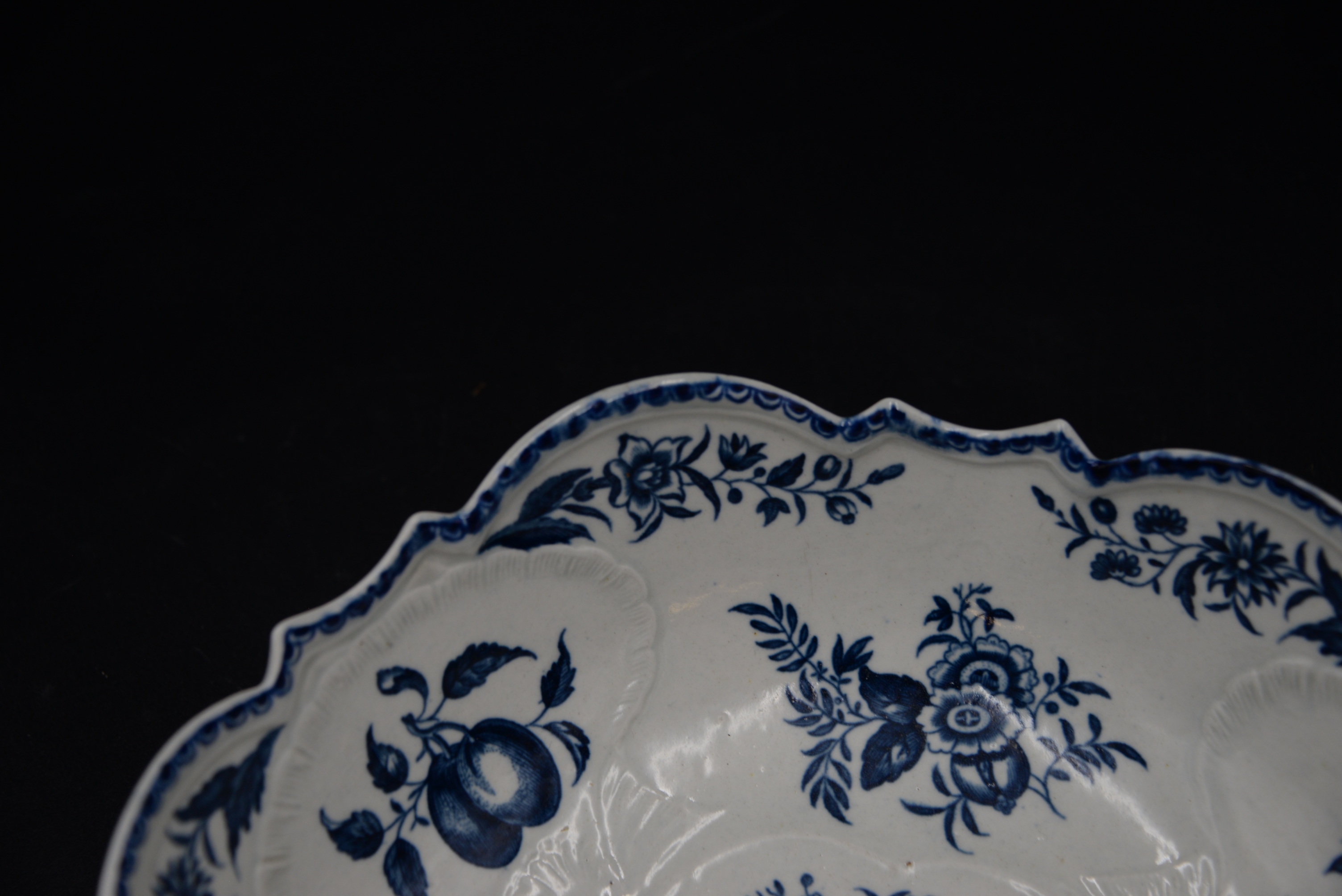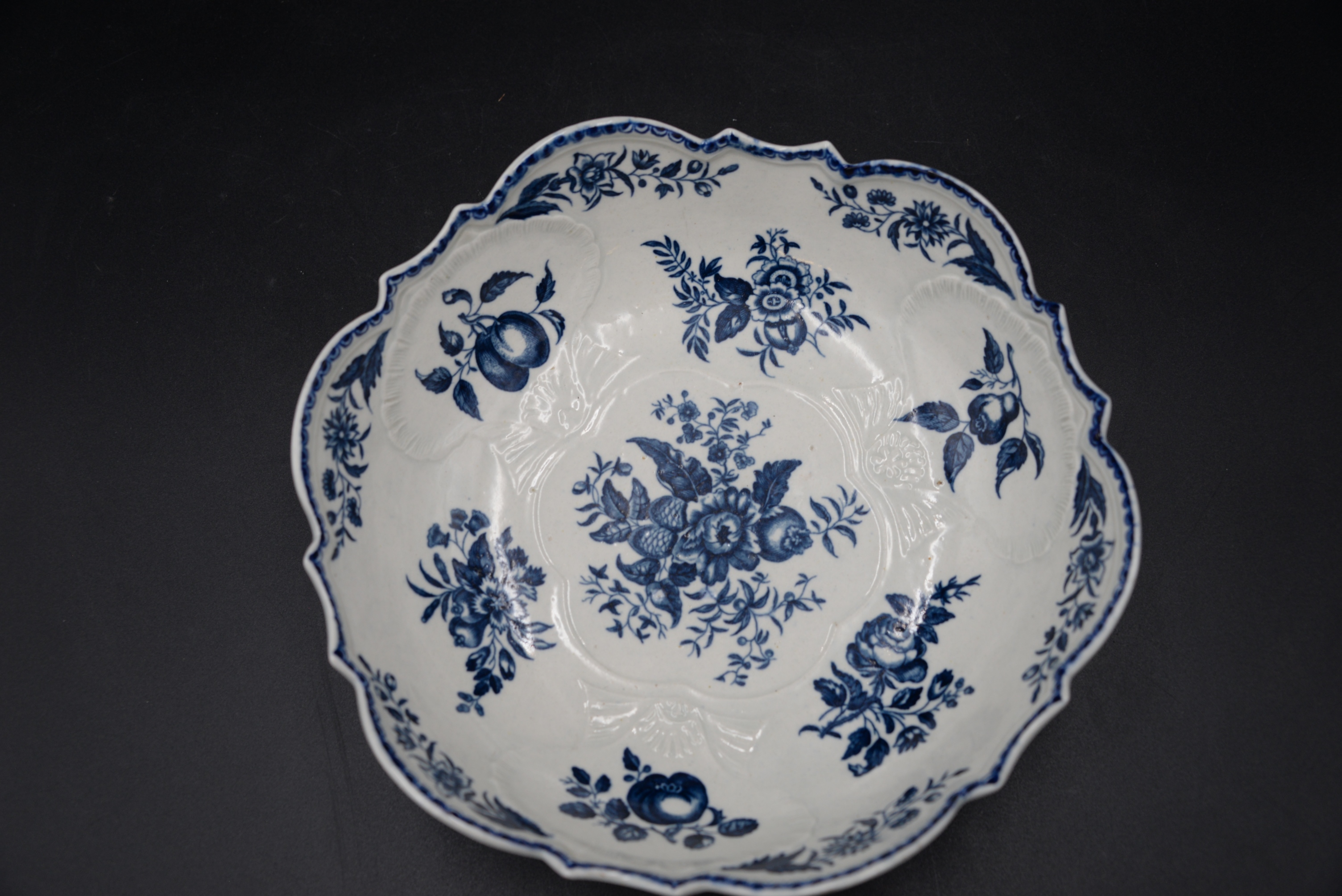 Worcester Blue and White Bowl, having hatched crescent mark, either Worcester or Caughley, moulded with scallop shells and printed in pinecone pattern, the exterior with vegetable and insects within a blue dentil rim, 18th century, height 3 inches, diameter 10 inches.