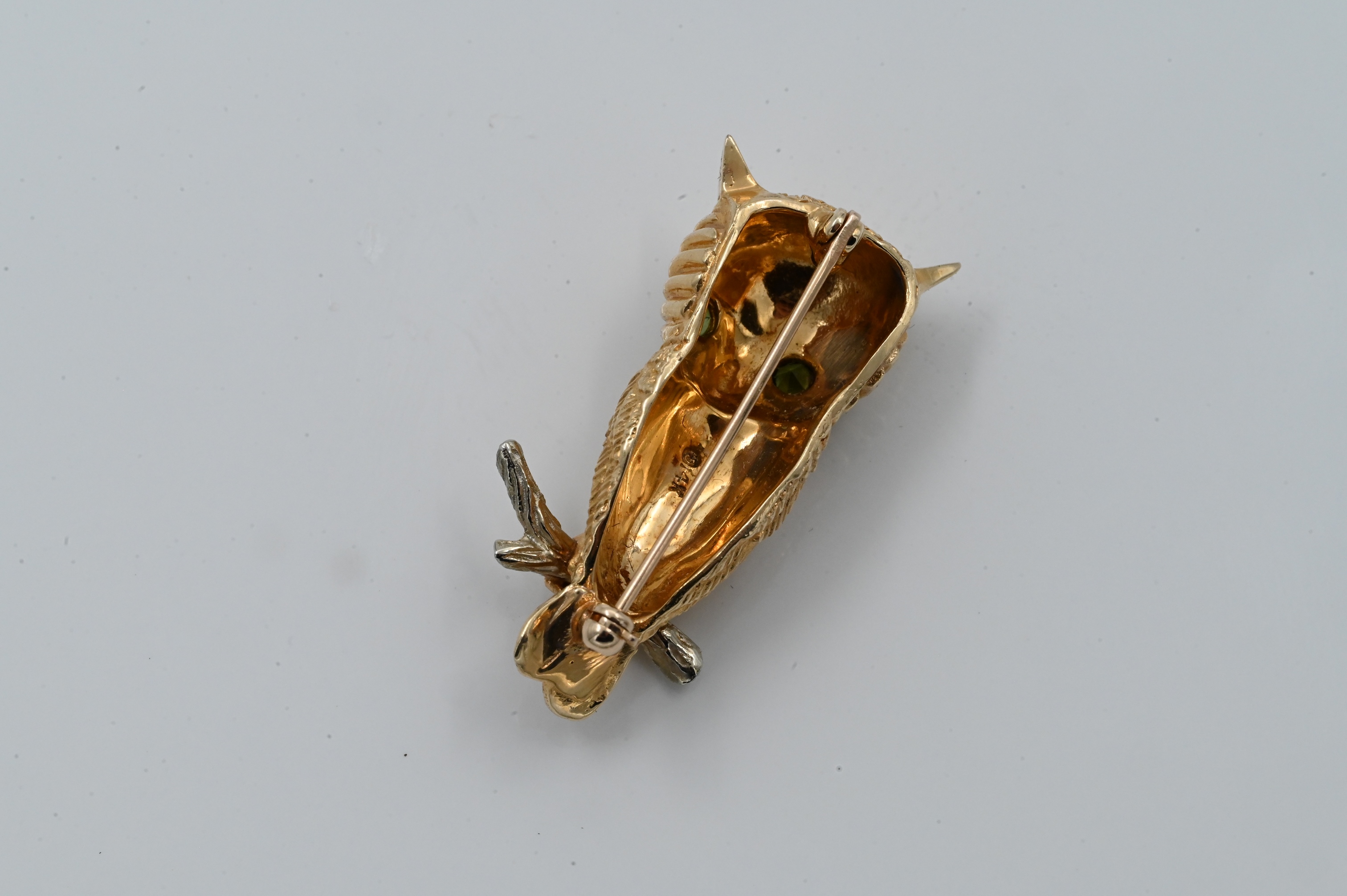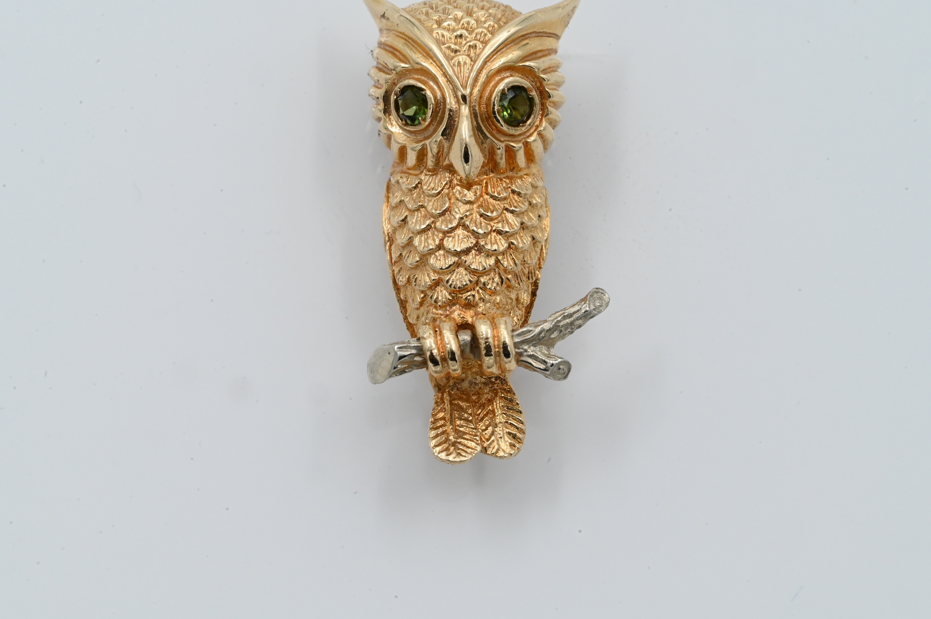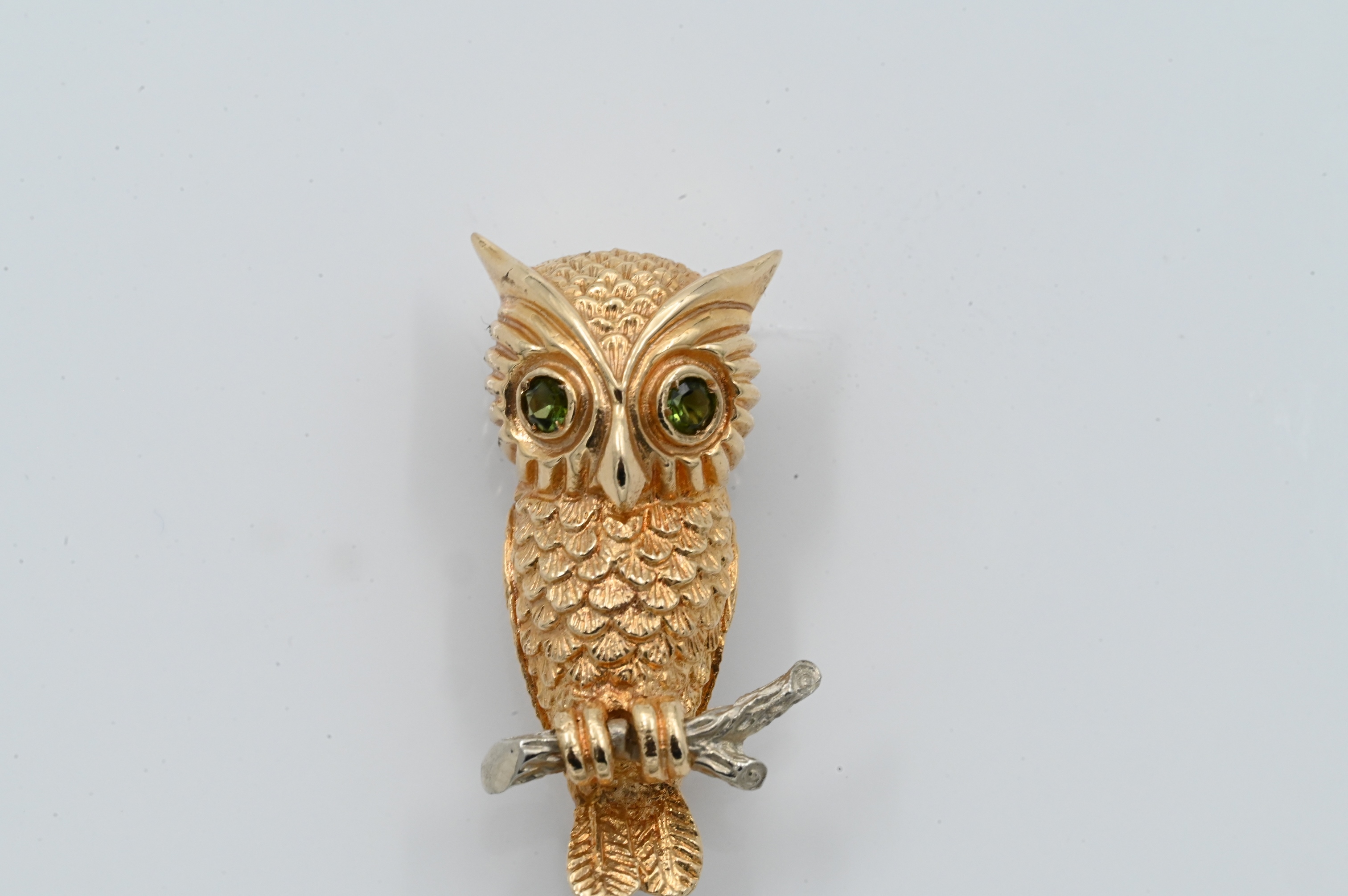 Lot 146: 14K Yellow Gold Owl Brooch having Green Eyes And White Gold Branch