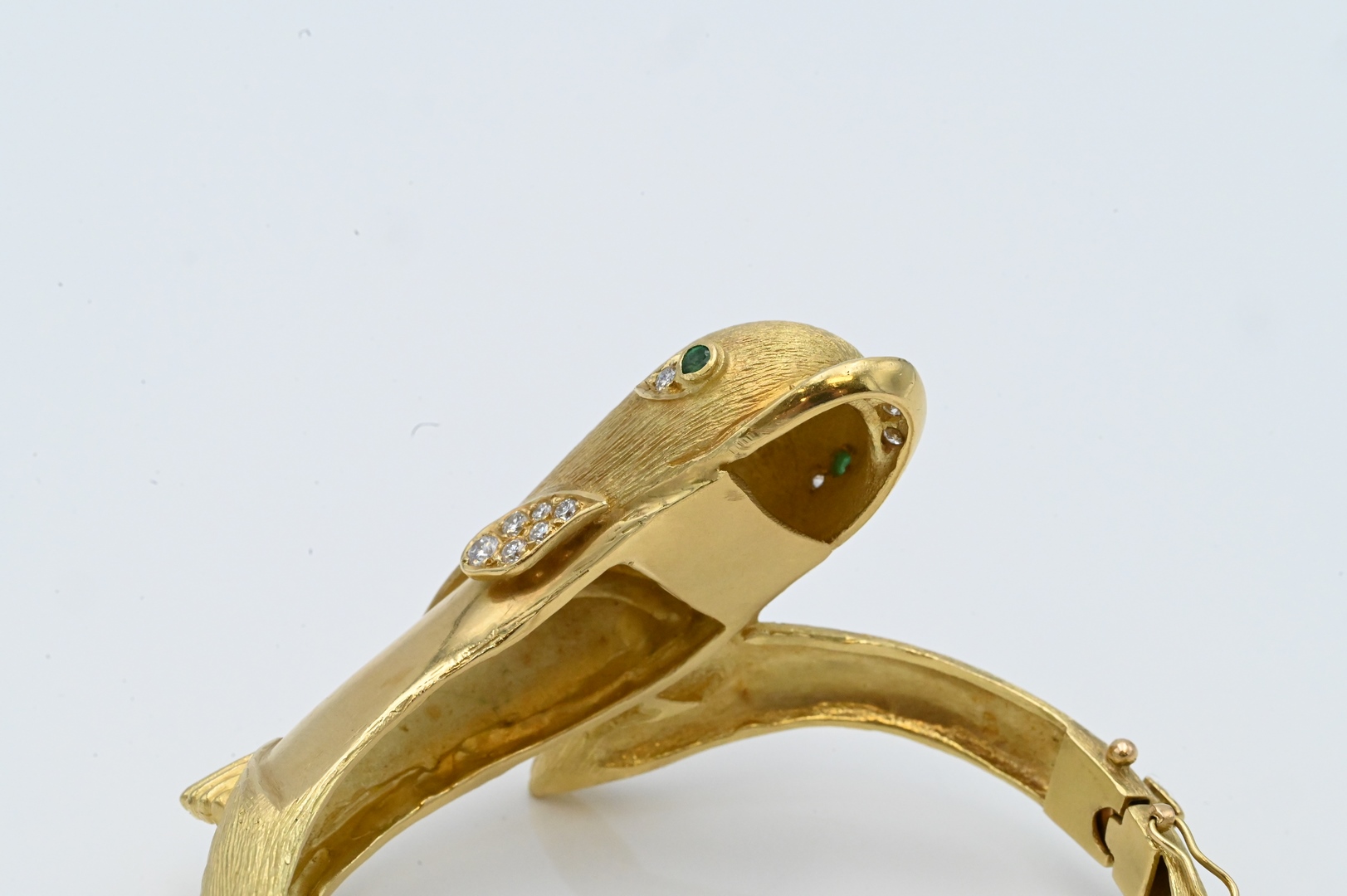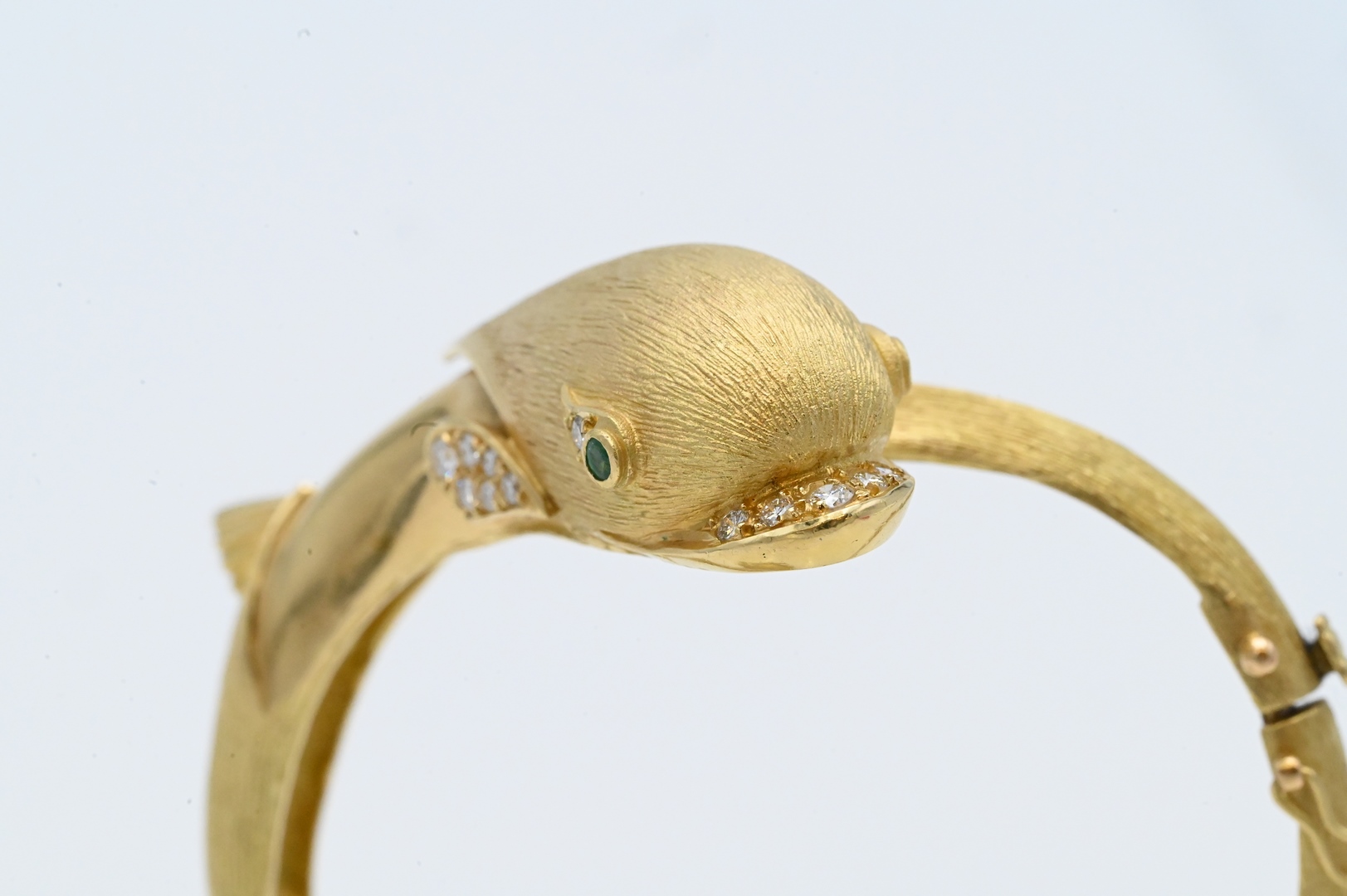 to include a dolphin bangle bracelet along with a matching dolphin ring, each set with diamond fins, snout, and green eyes