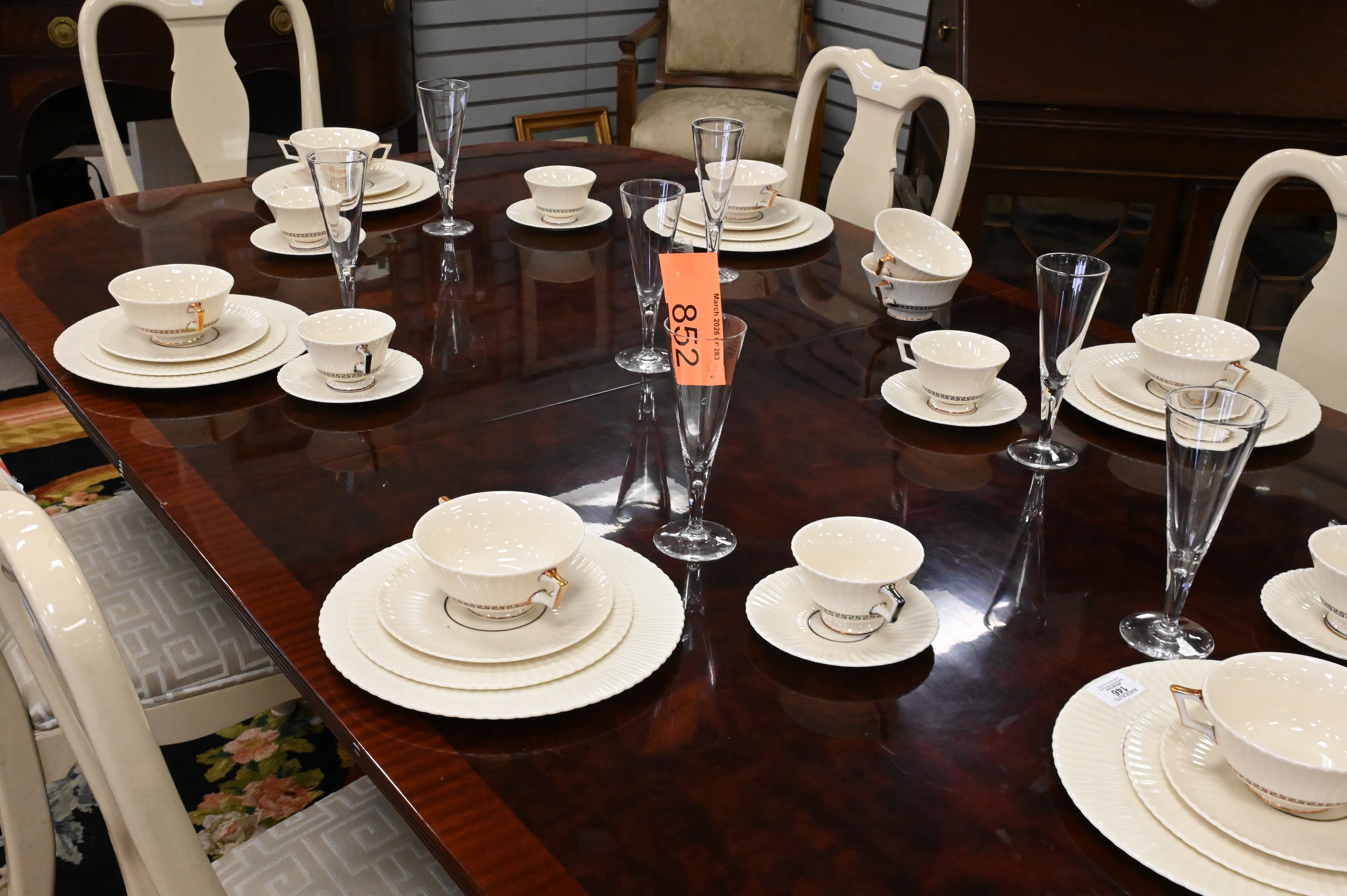 to include 12 dinner plates, 12 salad plates, 12 bread and butter plates, 10 cream soups, 12 soup underplates, 6 teacups, 12 saucers, 1 creamer and 1 sugar