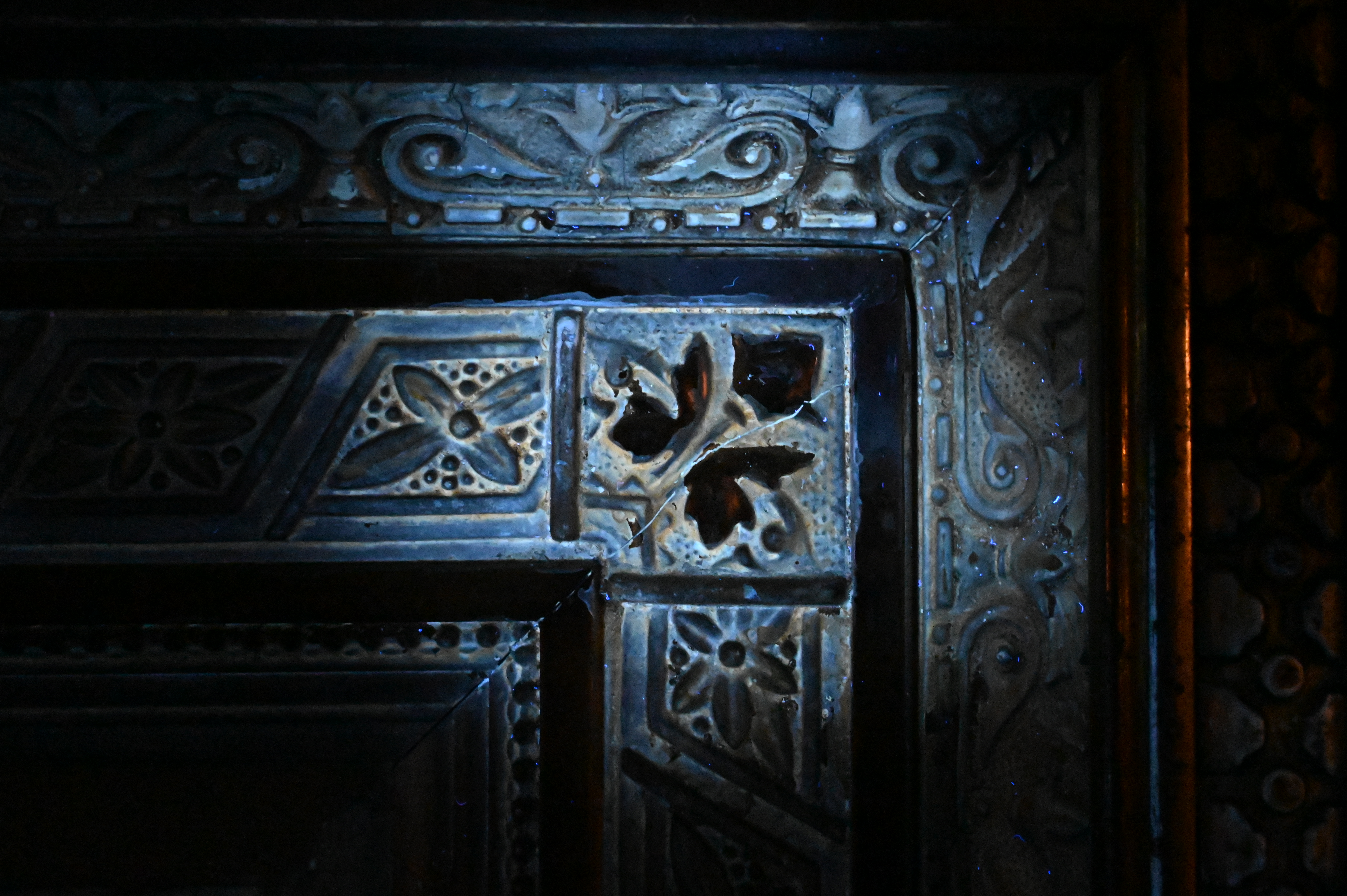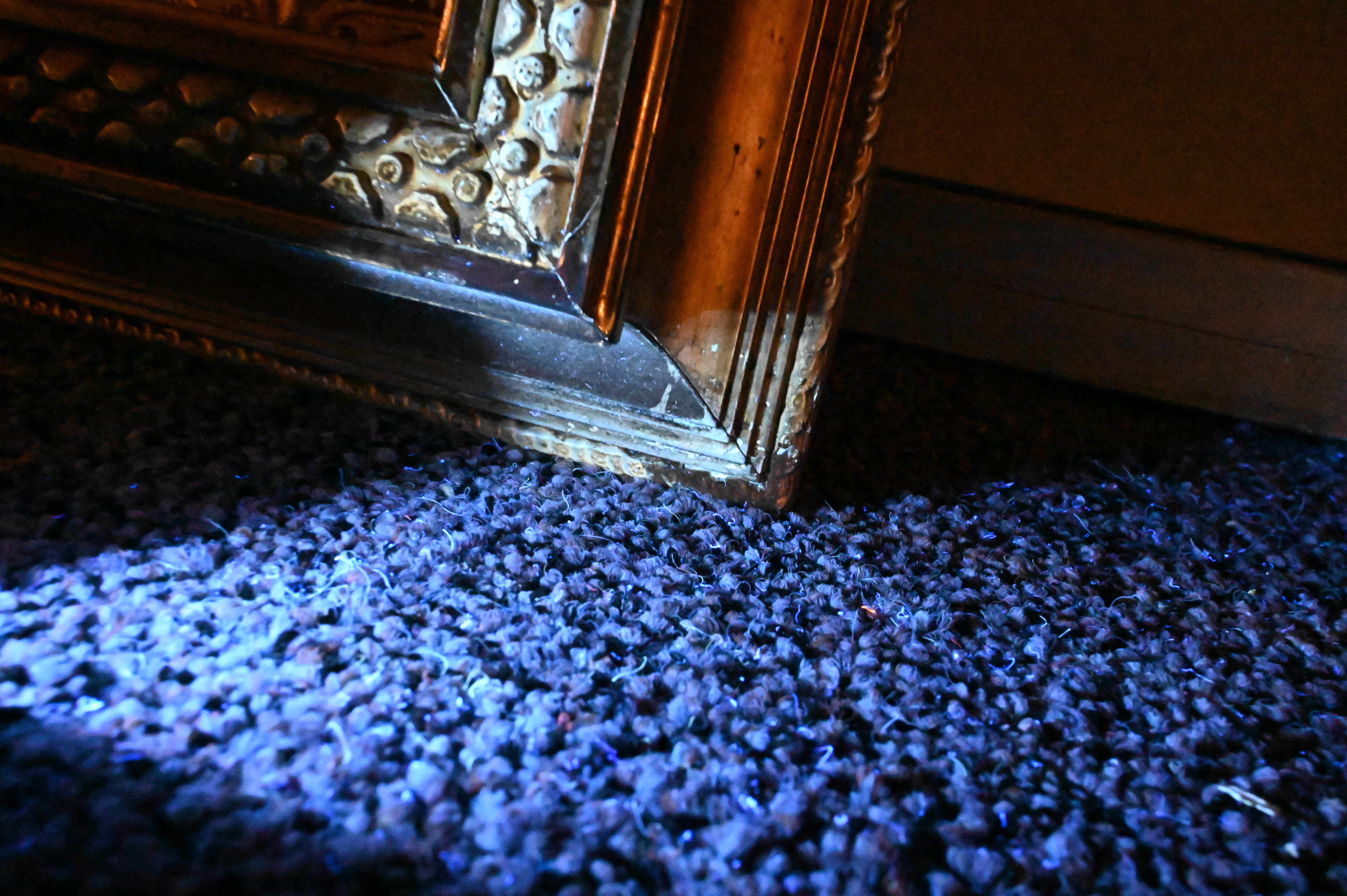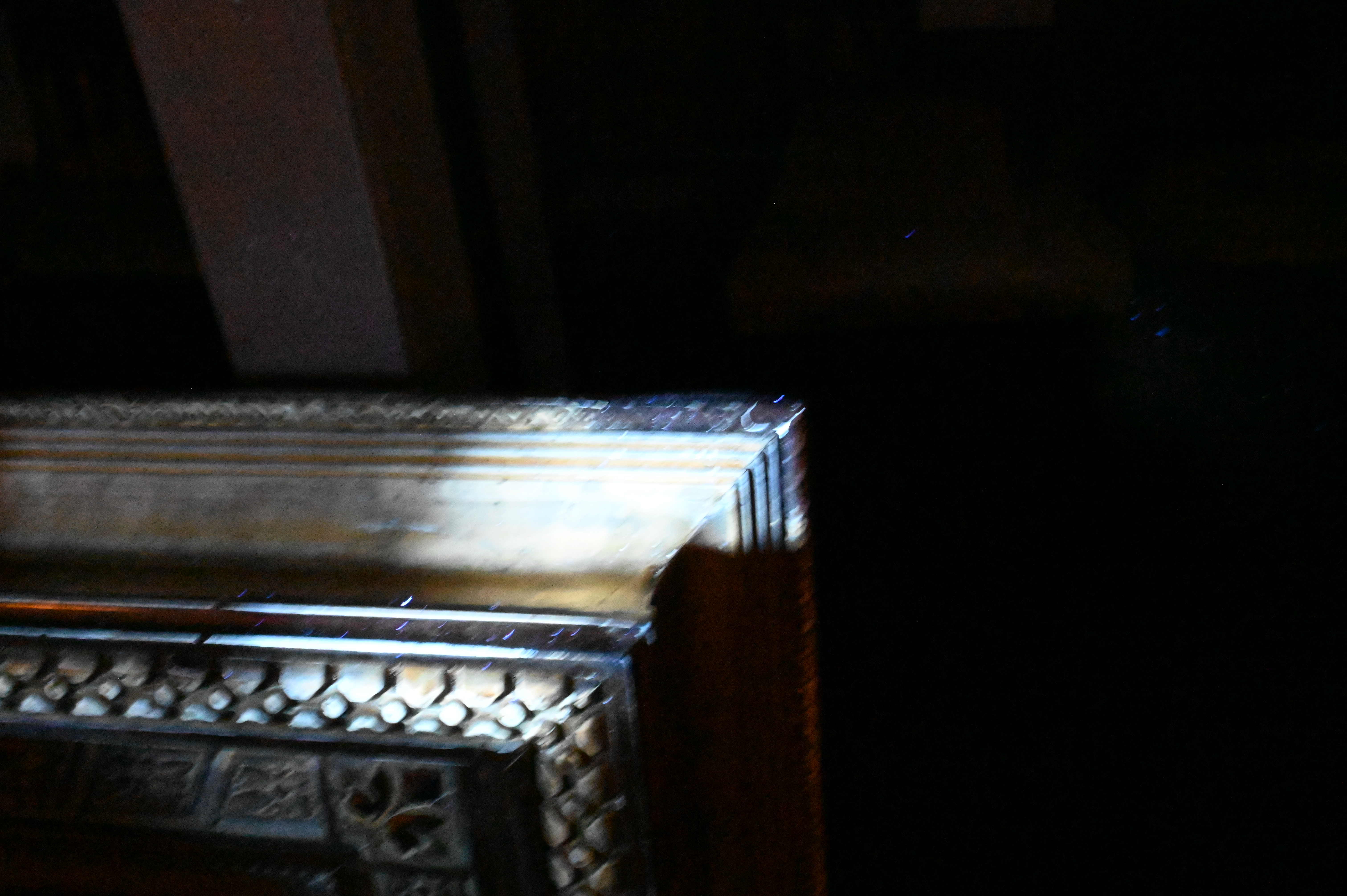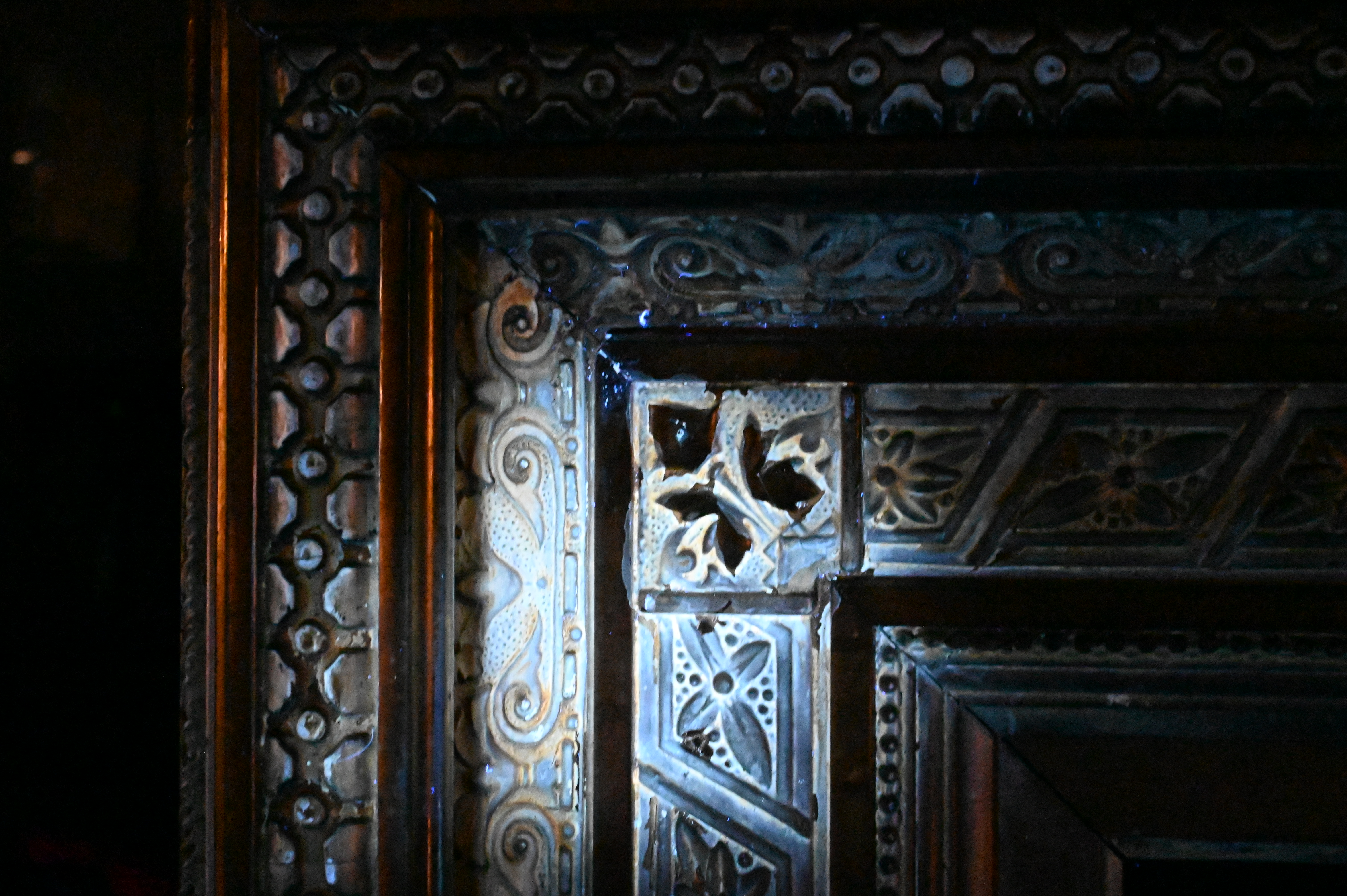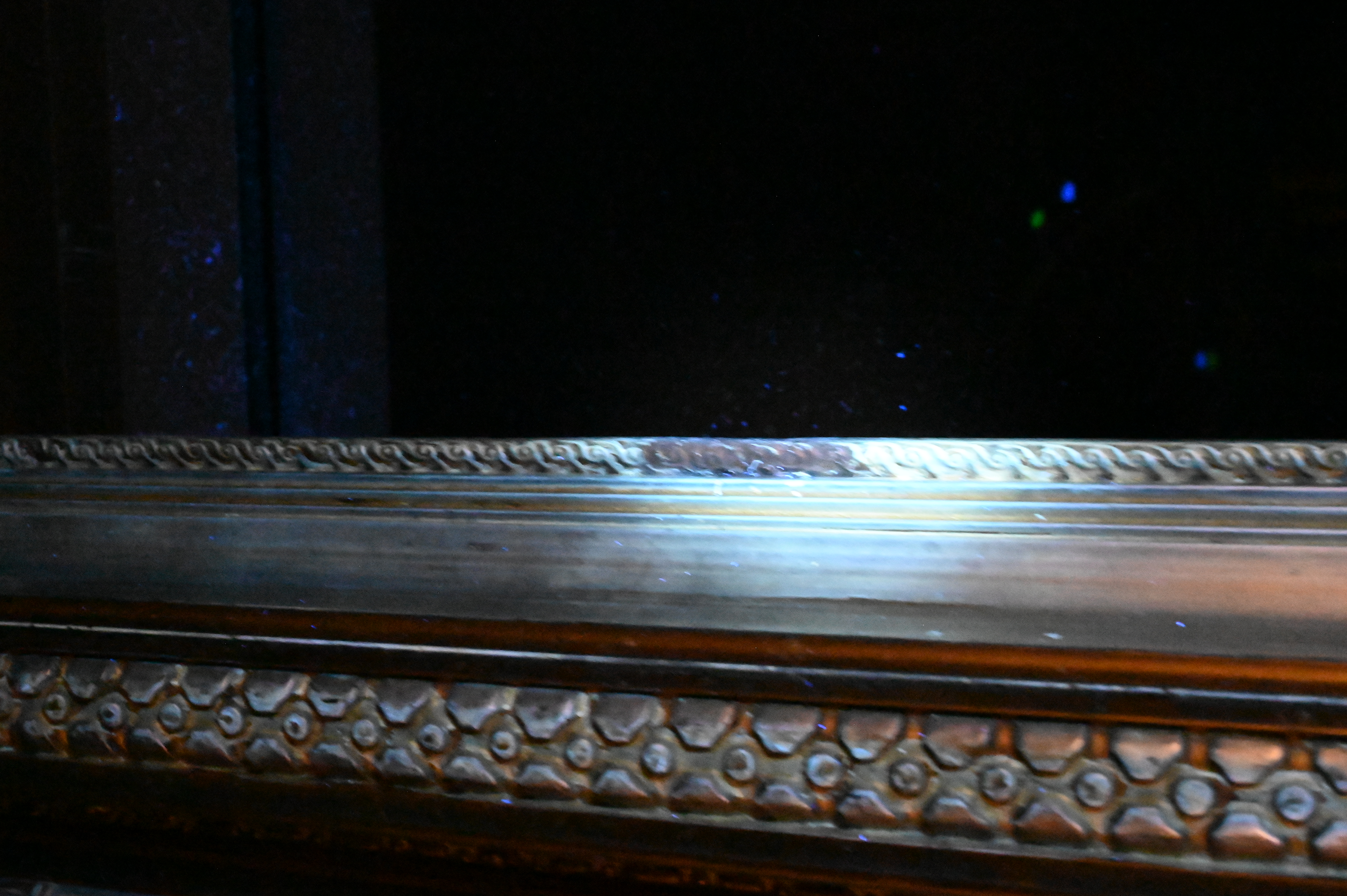 a grand American mirror frame of the late 19th century, featuring continuous polymorphic ornamentation in high relief across paneled and running moldings, the frame exhibits richly detailed neoclassical motifs typical of the Gilded Age, finished in gilt composition with a deep architectural profile