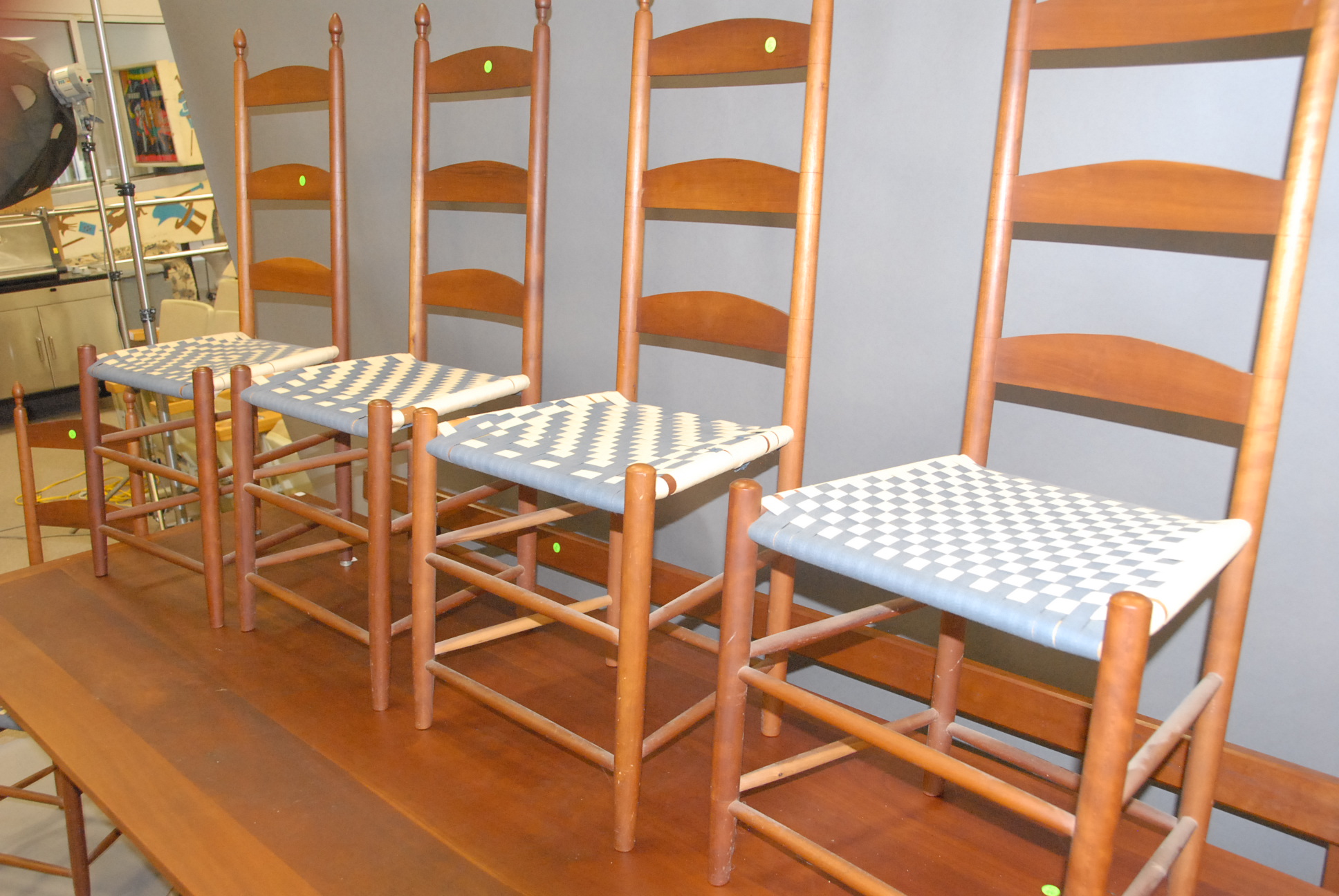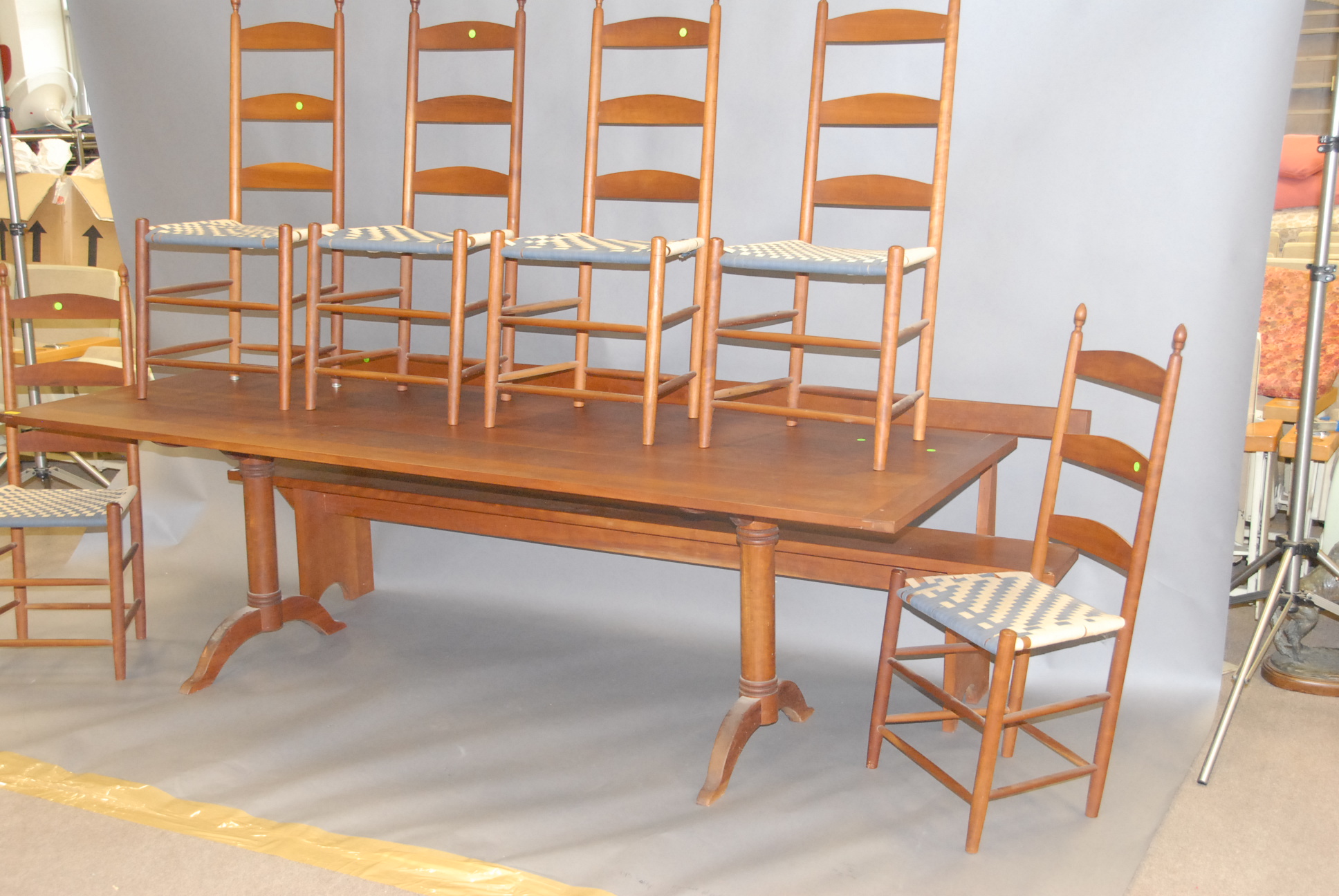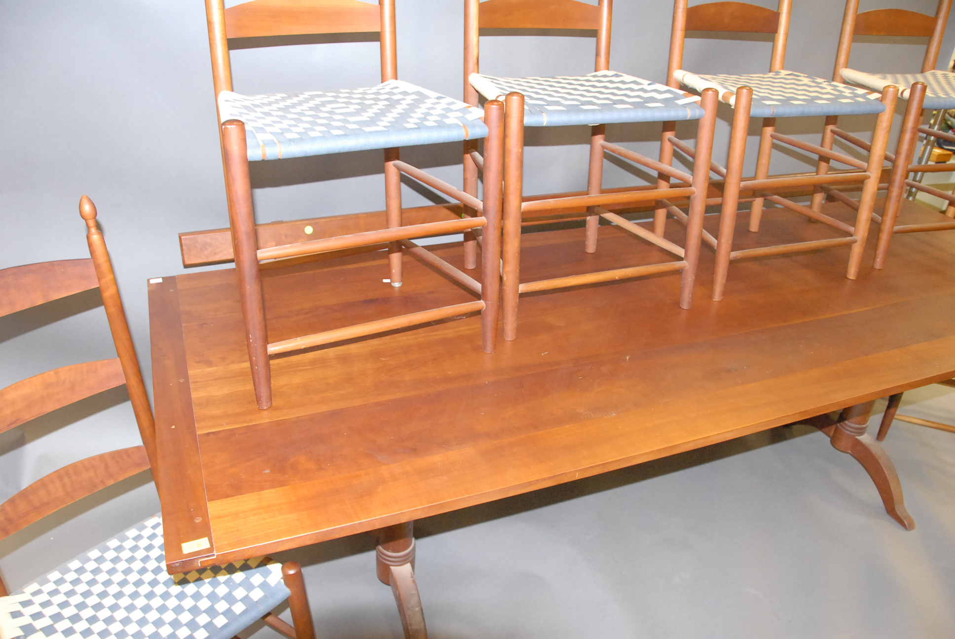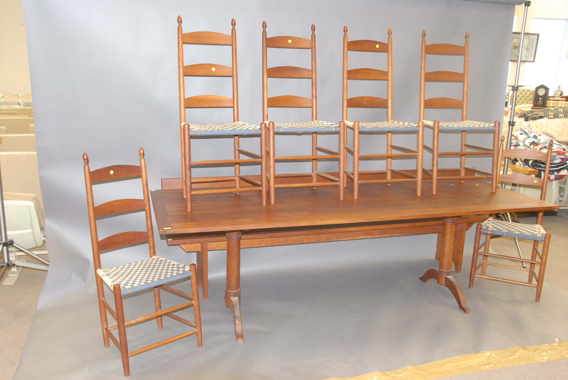 Custom Cabinet Maker custom made cherry Shaker style dining set to include six Shaker style ladderback chairs, Shaker style bench, and large table.