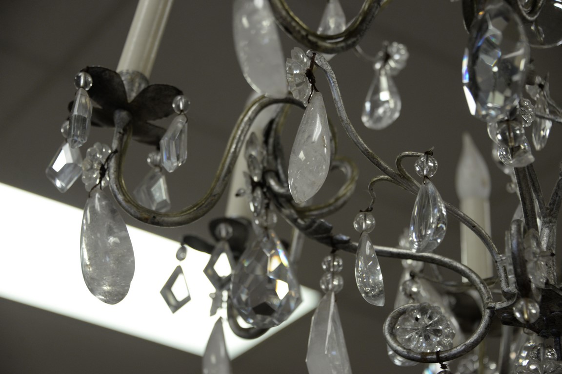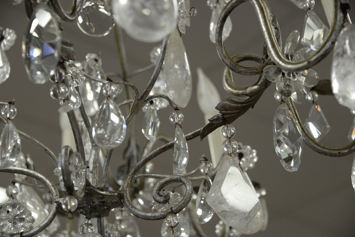 Lot 146: Eight light chandelier having rock crystal and crystal prisms. ht. 24in., dia. 30in.