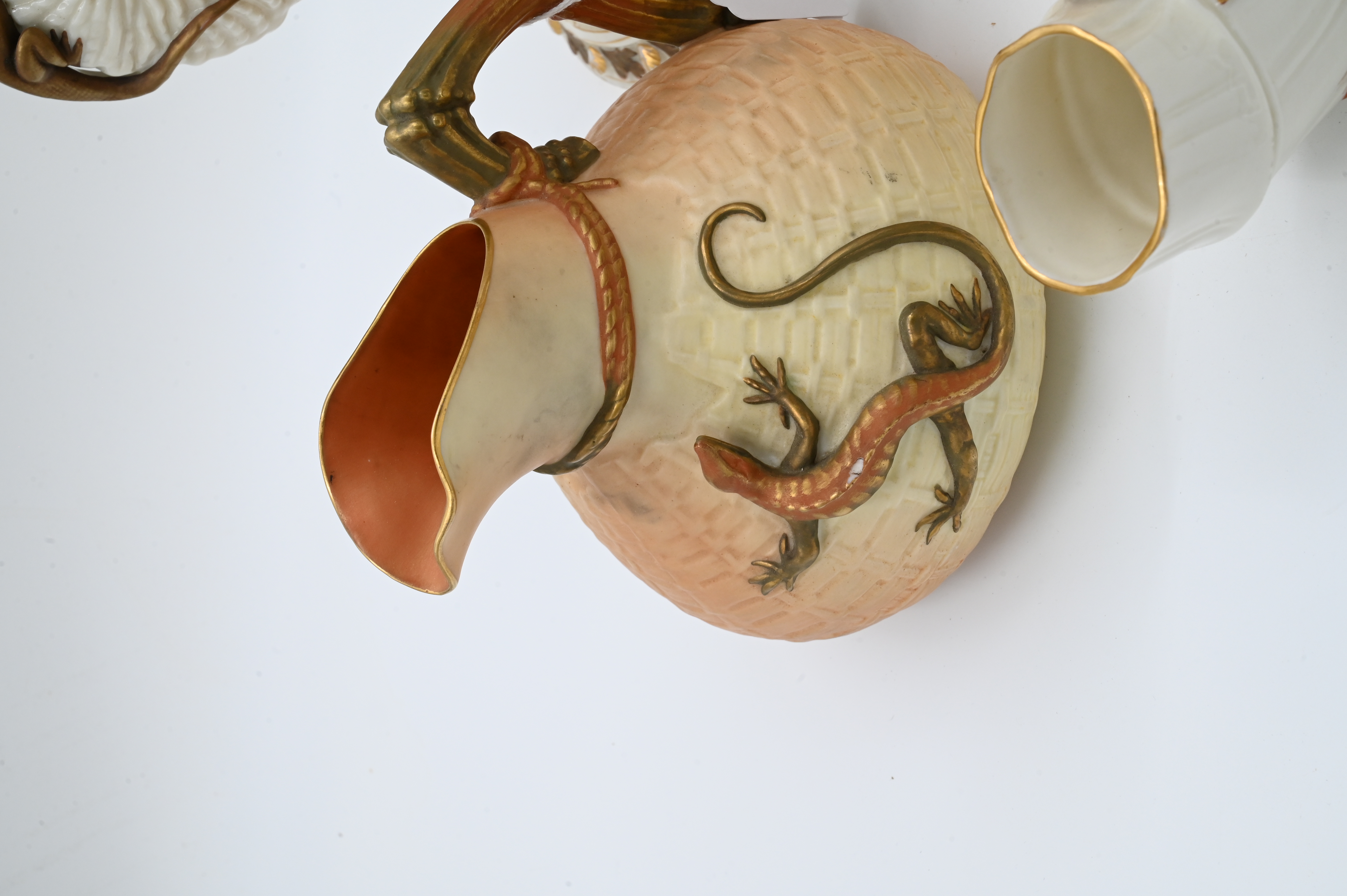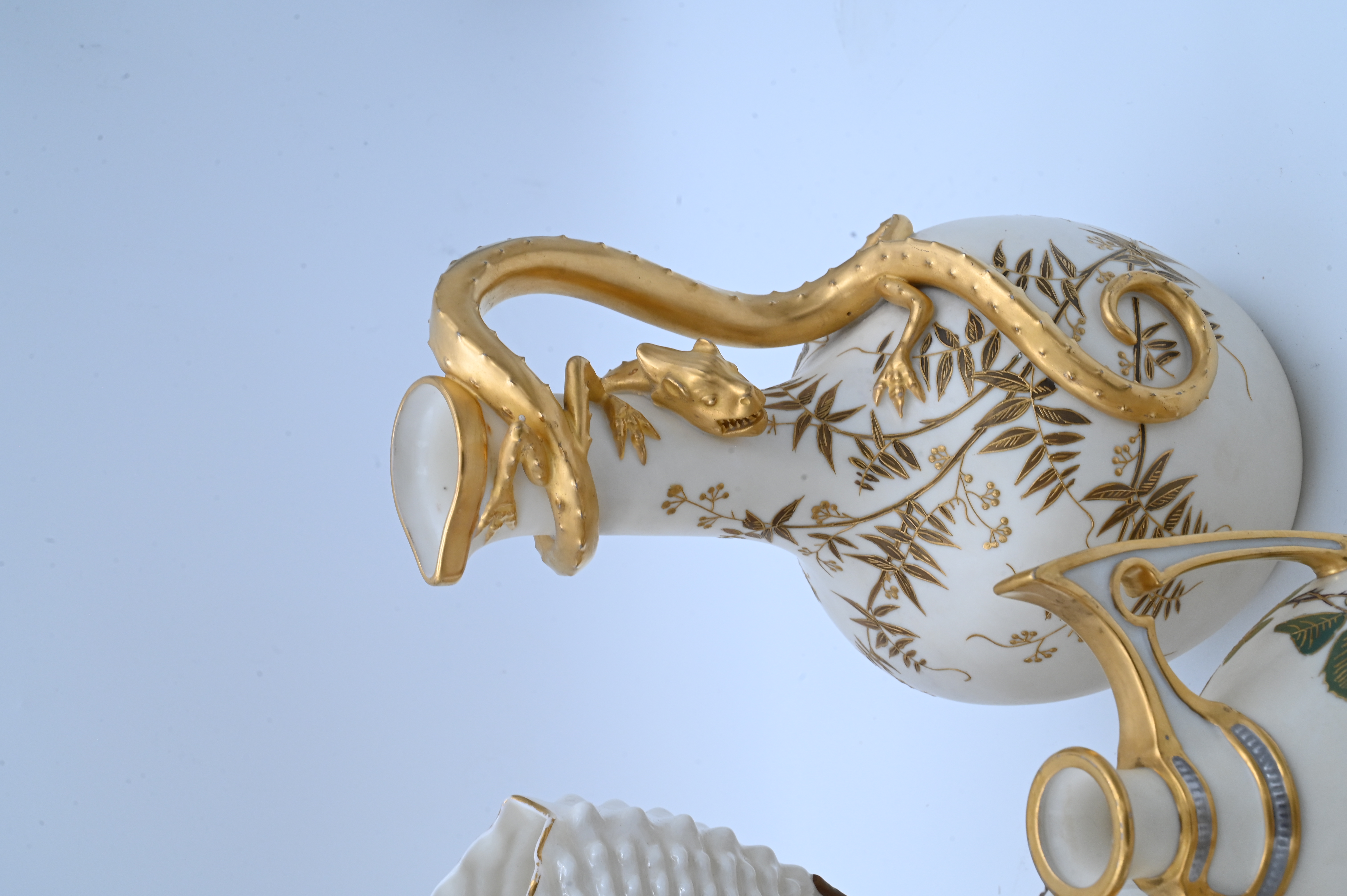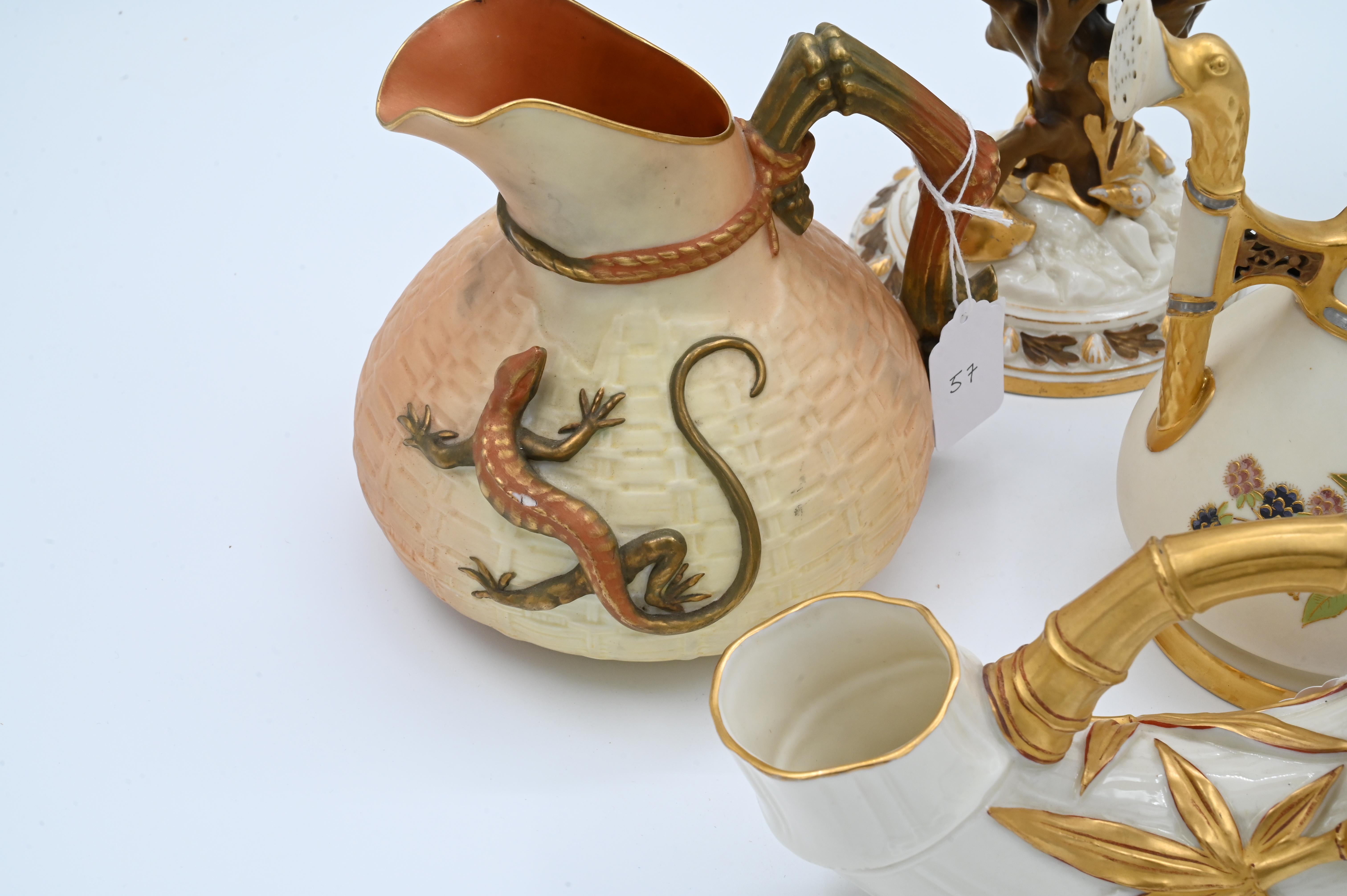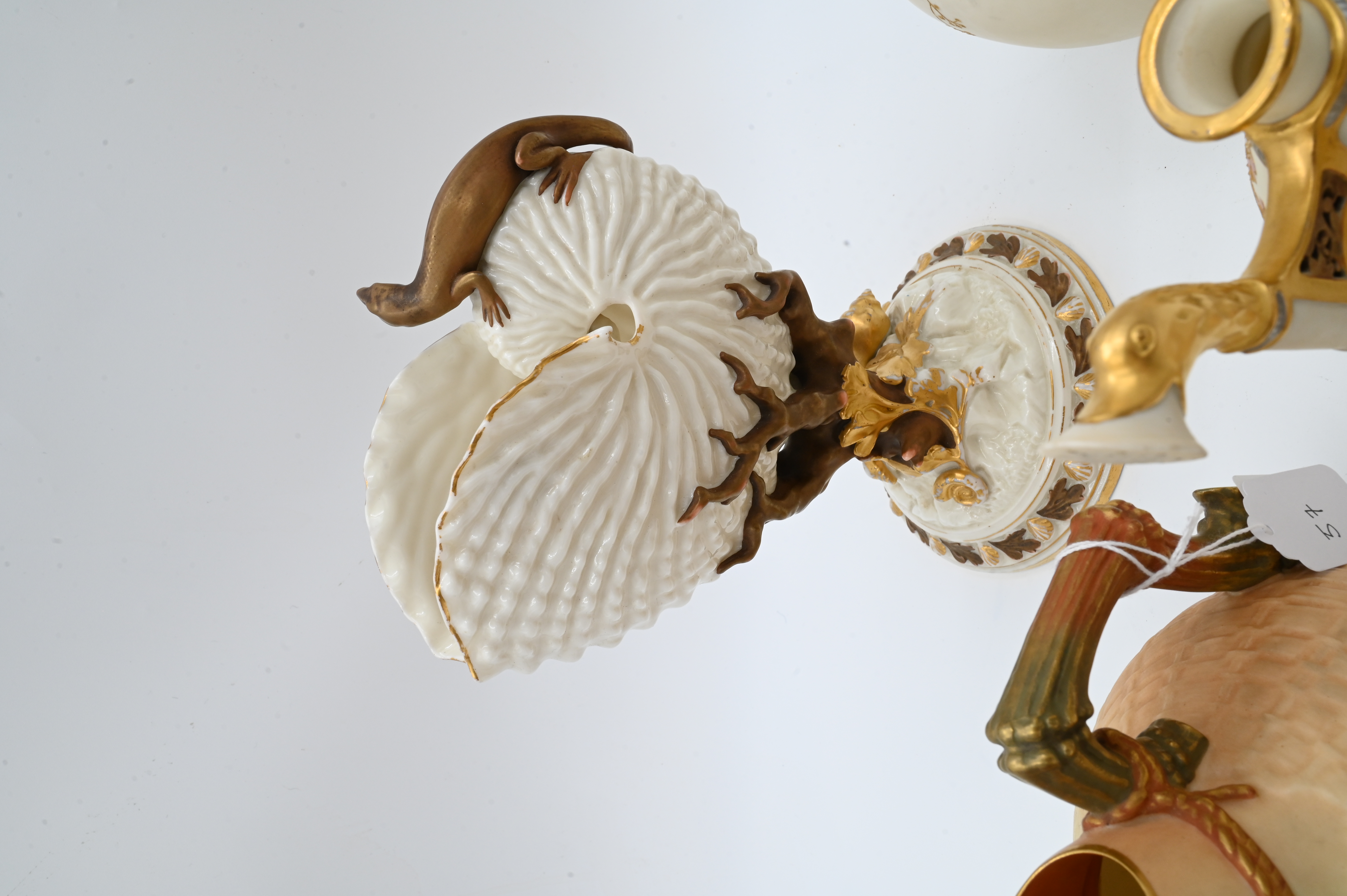 dragon handle vase/pitcher in Satsuma style having green mark, lizard pitcher having bamboo form handle and green mark, double mouthed bamboo vase having purple mark on verso, bird form teapot or water pitcher having green mark, and nautilus shell vase having gilt lizard crouching on shell supported by branches and green mark