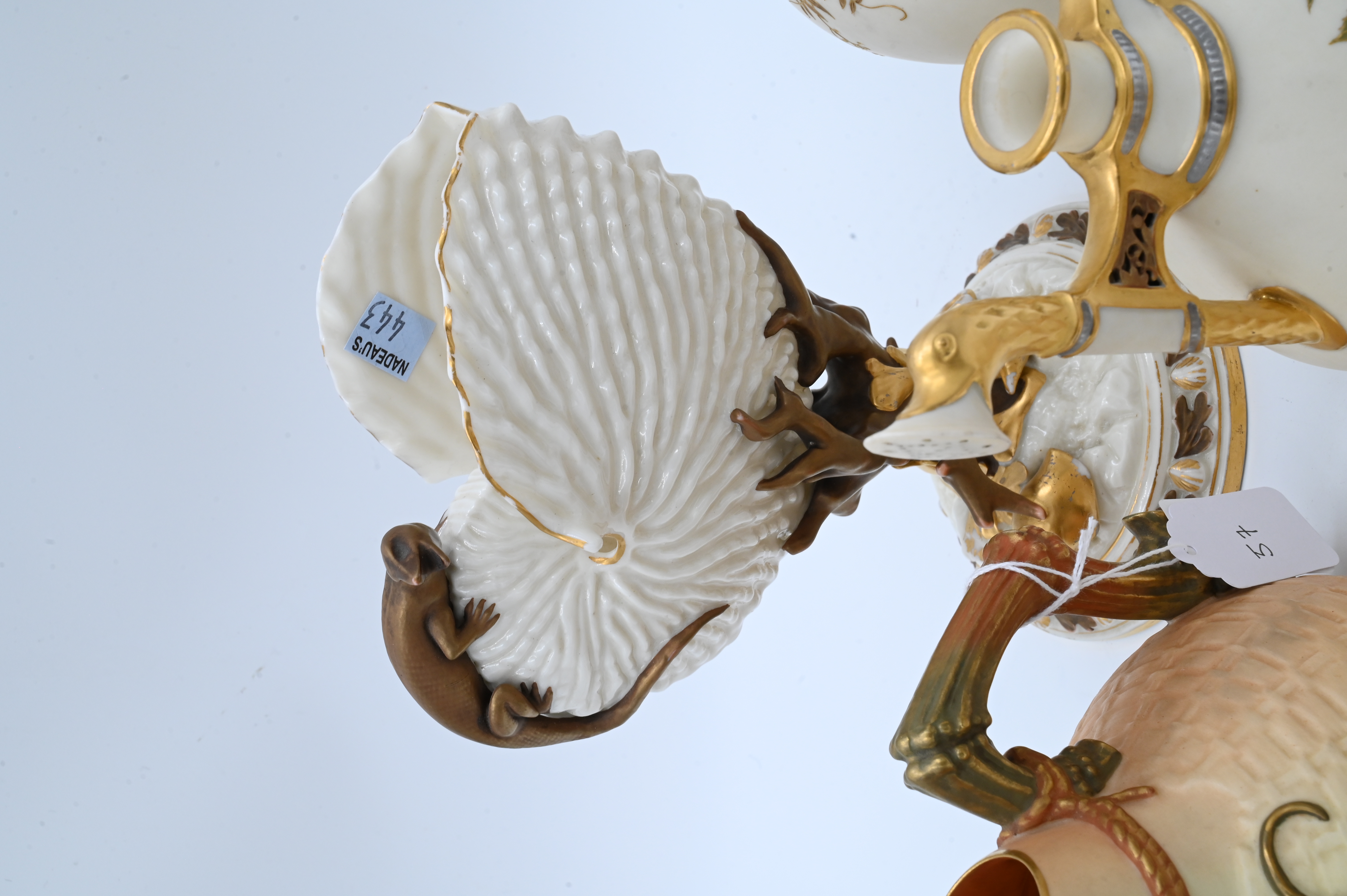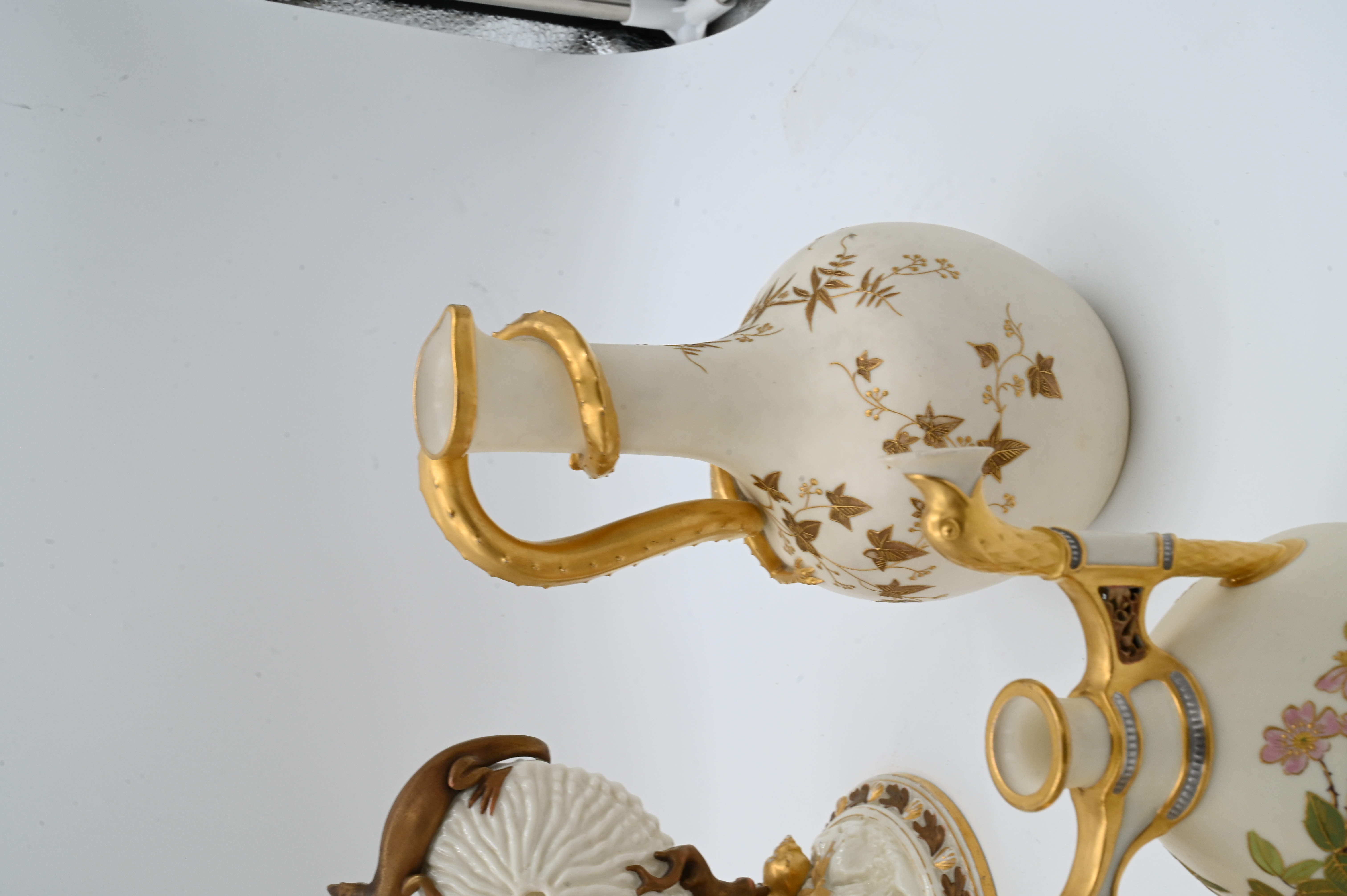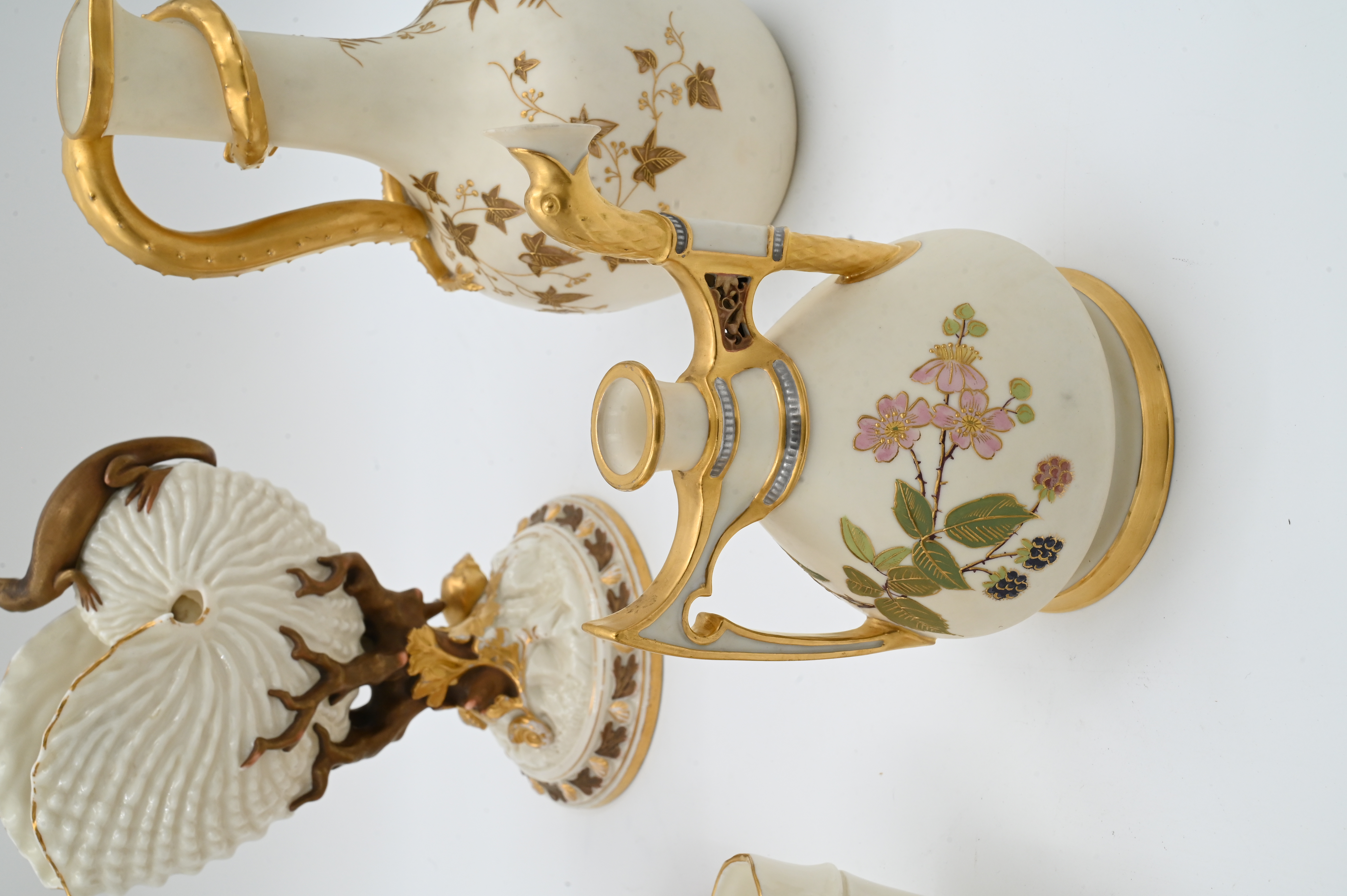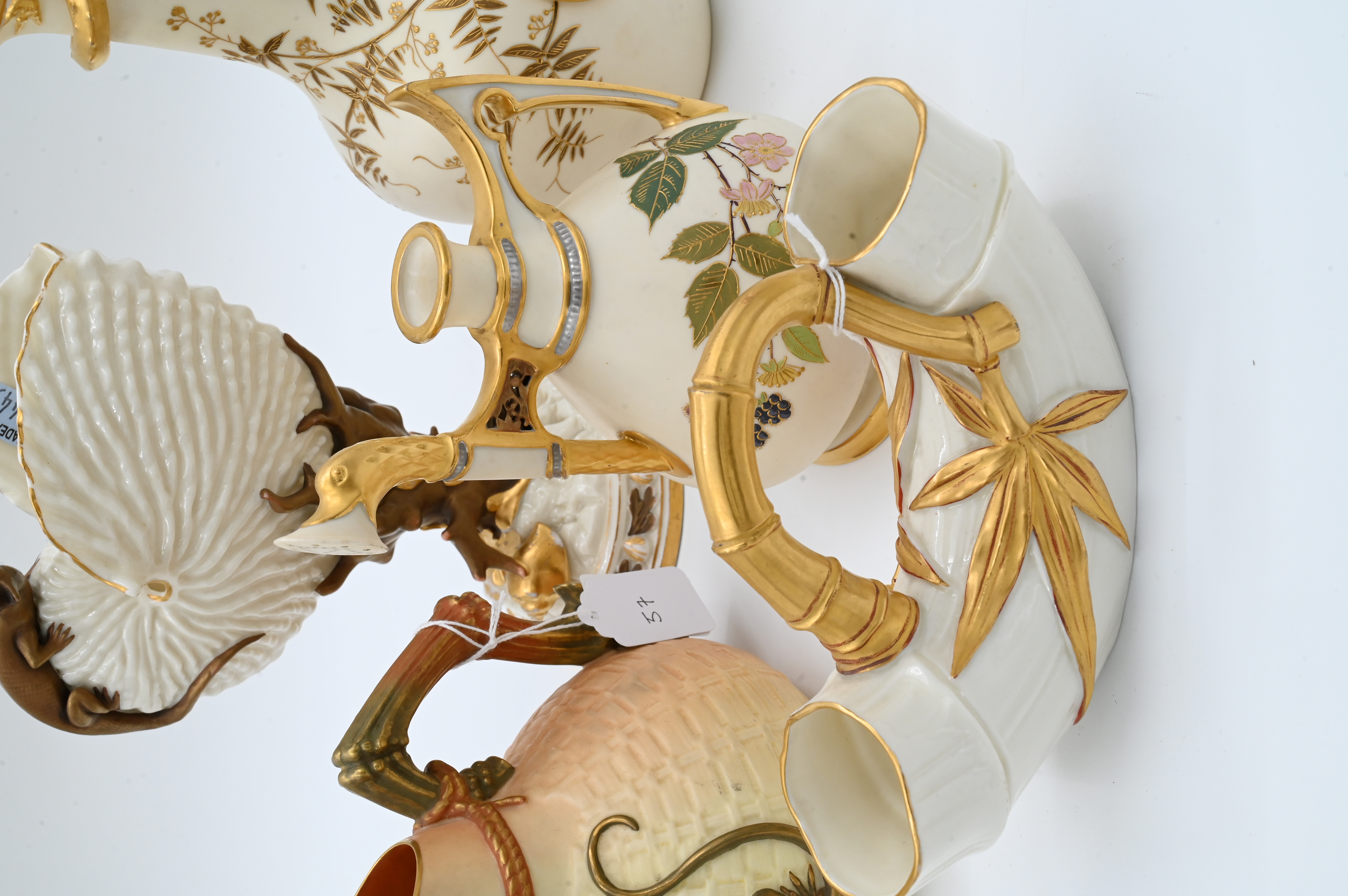dragon handle vase/pitcher in Satsuma style having green mark, lizard pitcher having bamboo form handle and green mark, double mouthed bamboo vase having purple mark on verso, bird form teapot or water pitcher having green mark, and nautilus shell vase having gilt lizard crouching on shell supported by branches and green mark