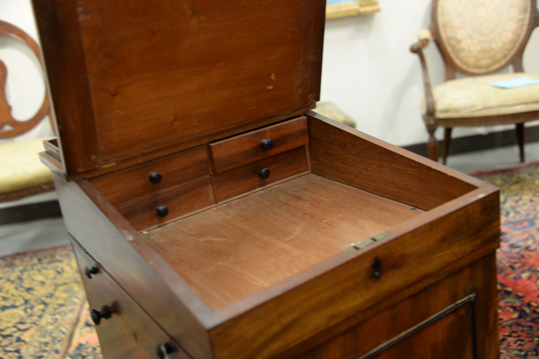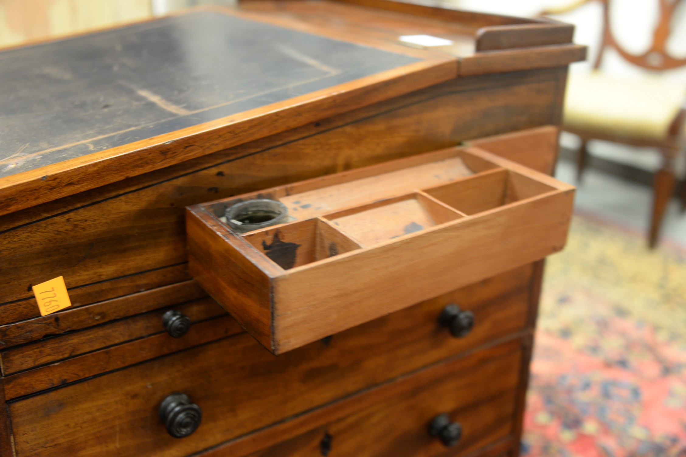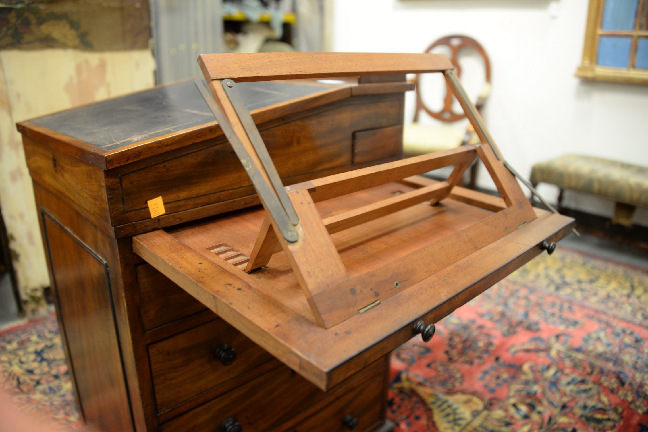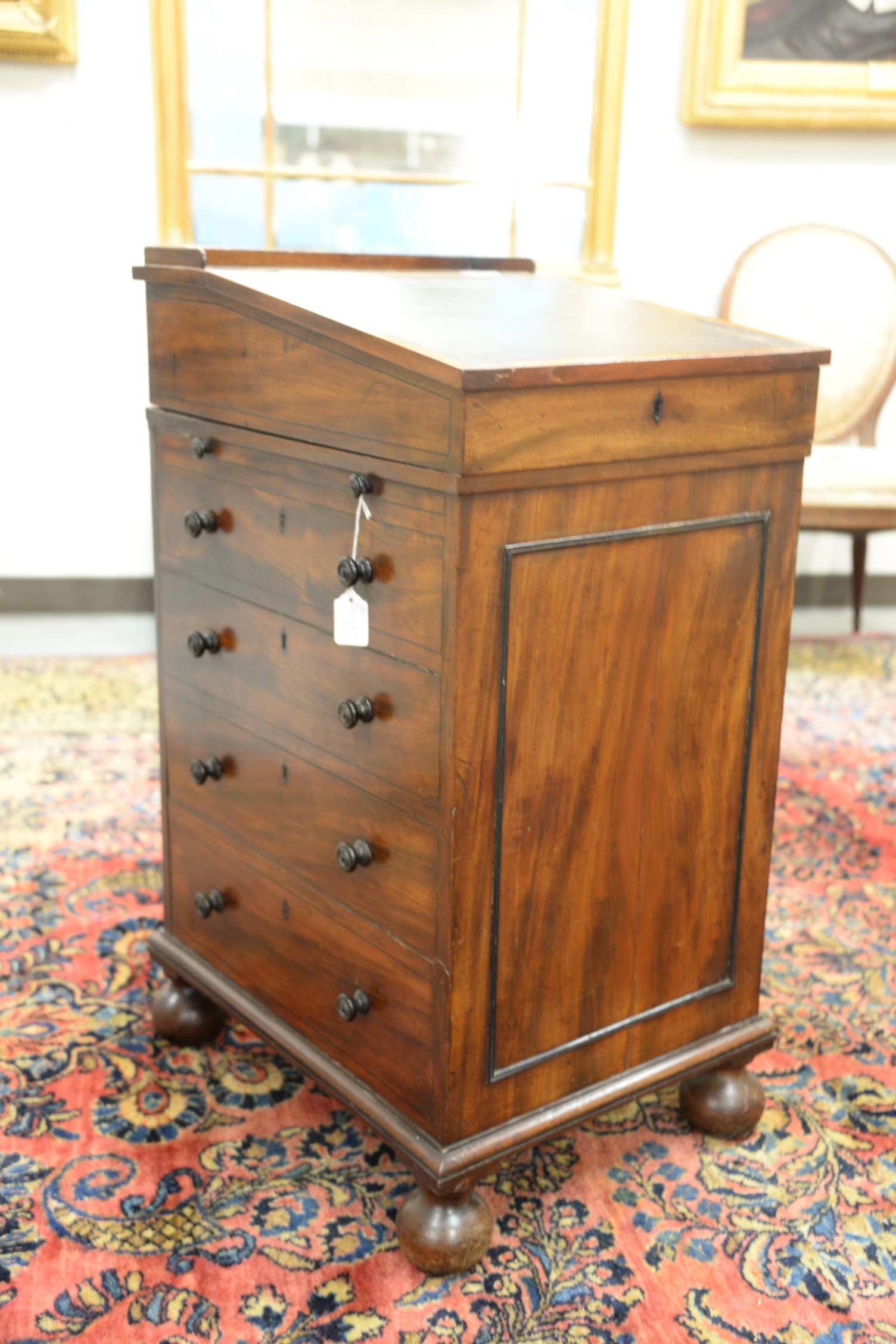 Lot 146: George III diminutive mahogany Davenport desk set on ball feet, 19th century. ht. 32 in. case wd. 15 in. dp. 19 1/2 in. Pr…