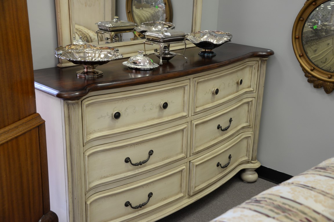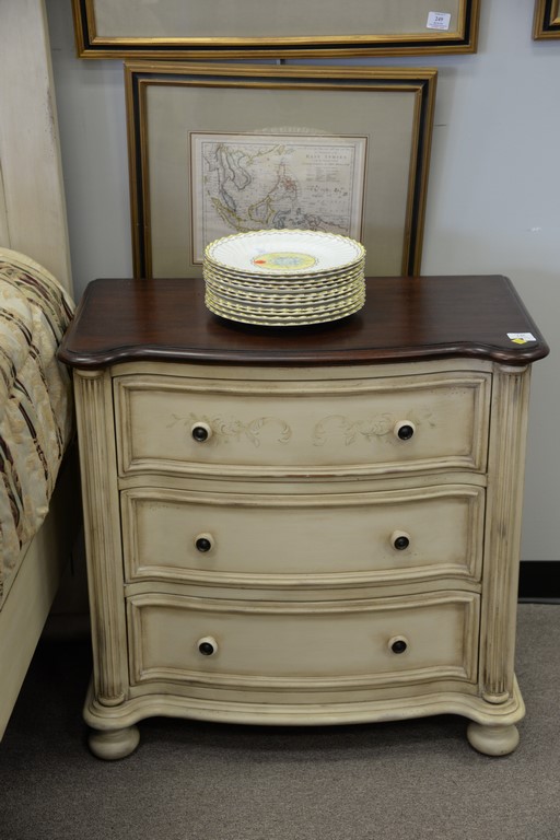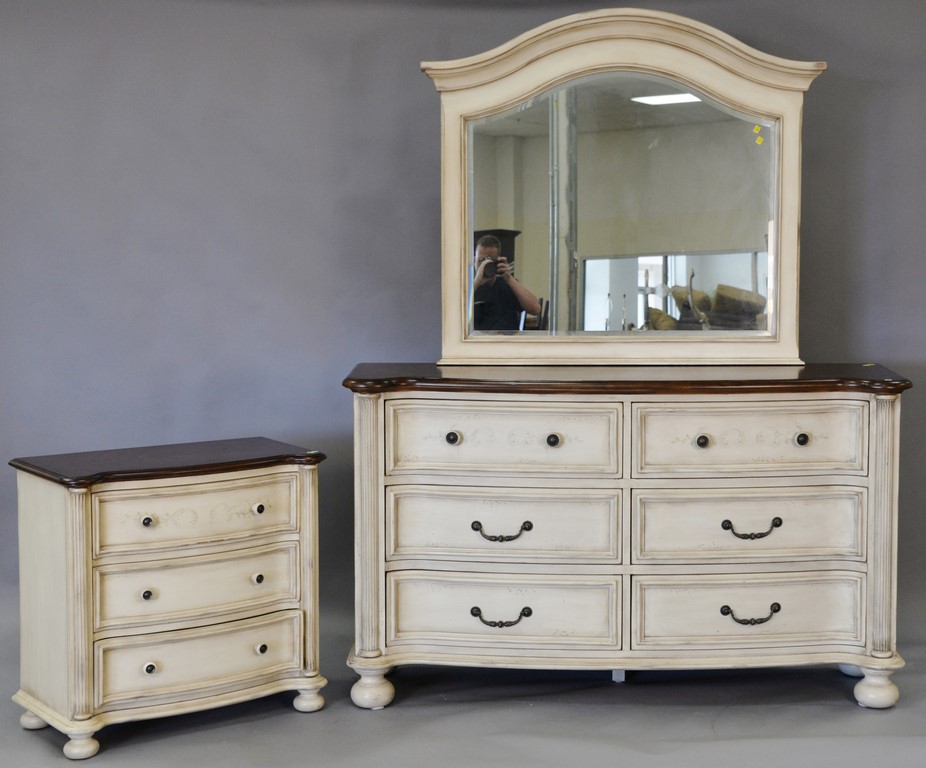 Lot 146: Hooker four piece bedroom set with queen bed ht. 56in., chest ht. 82in., wd. 66in., mirror, and night table.