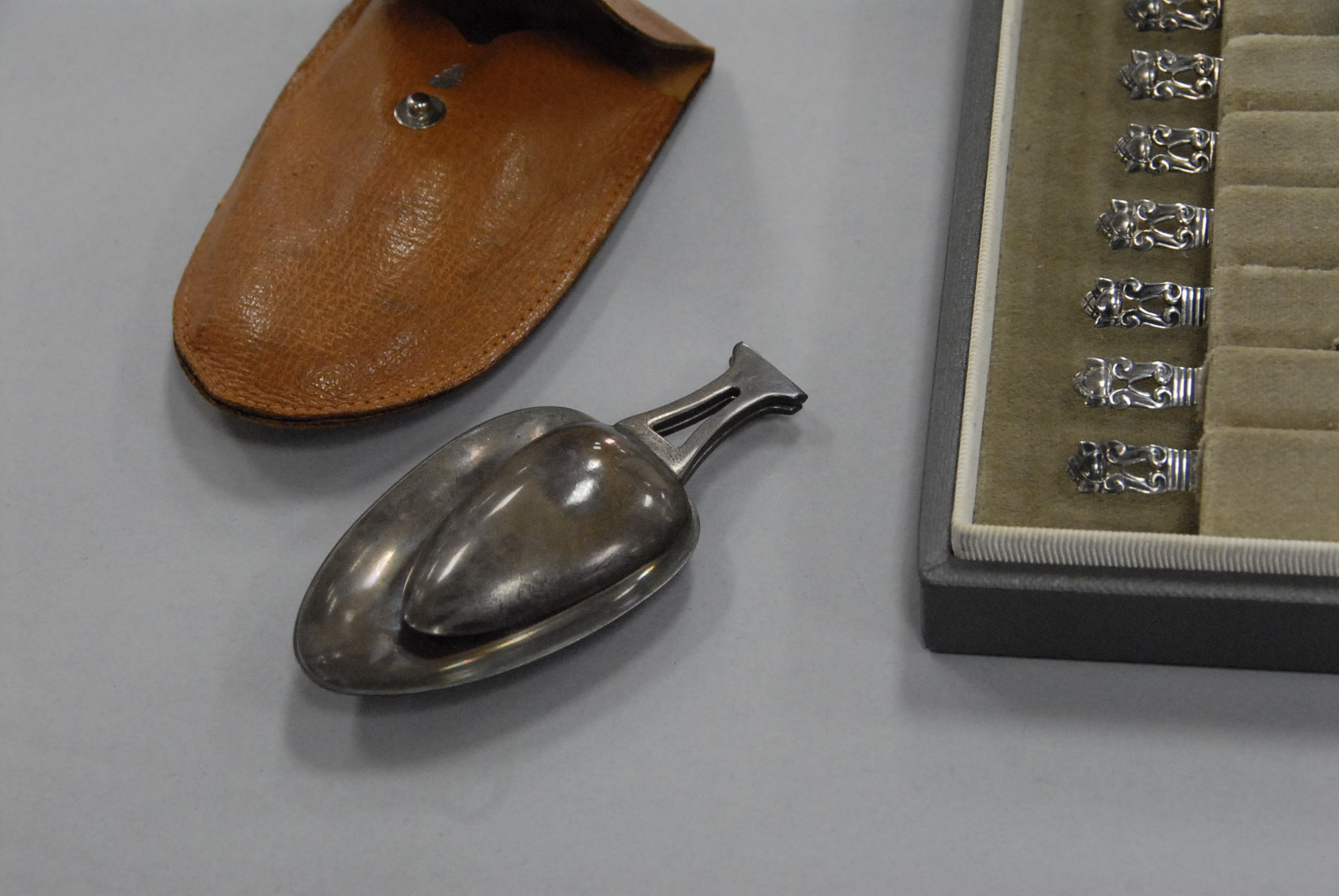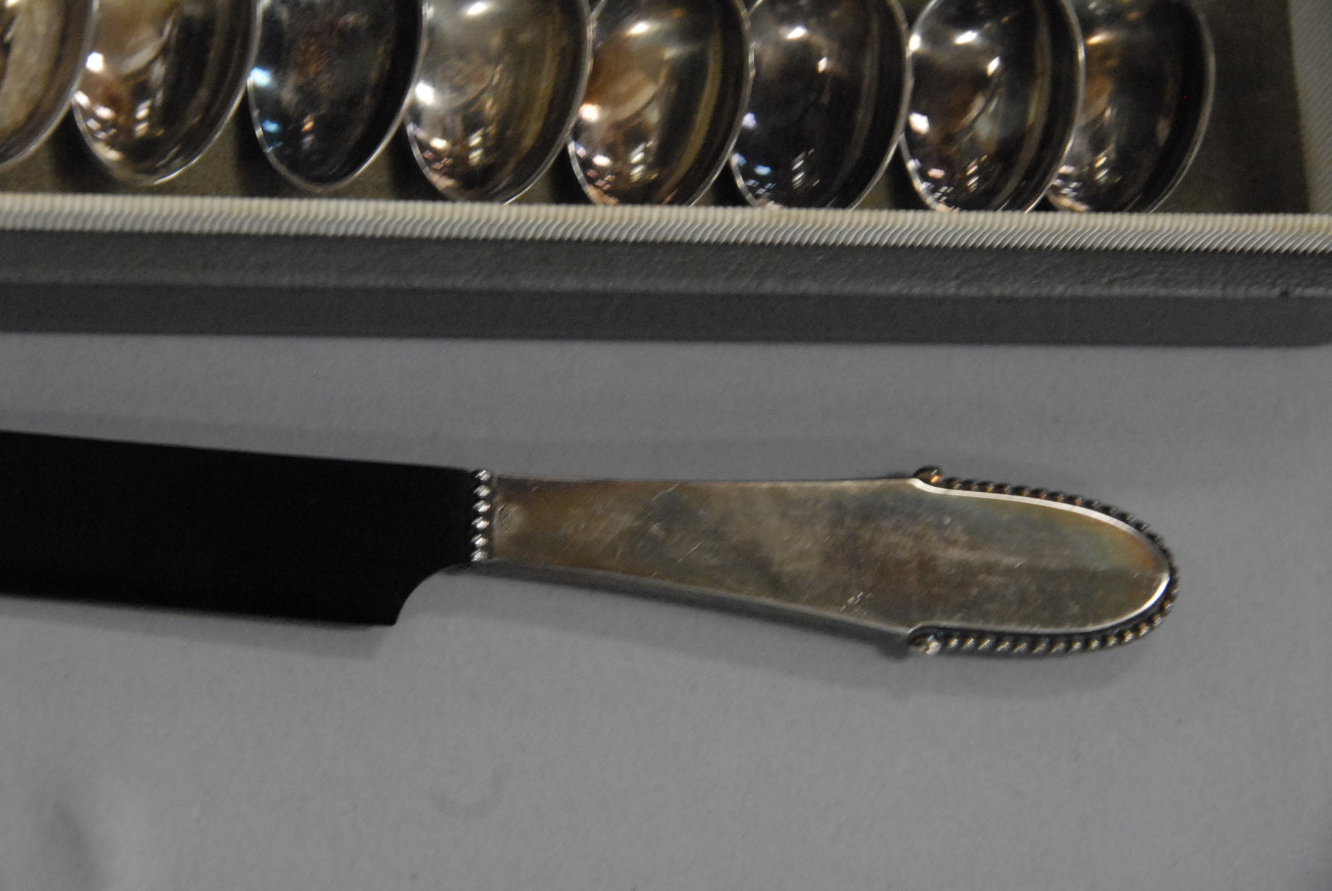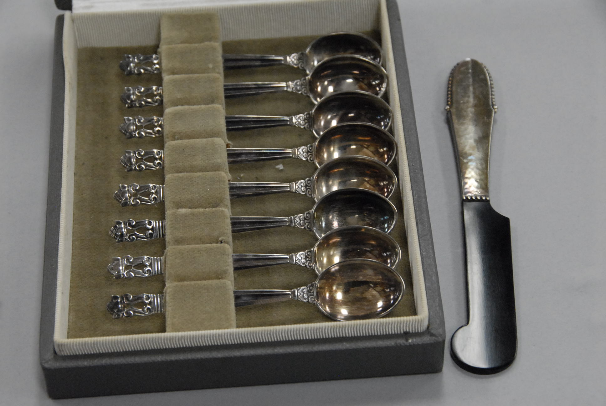 Lot of silver including 8 Georg Jensen demitase spoons, Georg Jensen knife with a silver handle plus a silver travel spoon in a leather case
