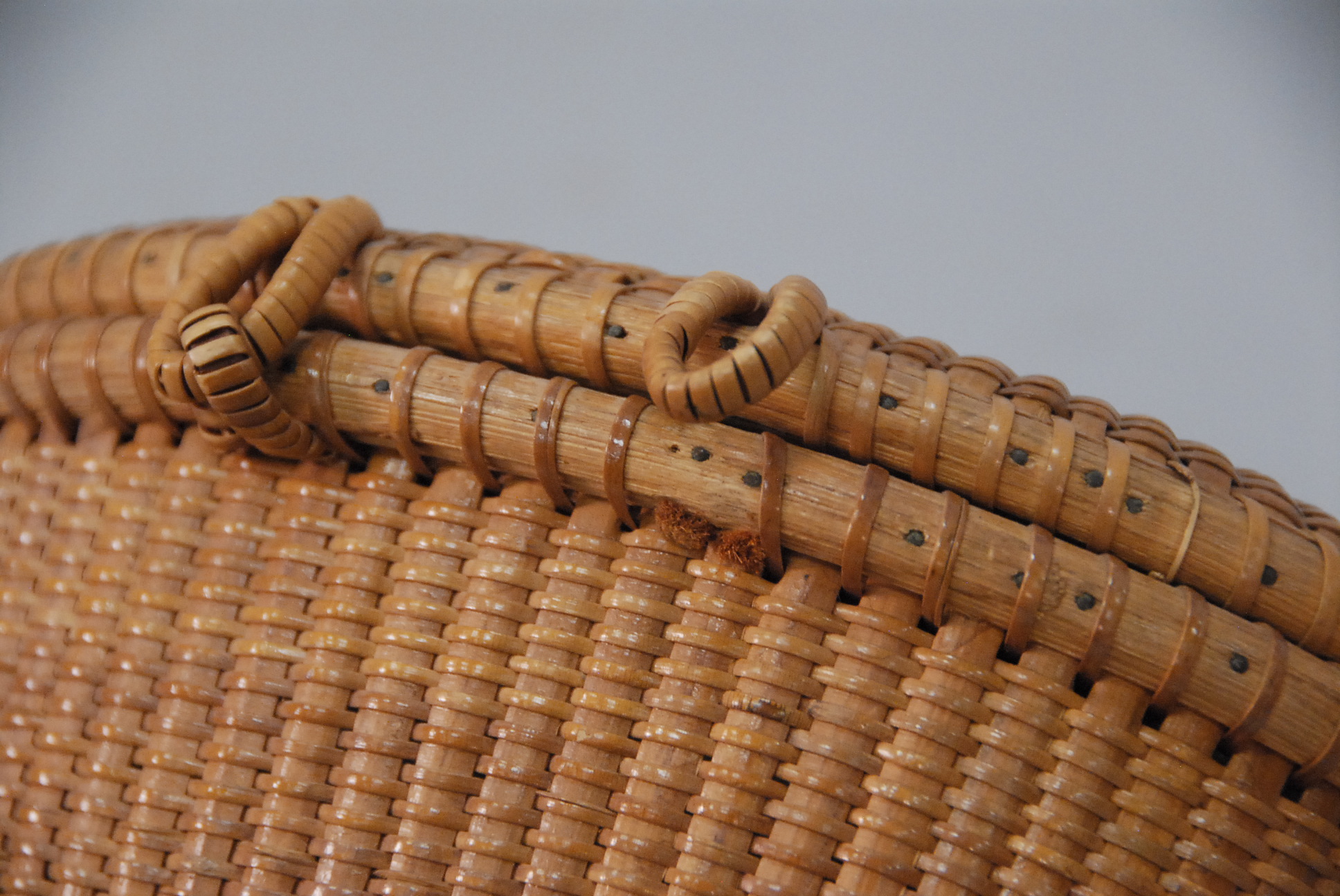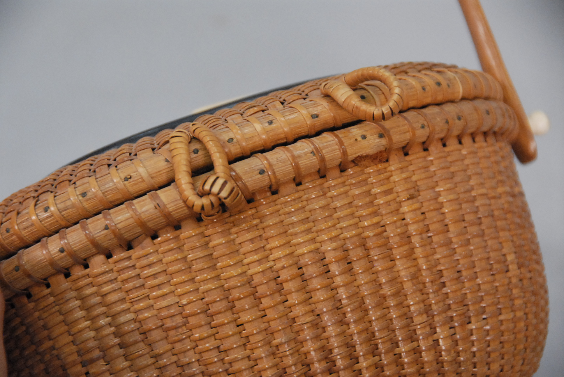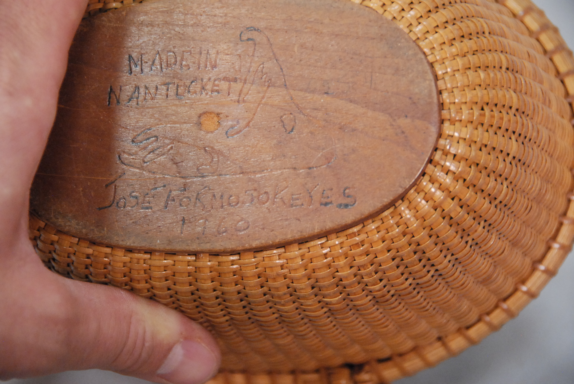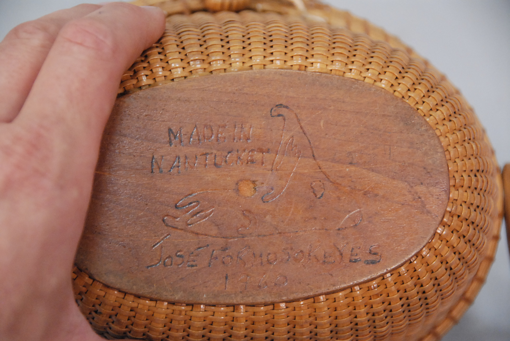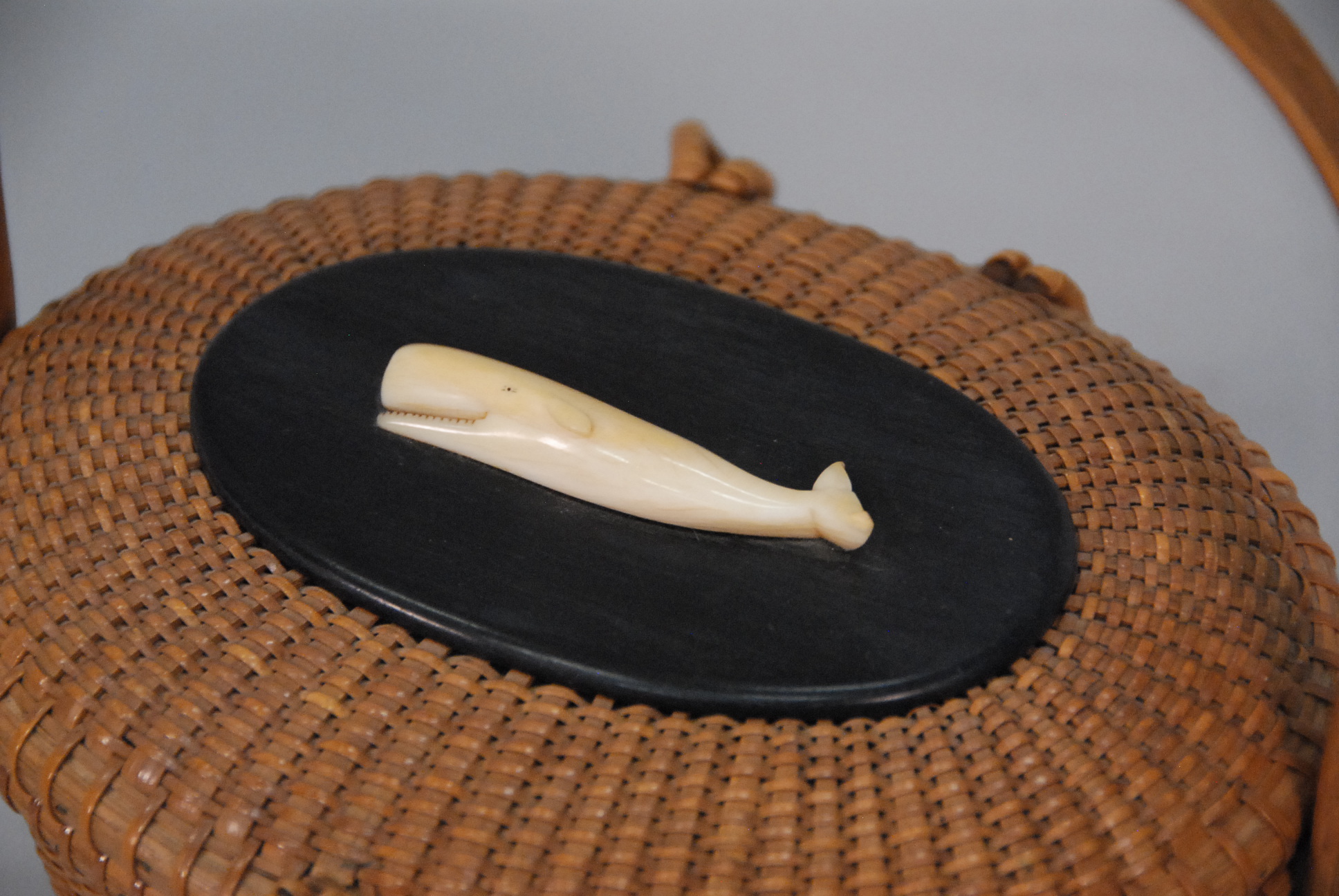 Lot 146: Nantucket basket purse by Jose Formosa Reyes 1902-1980, oval shaped top having carved ivory whale on ebony oval plaque mounted on top, bottom signed Jose Formoso Reyes 1960, made in Nantucket one hinge loose ht. 4in., lg. 9in., wd. 6in.