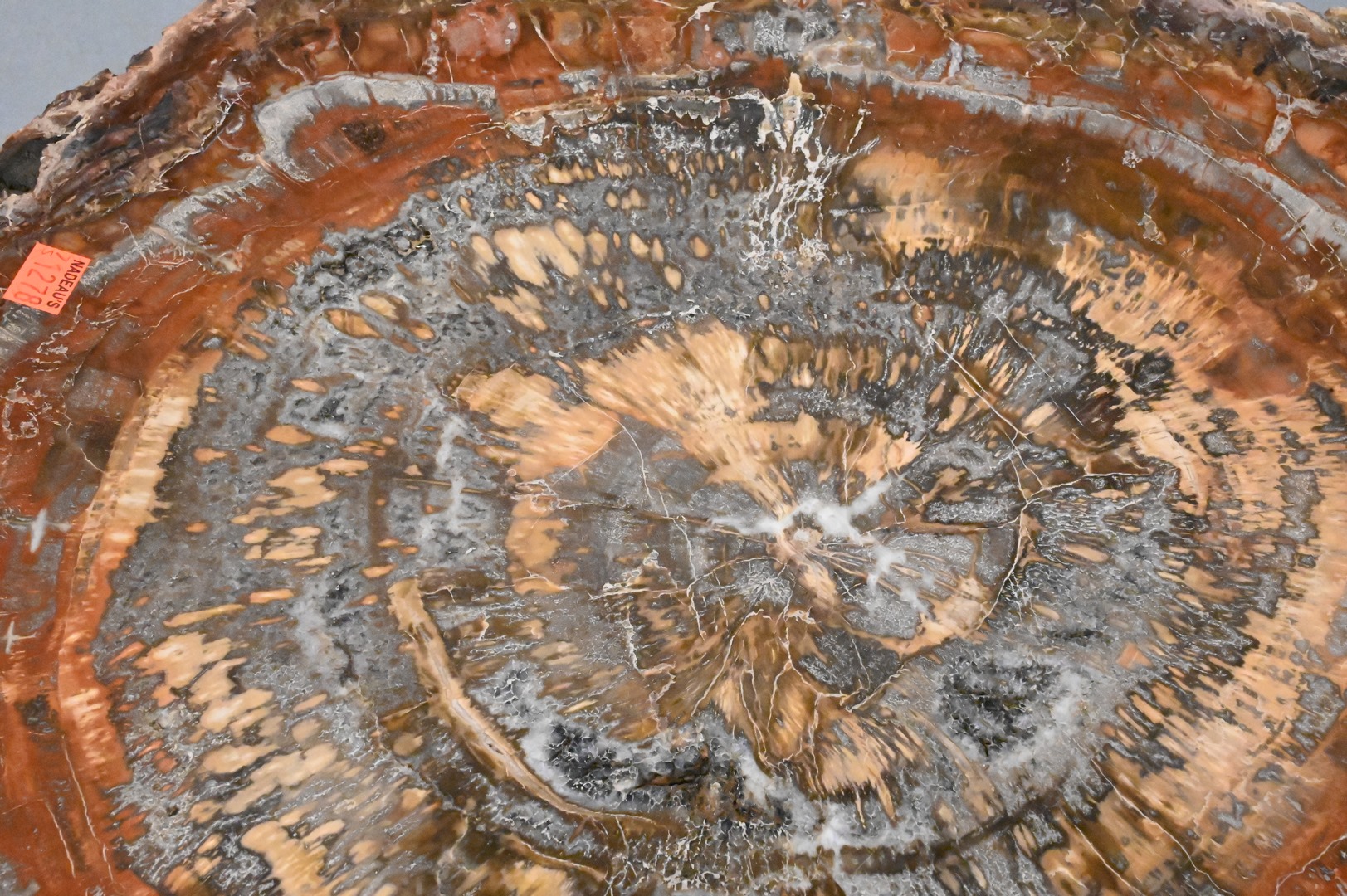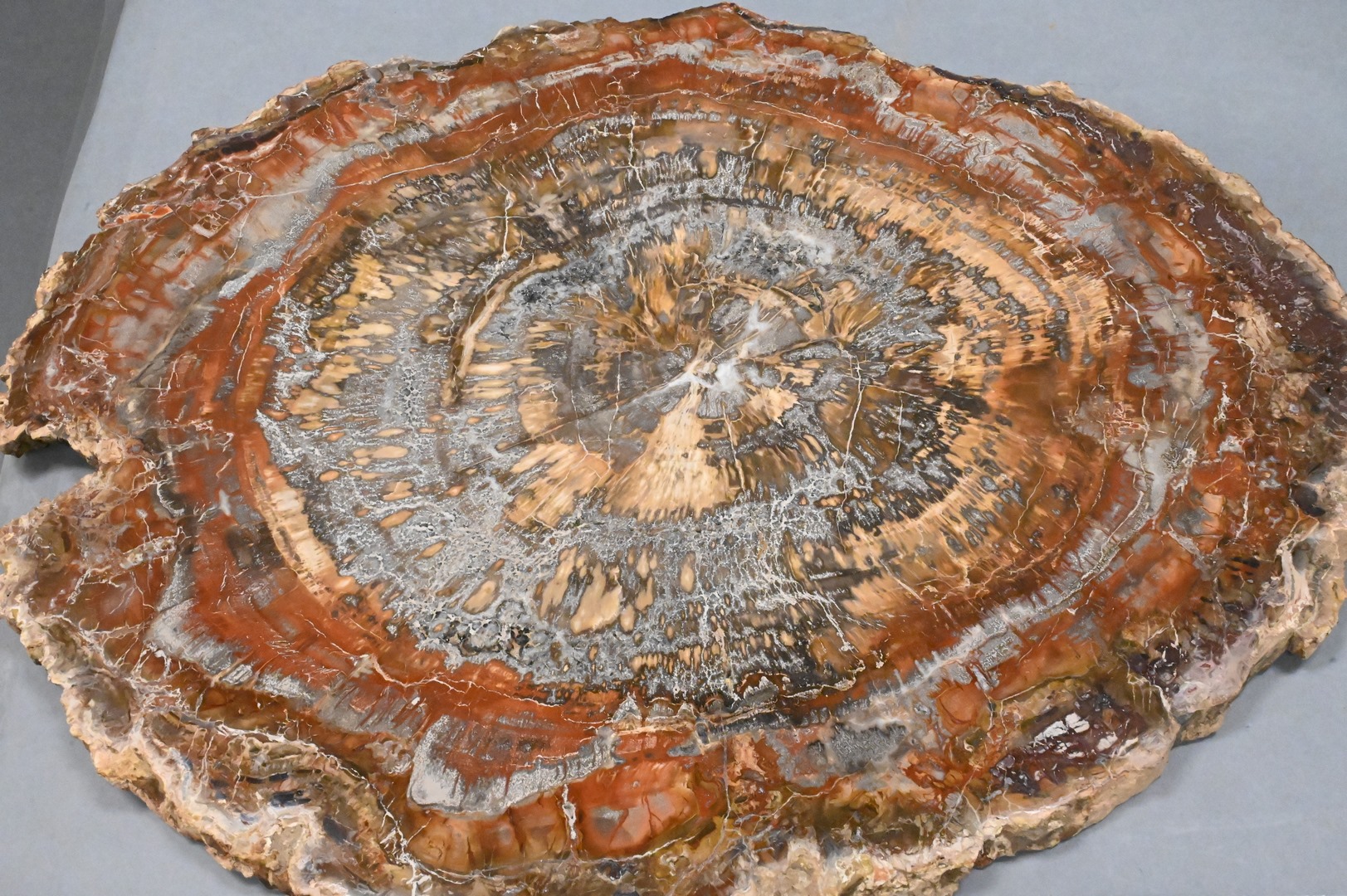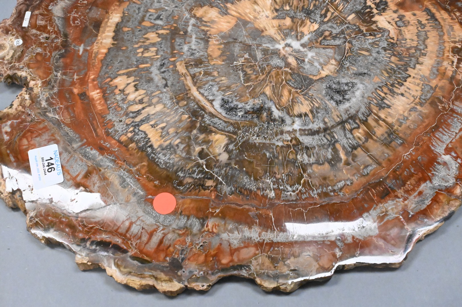 Round Petrified Wood Slab, top for table, diameter 22 inches. Provenance: Estate of Peter Tillou, Litchfield, Connecticut.