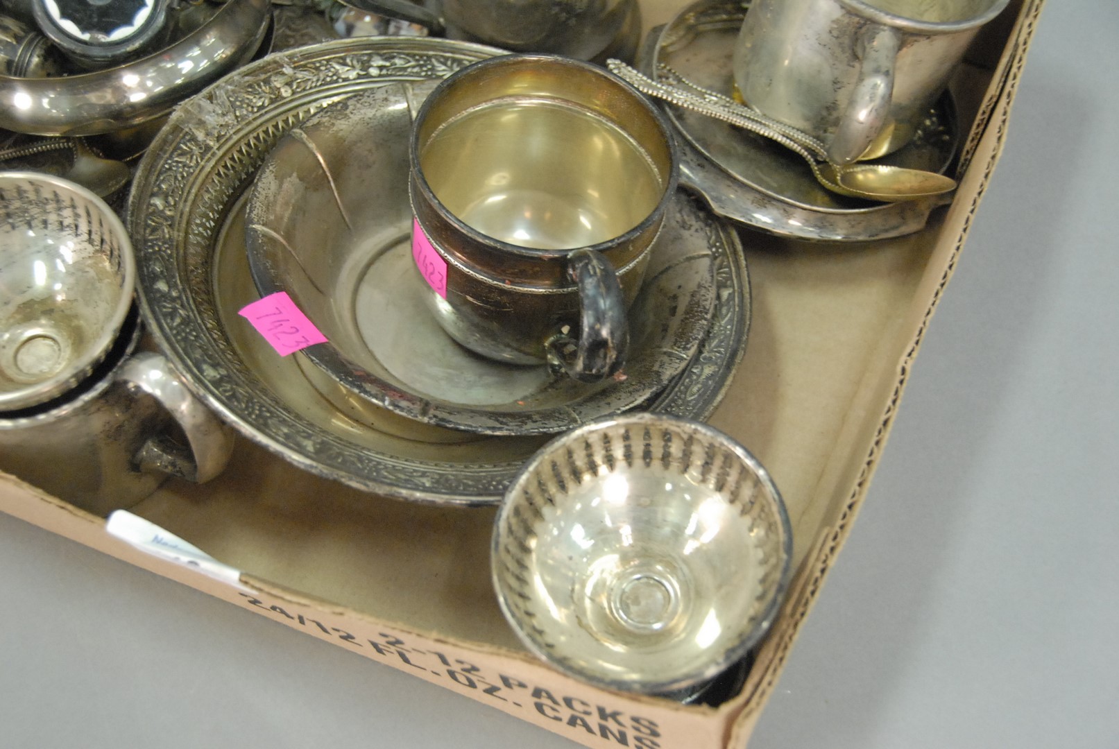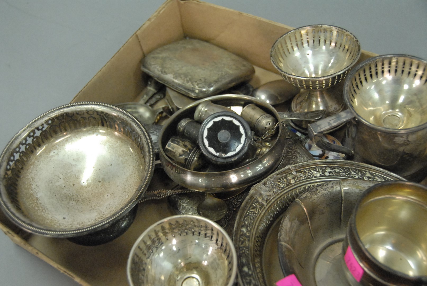 Sterling silver lot including cigarette boxes, mugs, souvenir spoons, etc. 50 t oz.