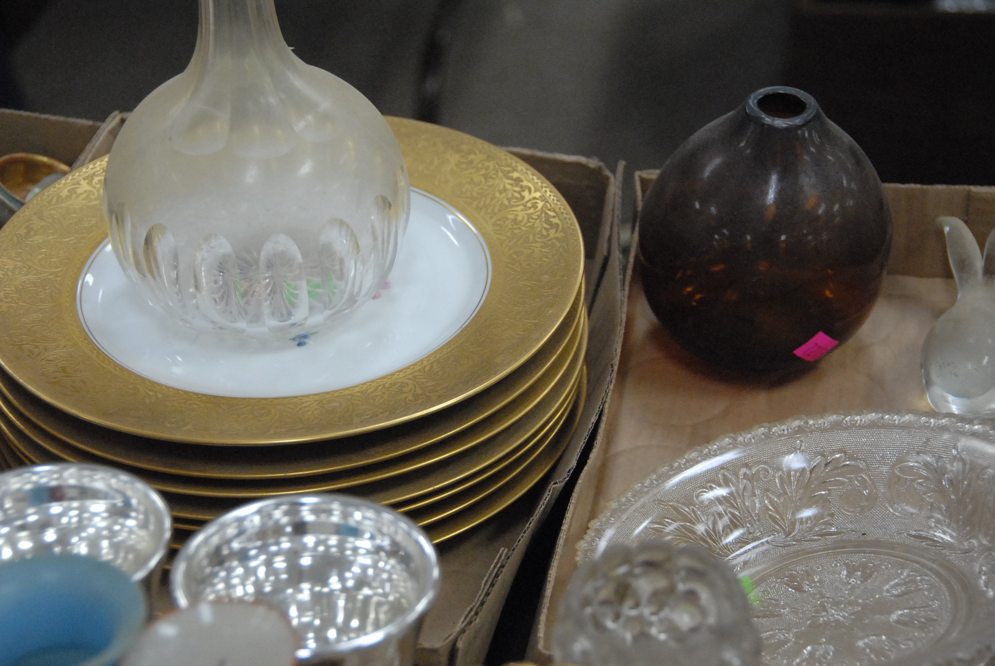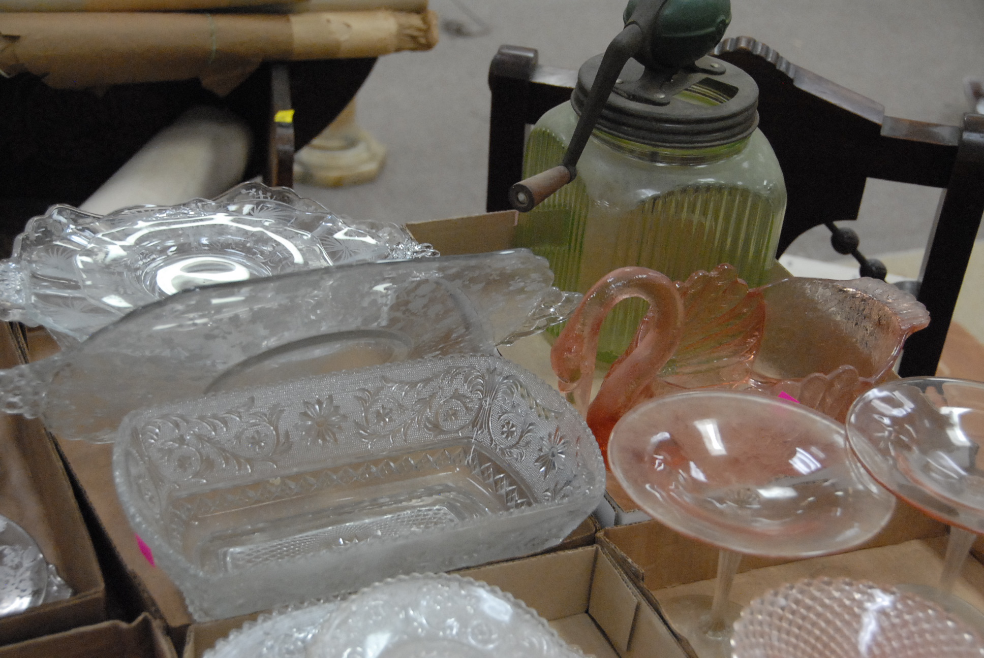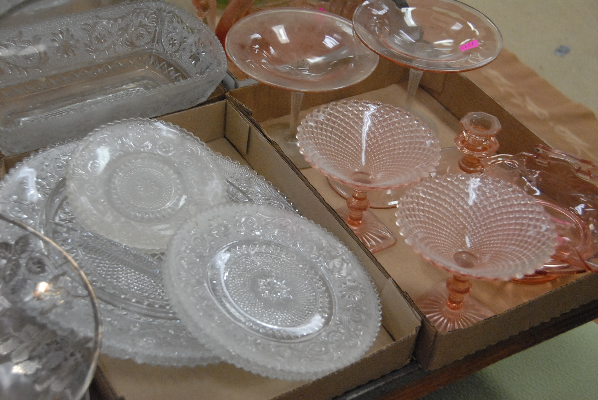 Lot 146: Ten box lots to include seven service plates, sandwich glass, pressed glass and depression glass.