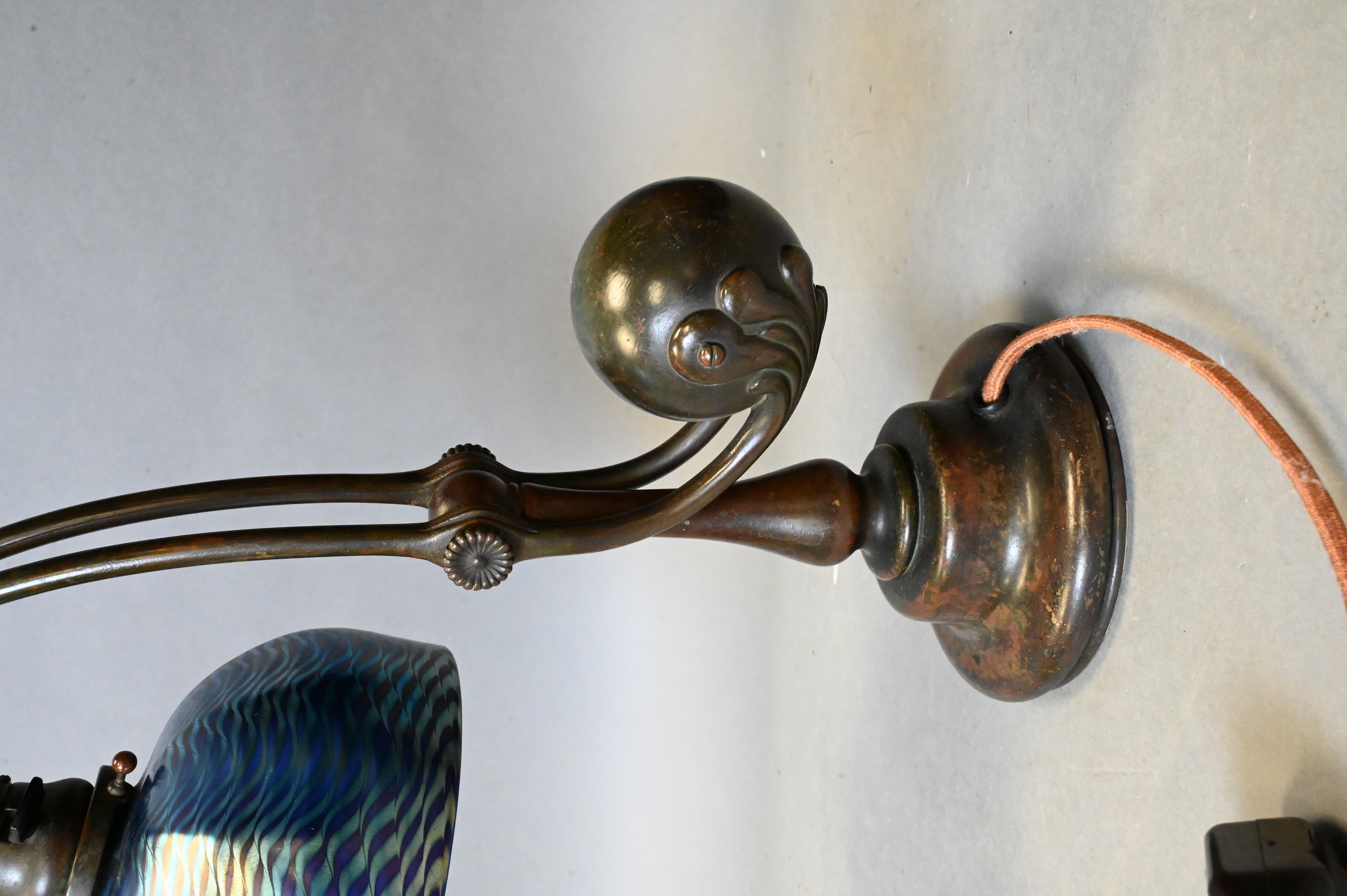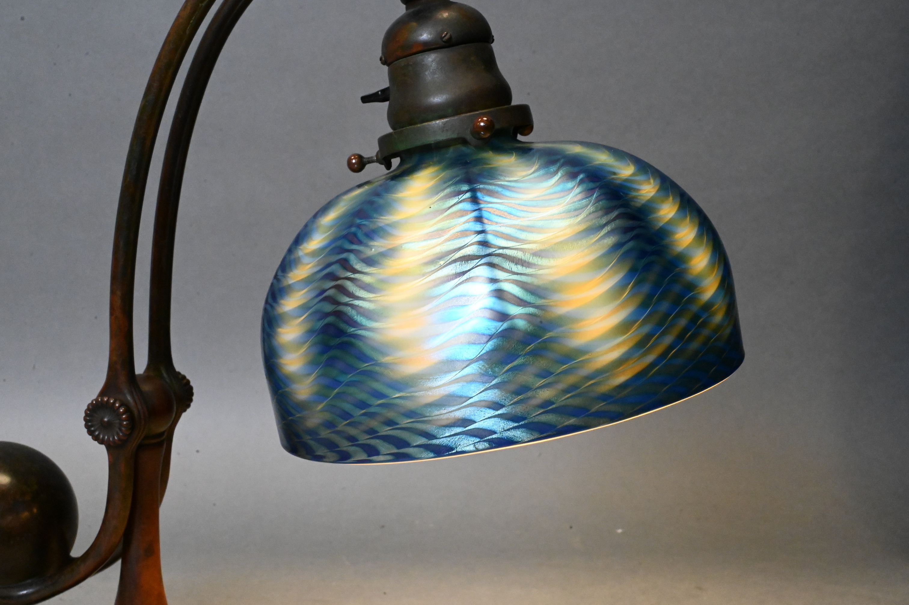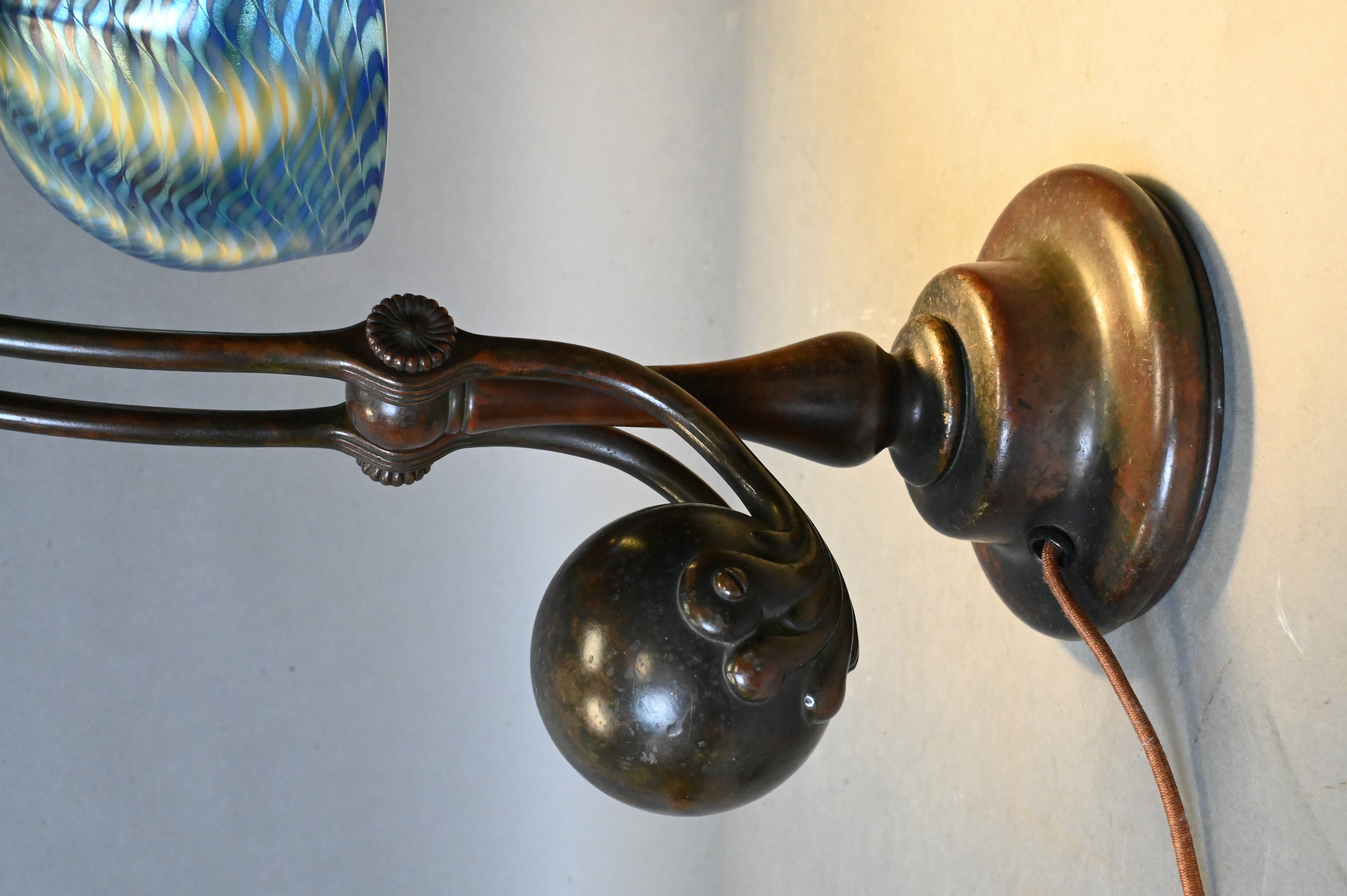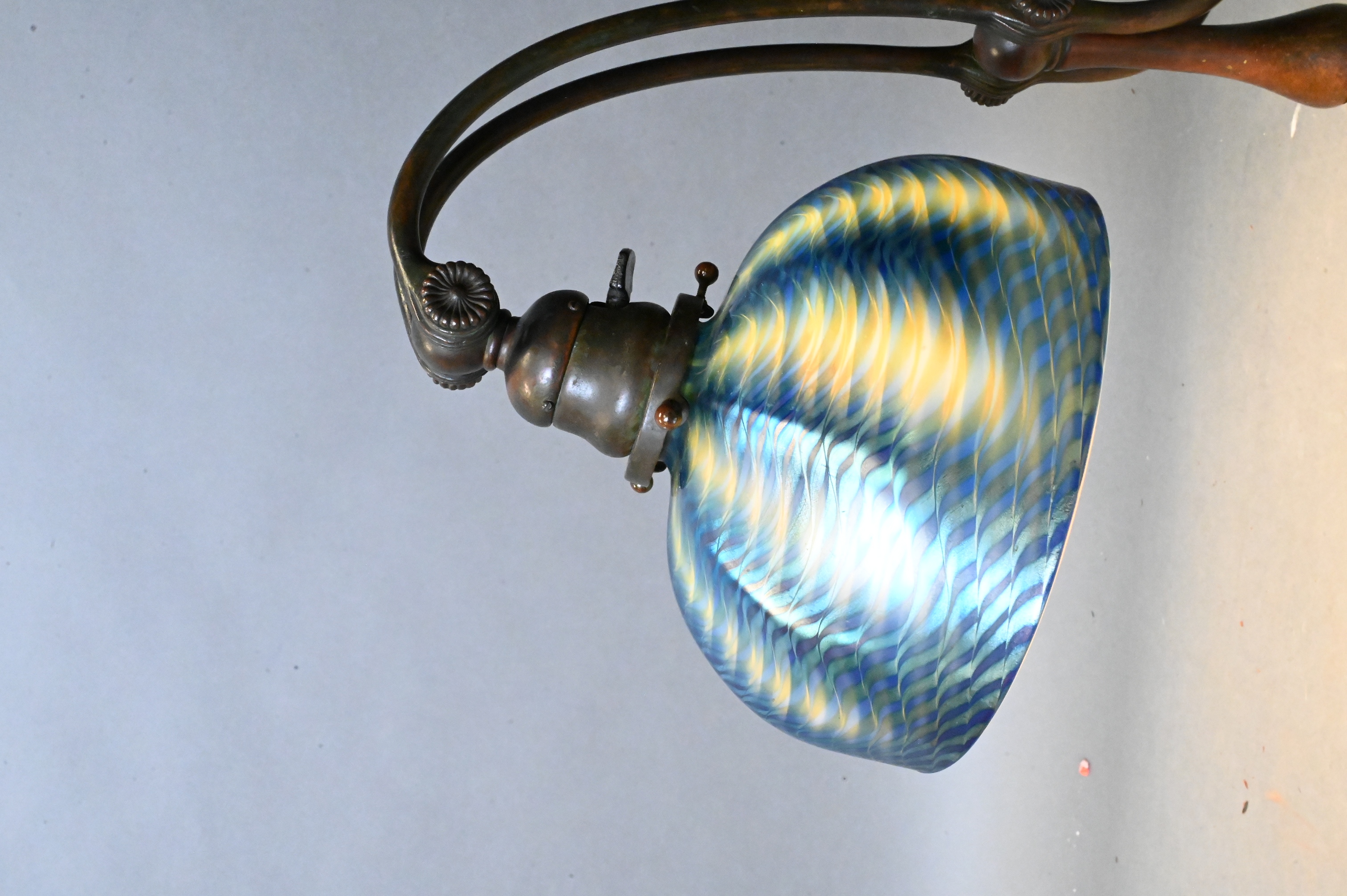 having blue iridescent damascene ribbed Faurice glass shade, brown and green bronze patinated double scrolling arm body ending in spherical leaf molded balance weight marked on base Tiffany Studios New York 417, glass shade etched signature LCT Favrile, circa 1905