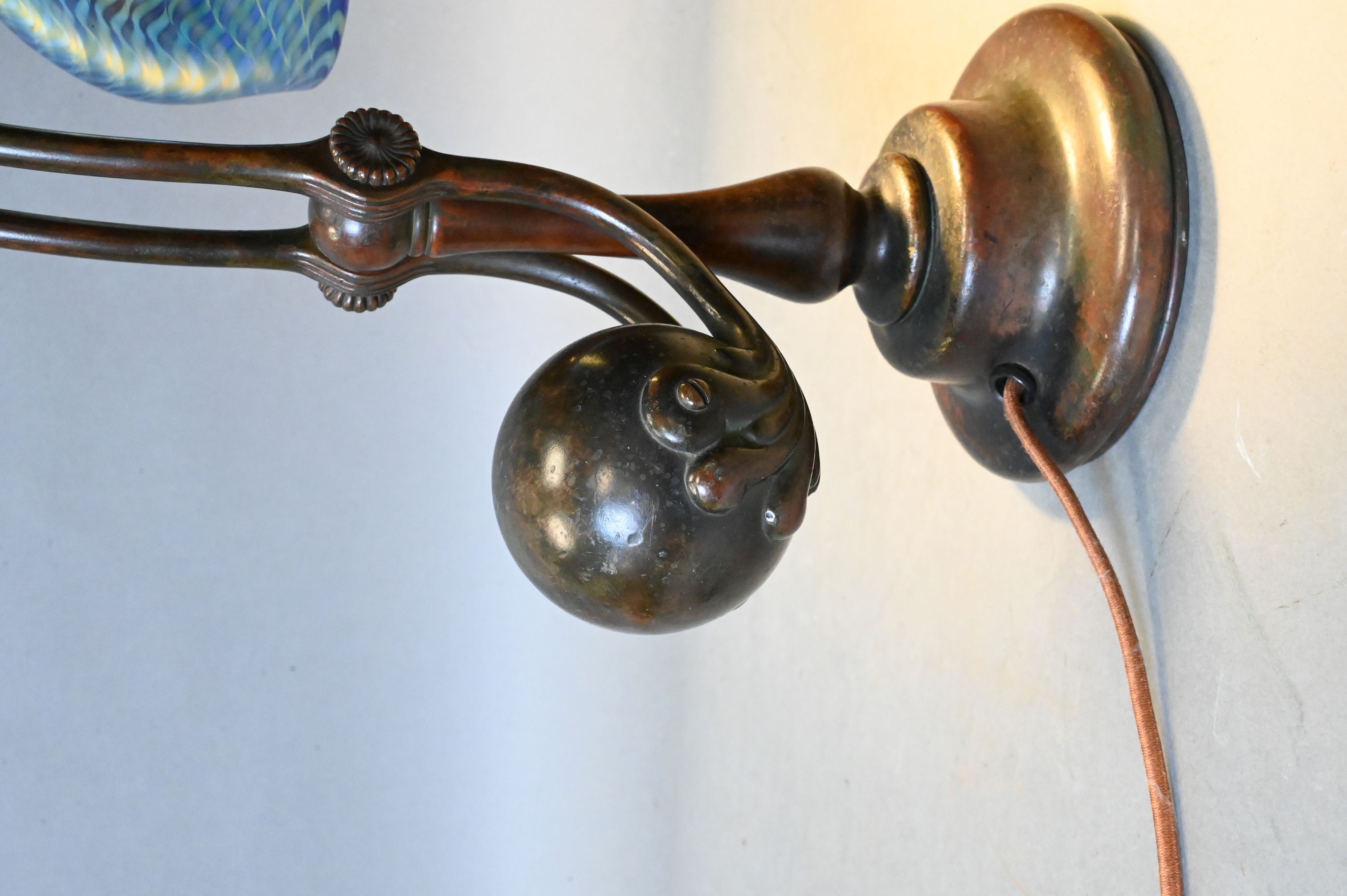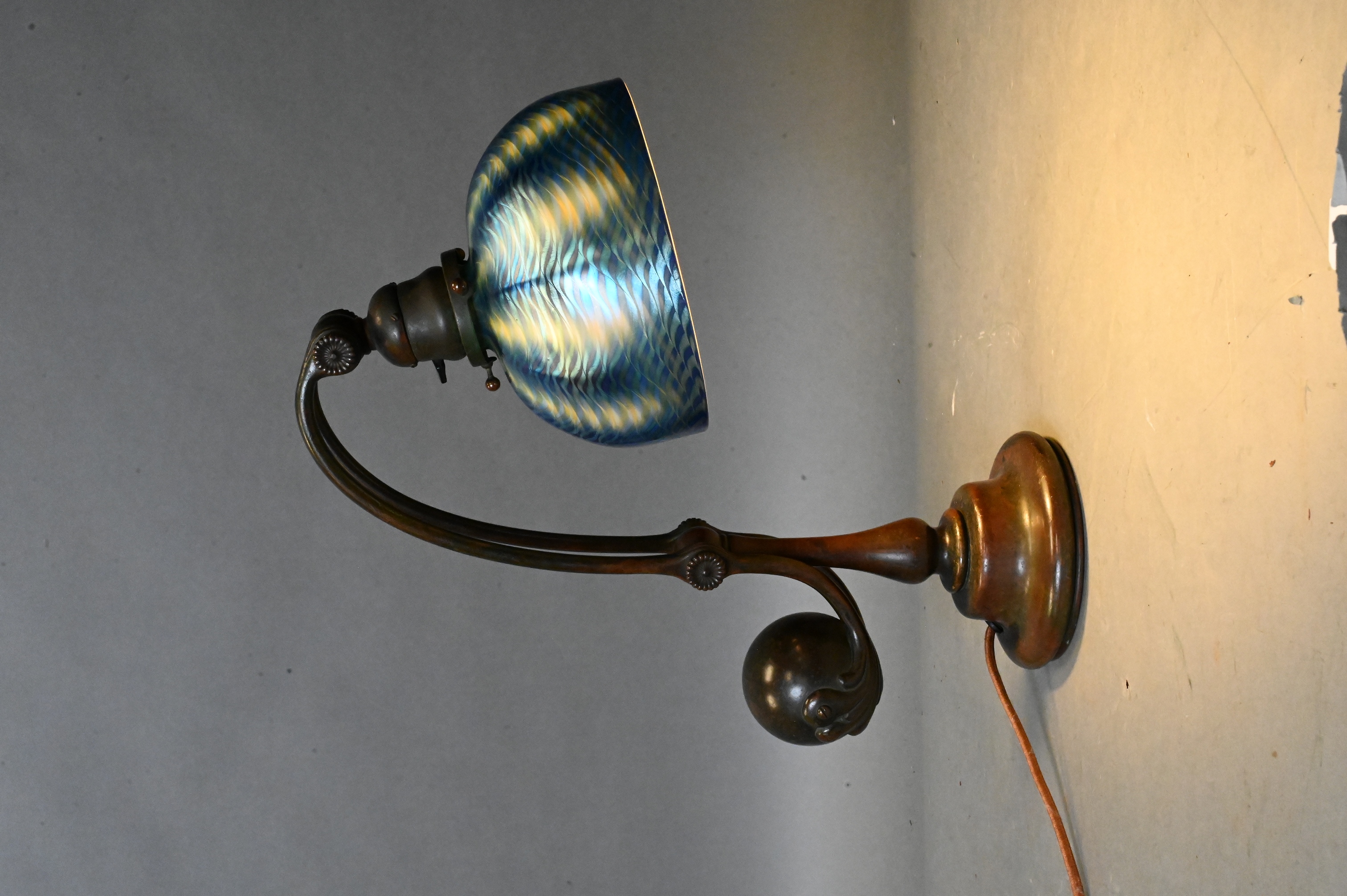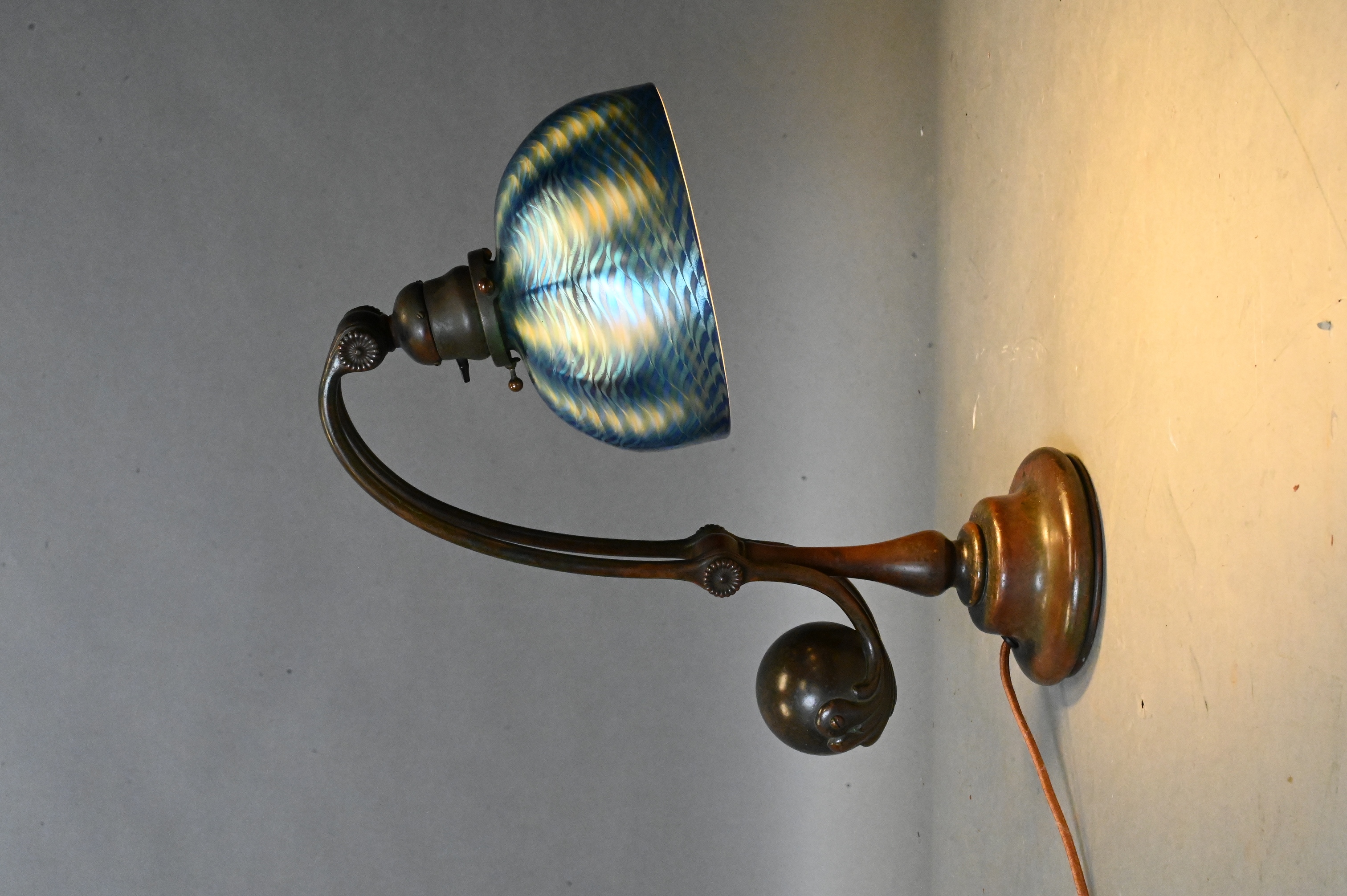 having blue iridescent damascene ribbed Faurice glass shade, brown and green bronze patinated double scrolling arm body ending in spherical leaf molded balance weight marked on base Tiffany Studios New York 417, glass shade etched signature LCT Favrile, circa 1905
