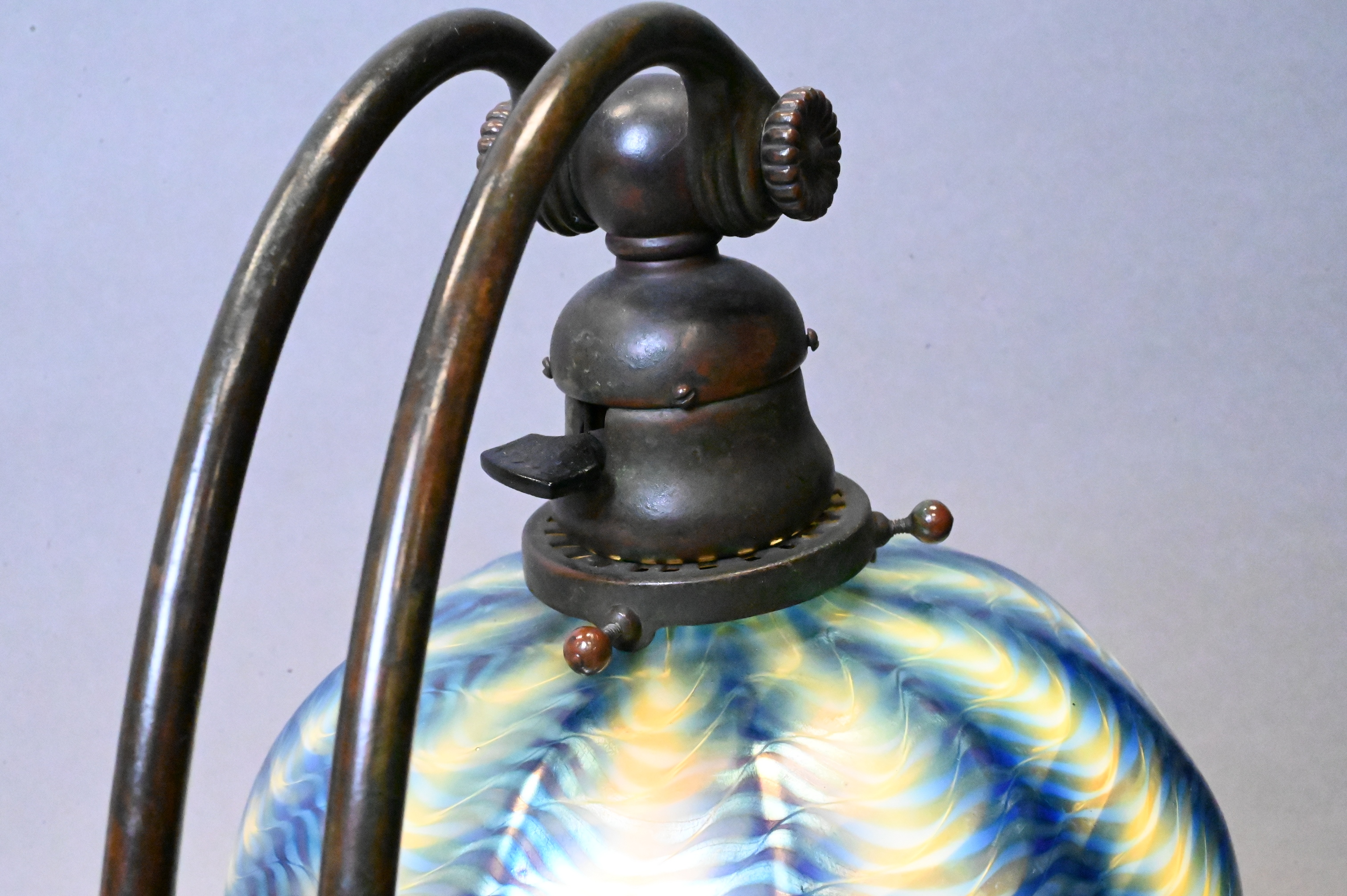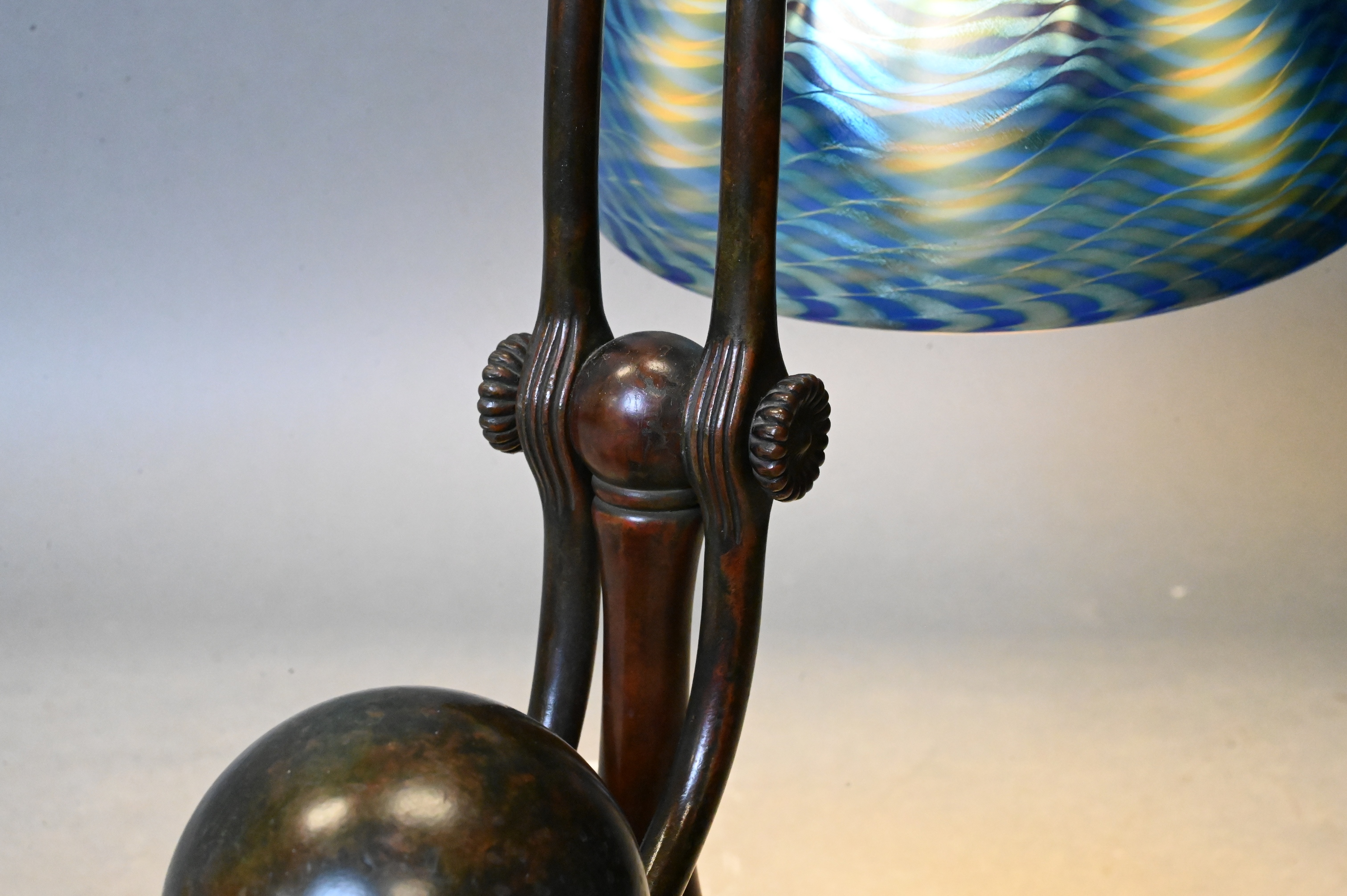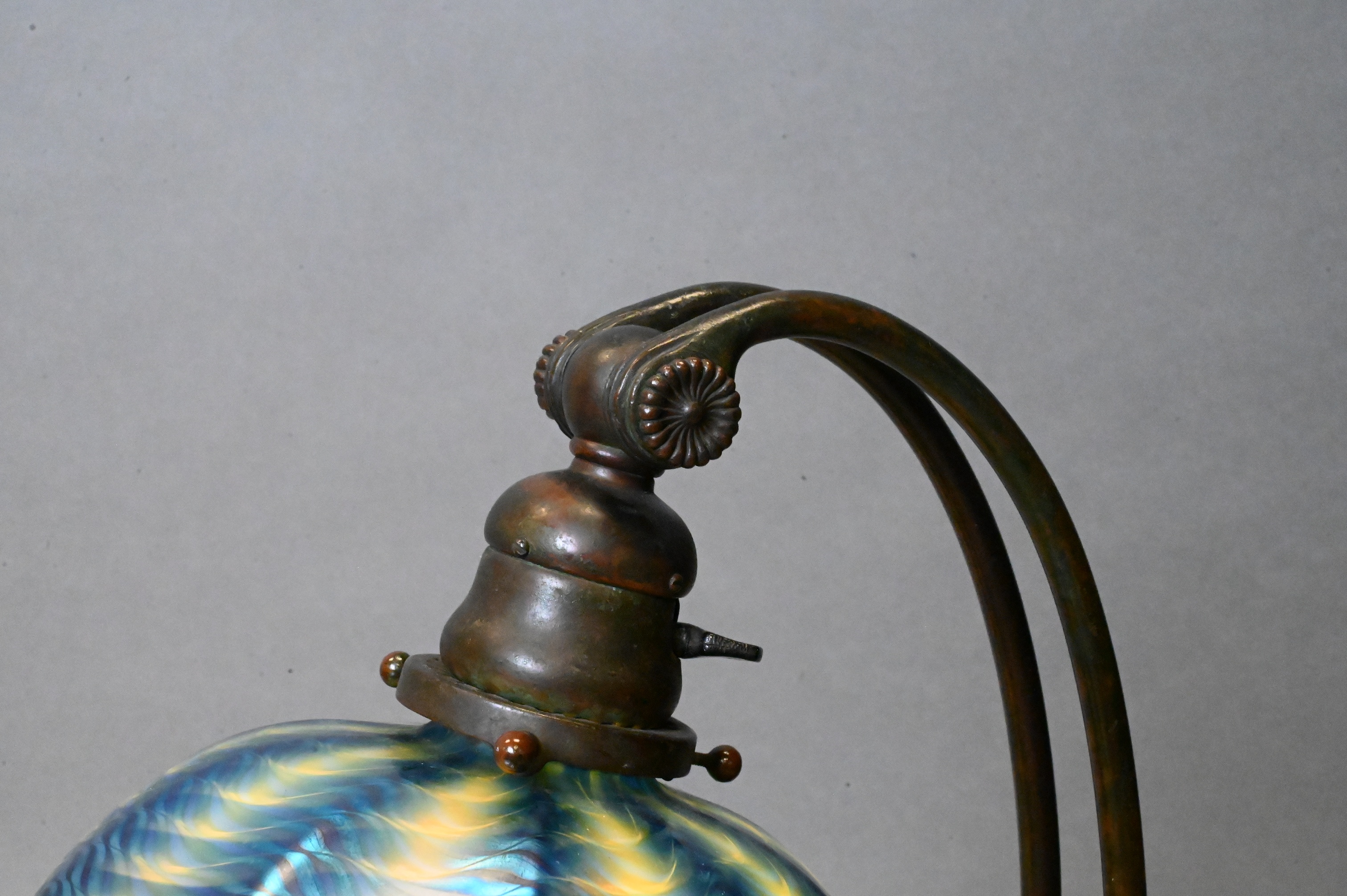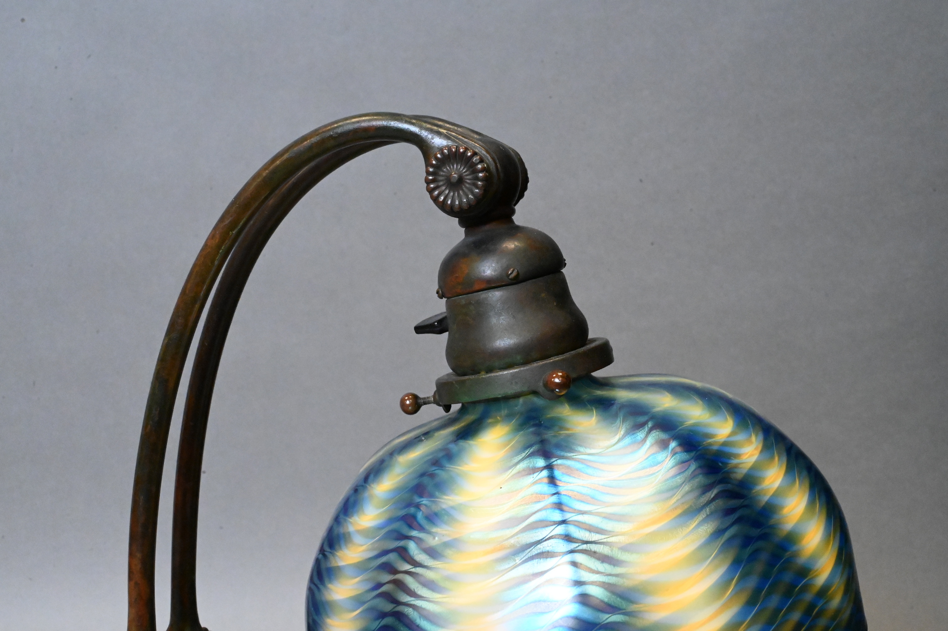 having blue iridescent damascene ribbed Faurice glass shade, brown and green bronze patinated double scrolling arm body ending in spherical leaf molded balance weight marked on base Tiffany Studios New York 417, glass shade etched signature LCT Favrile, circa 1905
