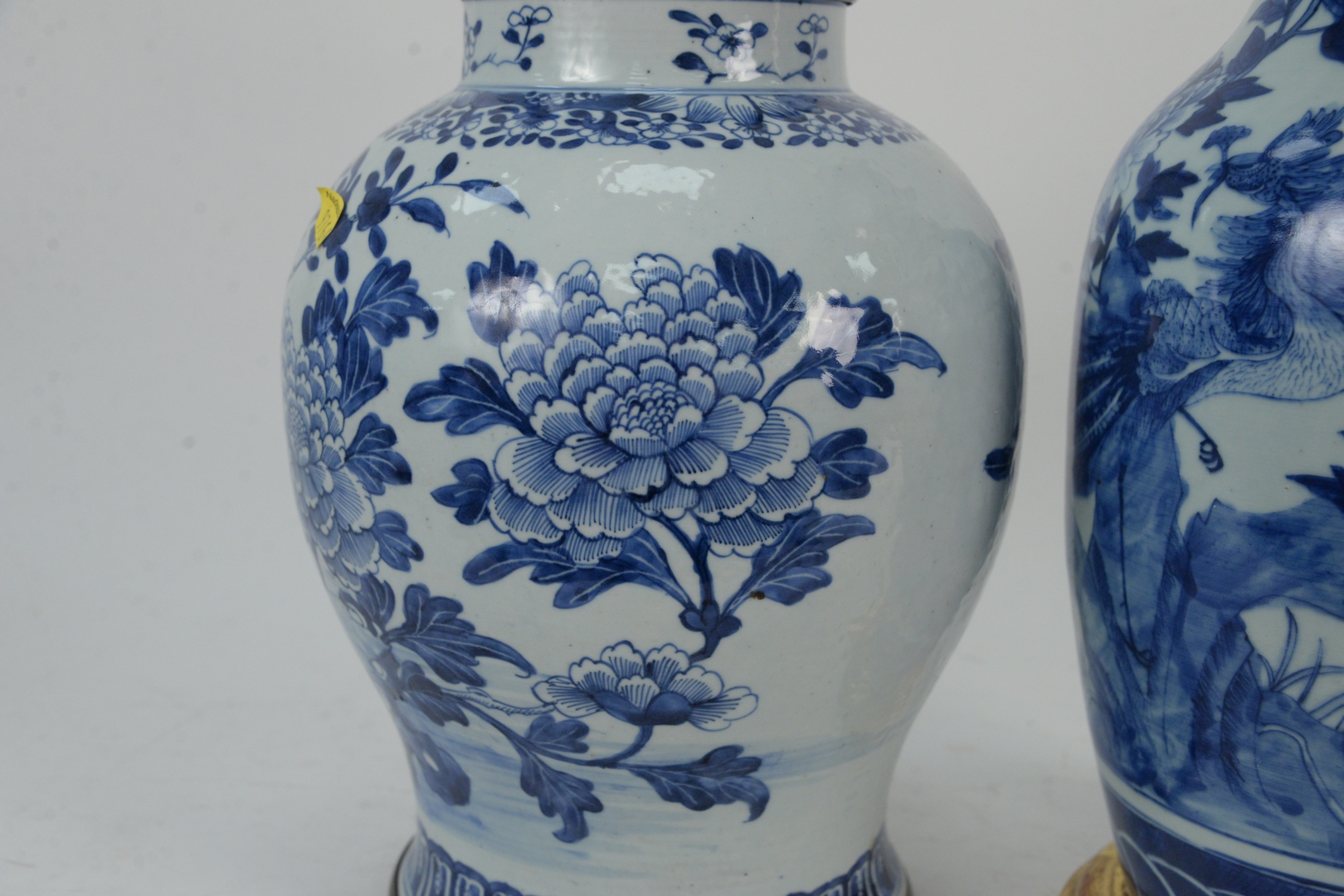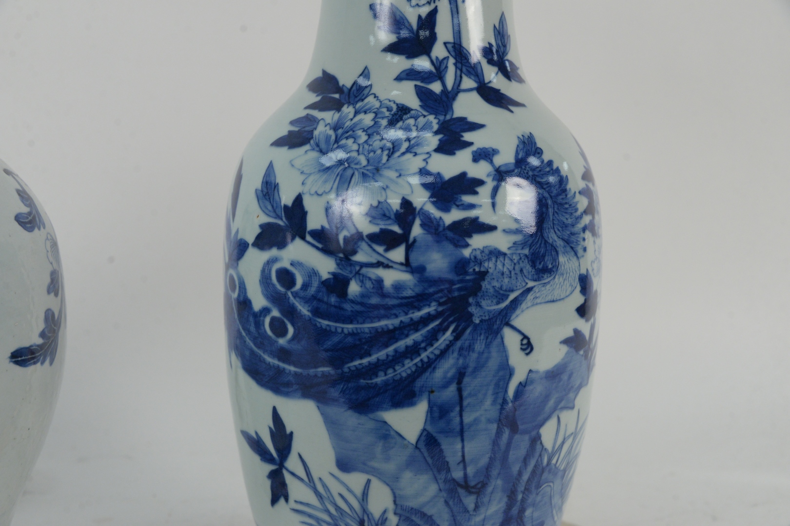 Lot 146: Two Chinese Blue and White Porcelain Baluster Vases one having painted flowers and trees, height 12 1/2 inches the other having painted peacock, height 17 inches.