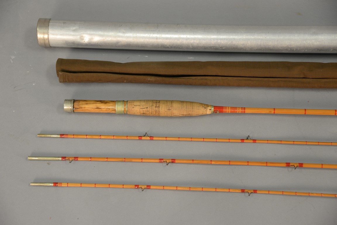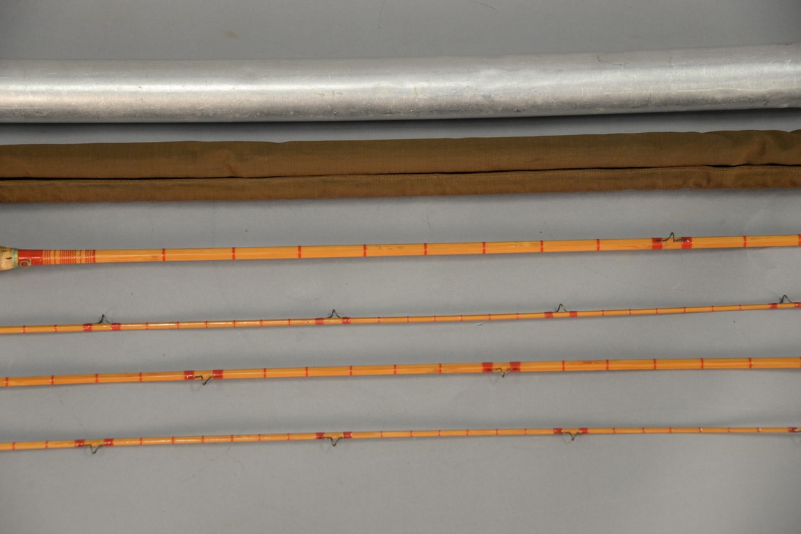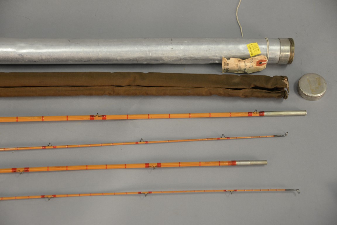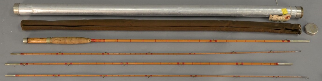 Lot 146B: Leonard three part bamboo fly rod for trout with two tips marked H.L. Leonard Leonard & Mills, in metal case center section has 1 i…