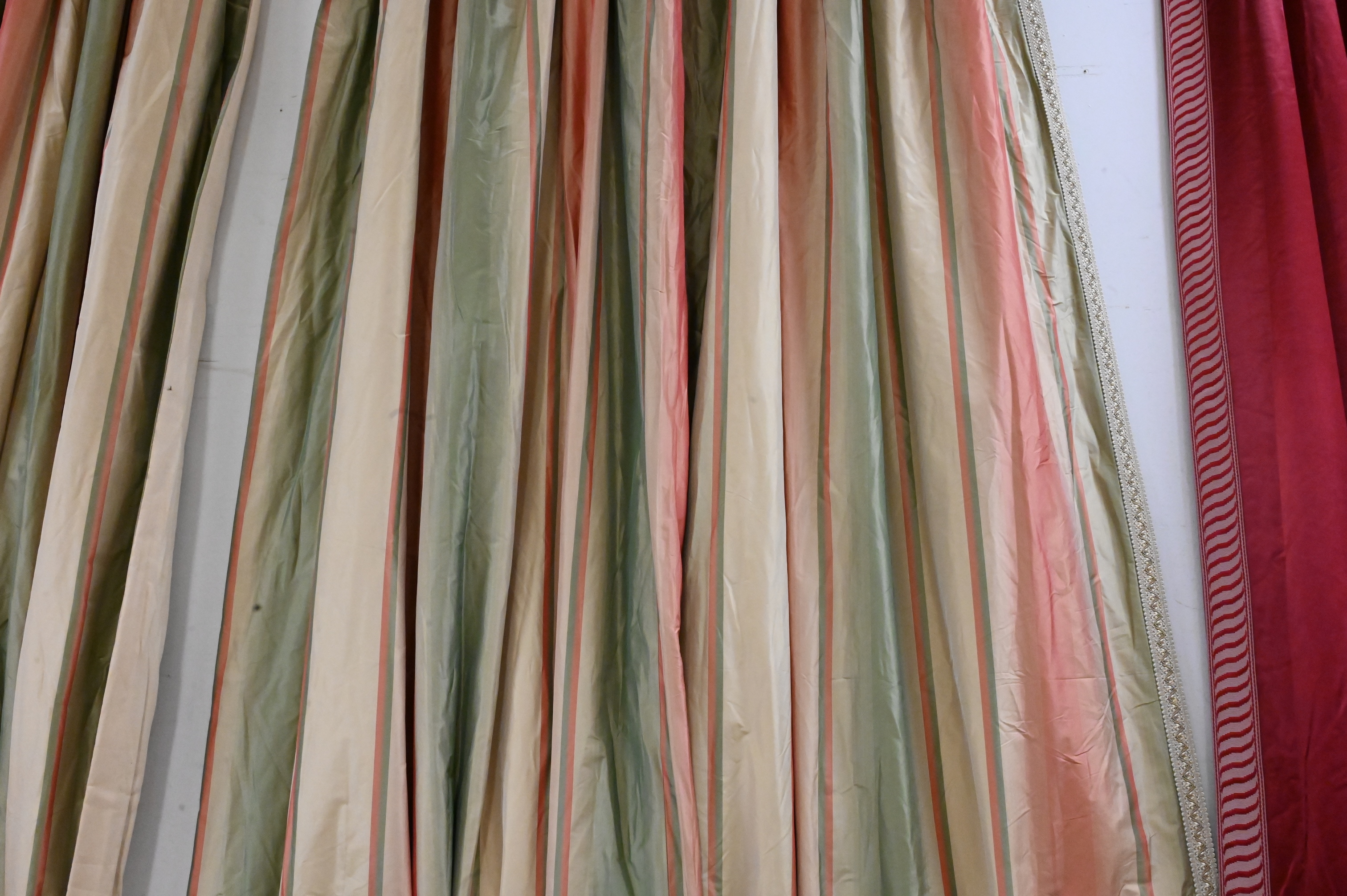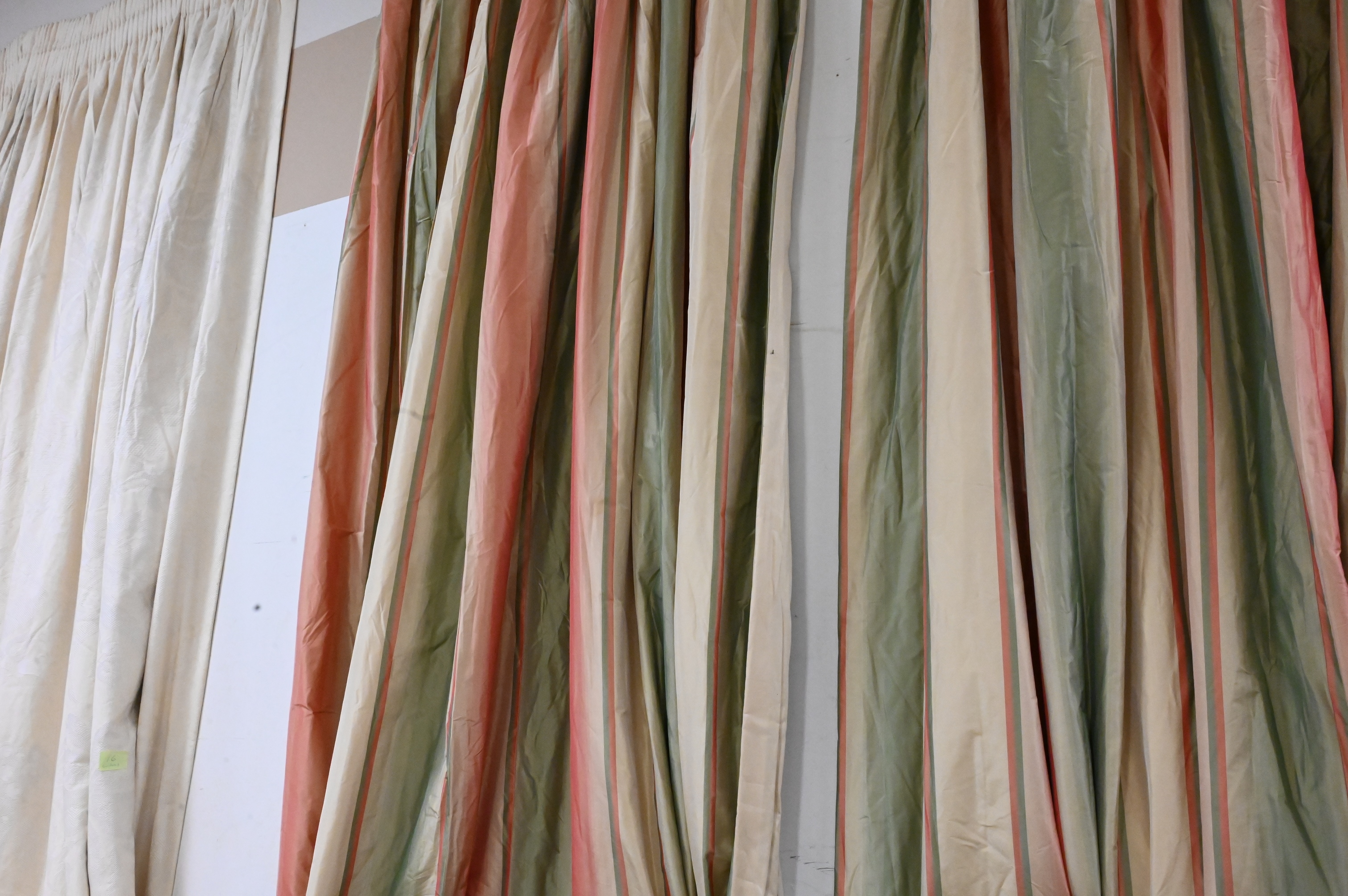 2 Sets of Custom Curtains/Drapes, to include Claremont “silk stripe”, 120″ x 93″; along with green and gold sets, 110″ x 114″, approximately 19 total pieces in lot.