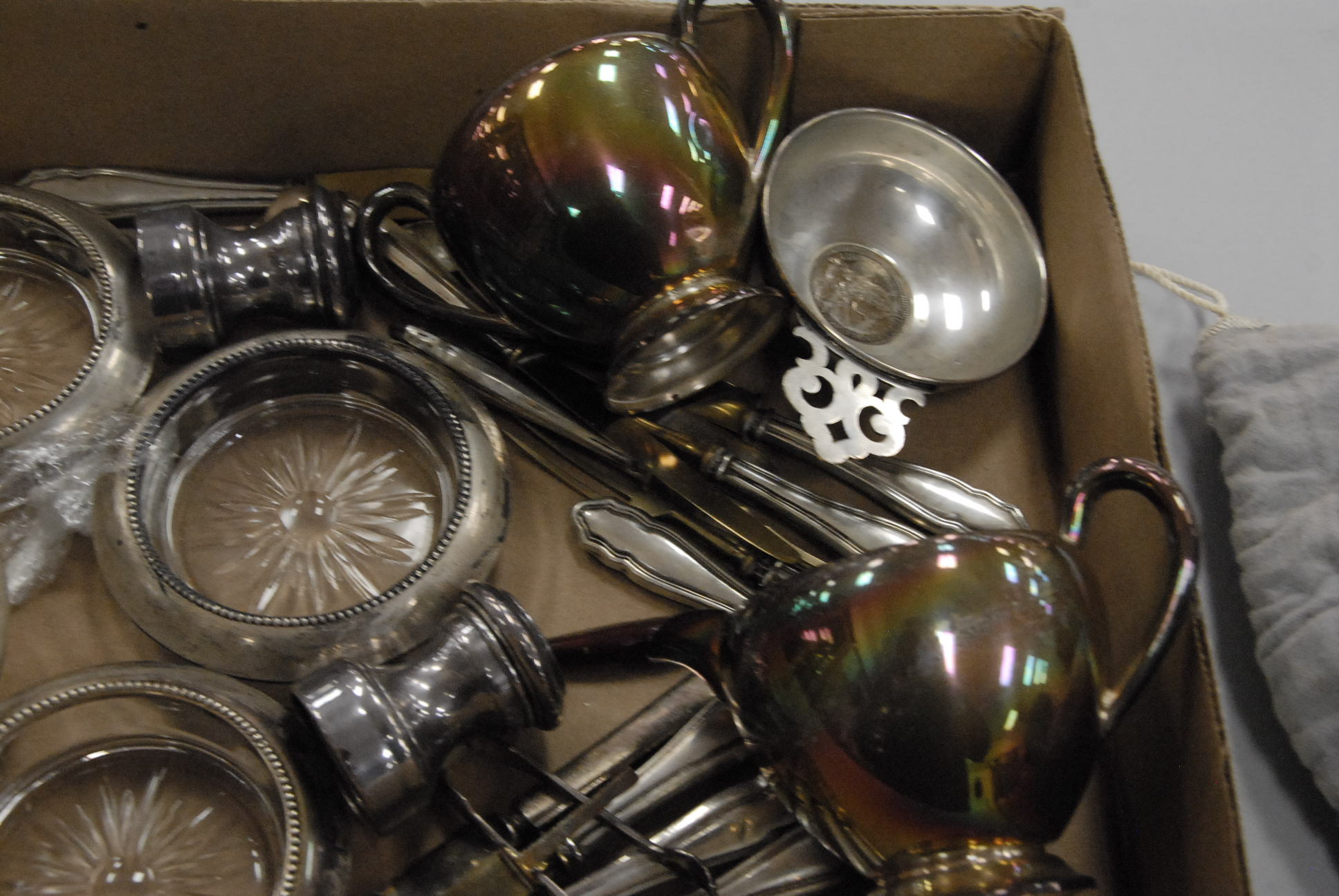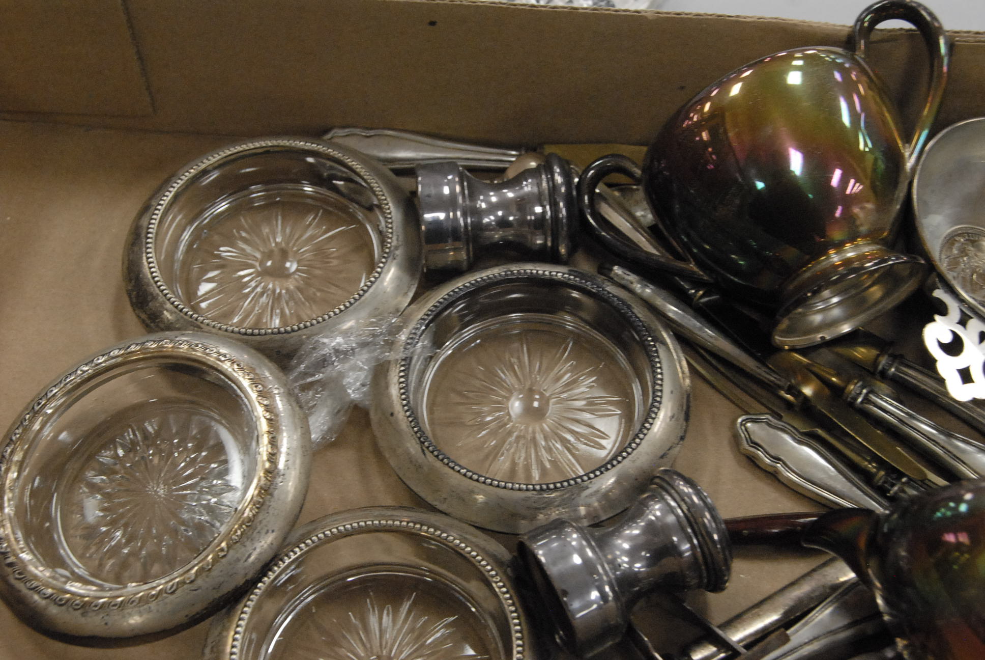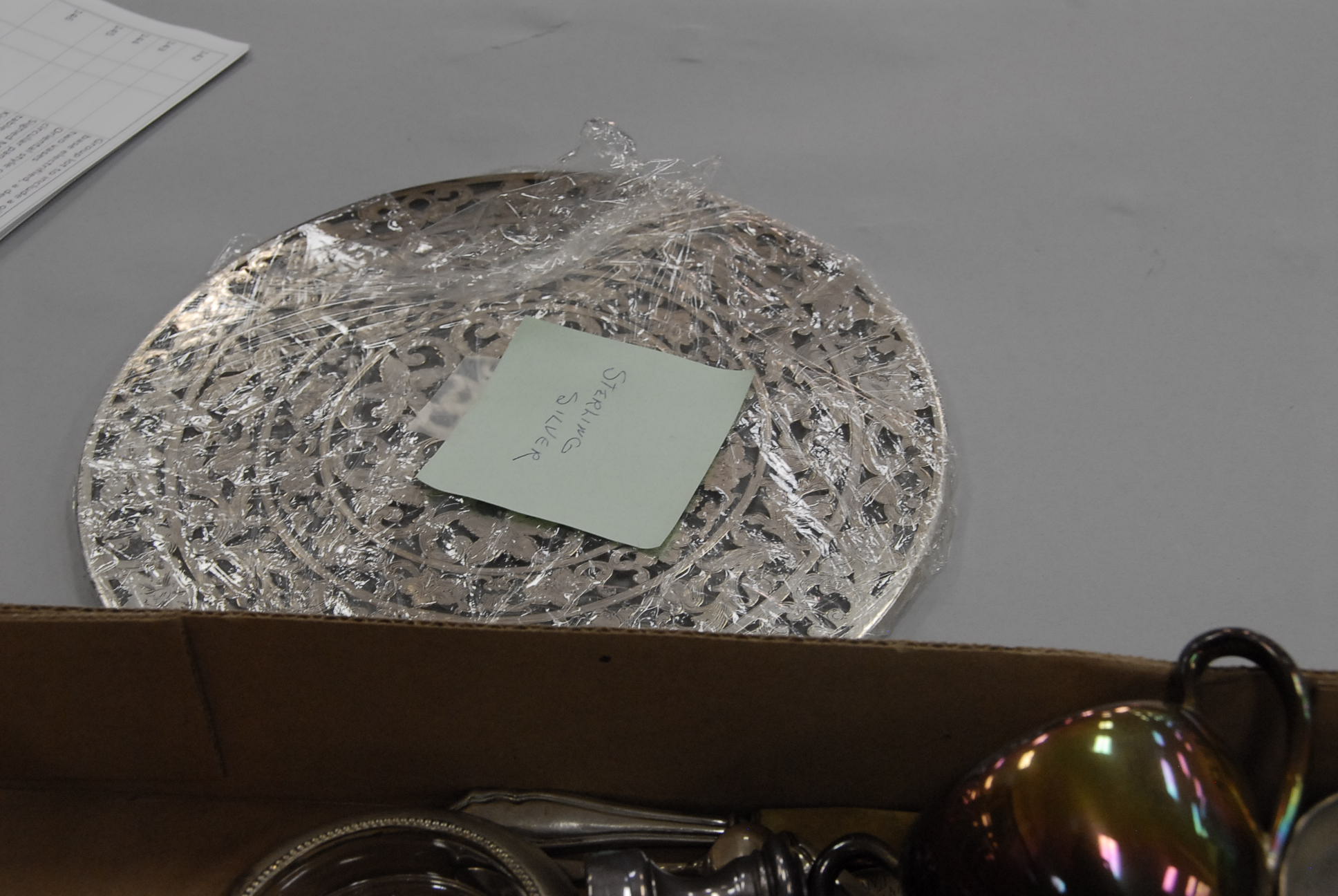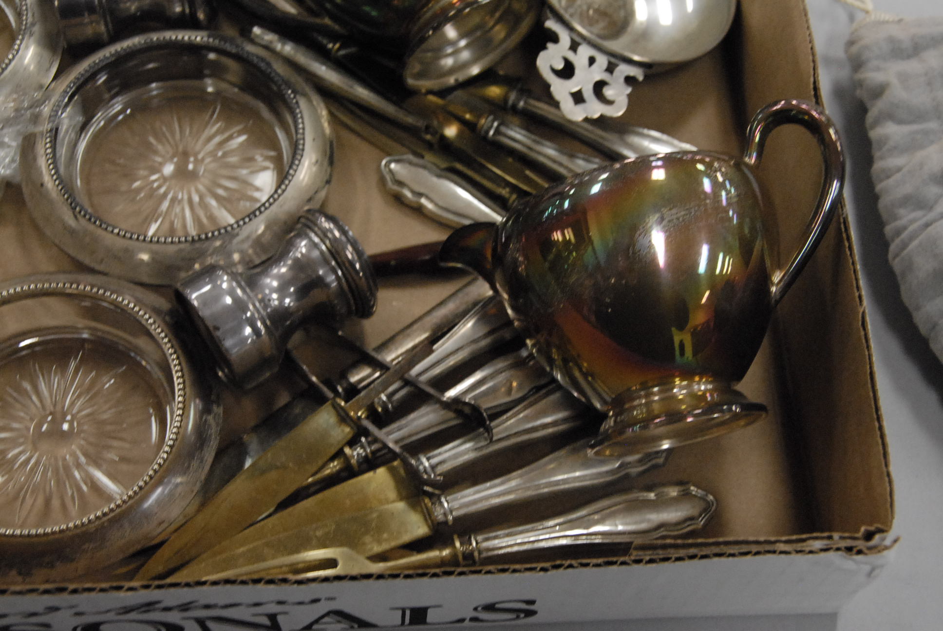A lot of sterling silver to include a hot plate with glass and sterling overlay, sugar and creamer, small porringer, coasters, salt shakers and silver handled knives