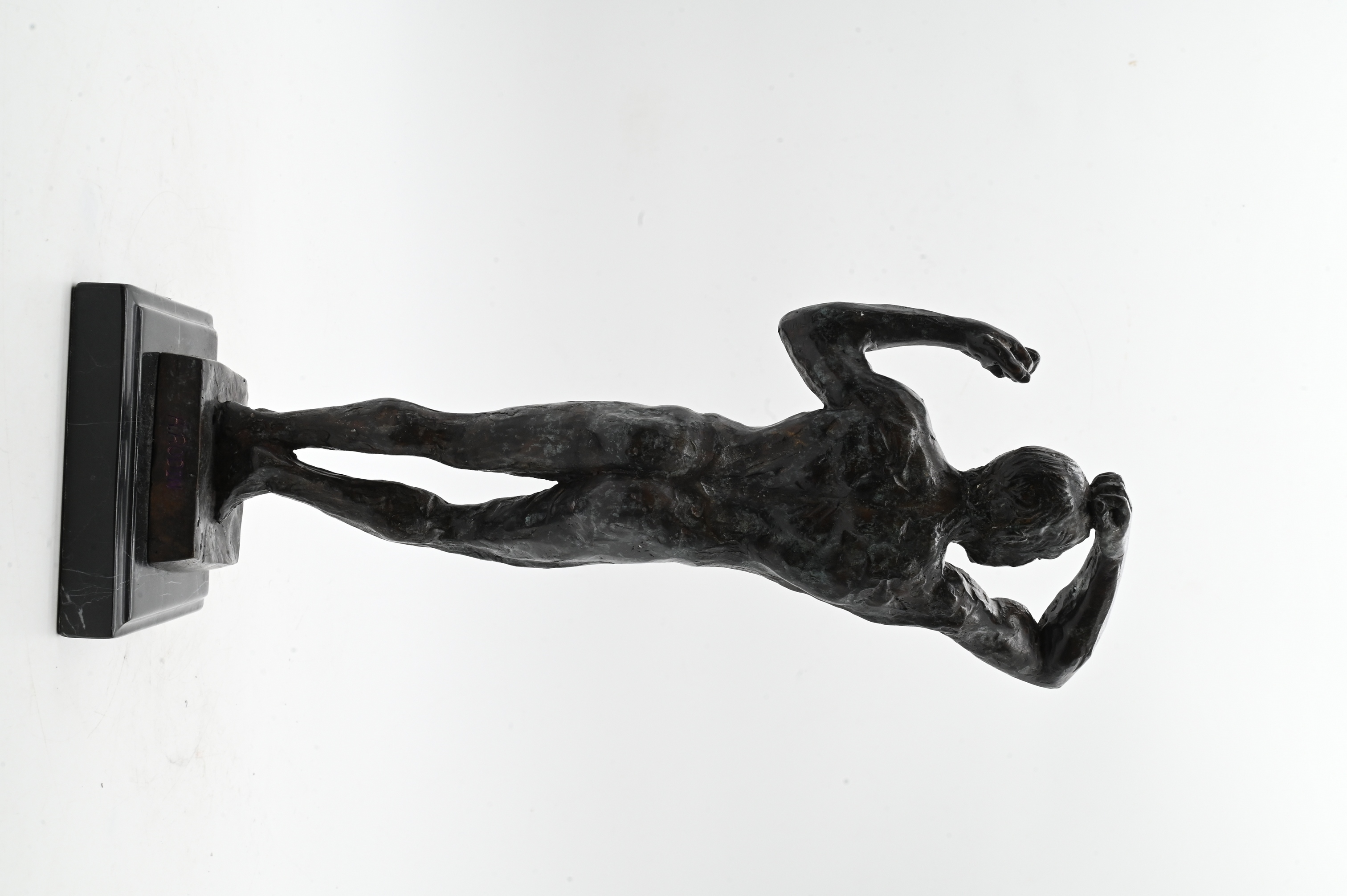 Patinated bronze on black marble base of a male nude