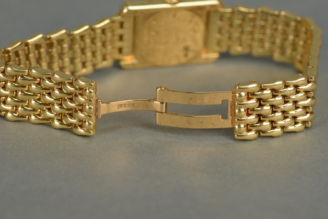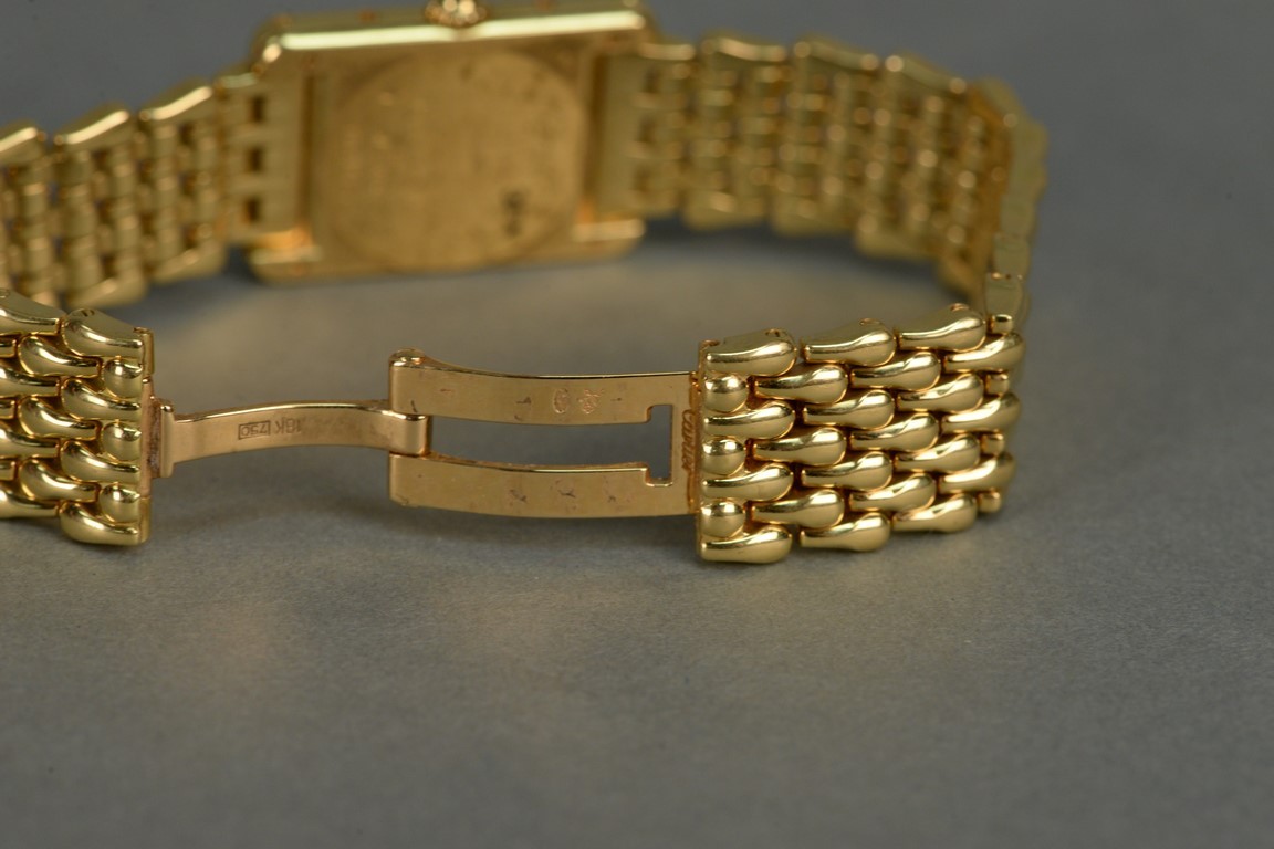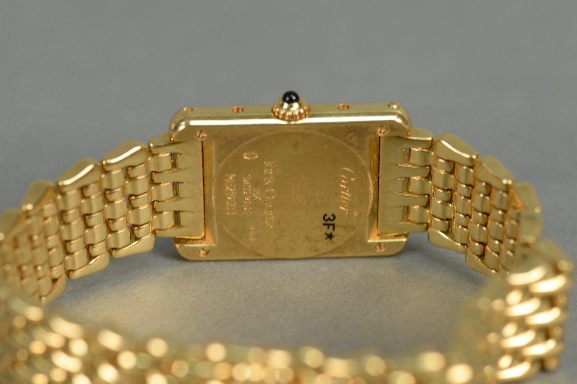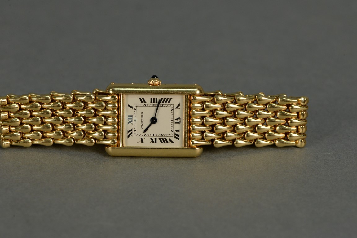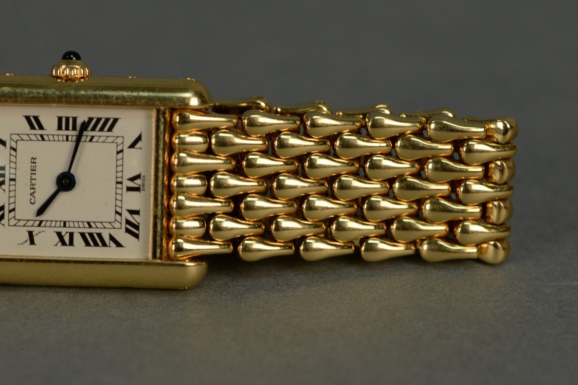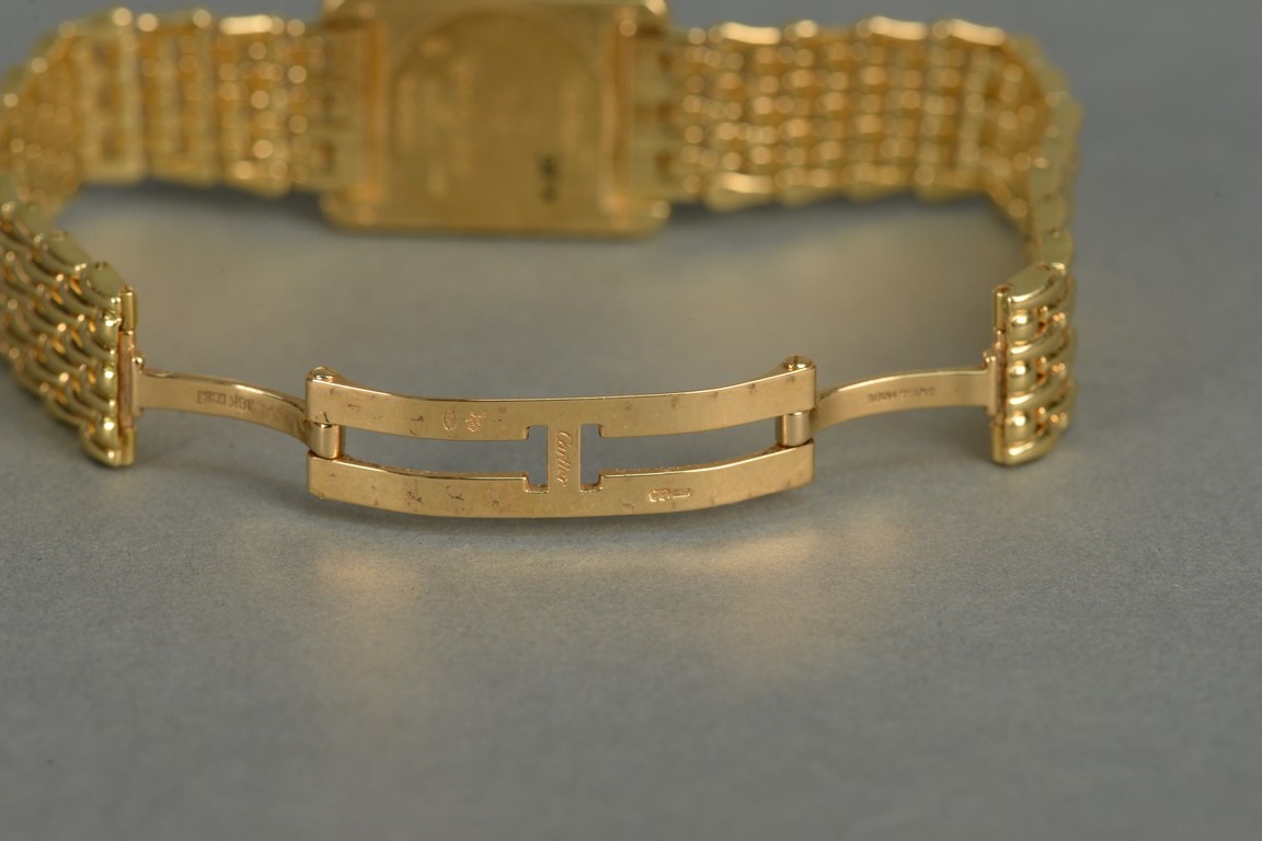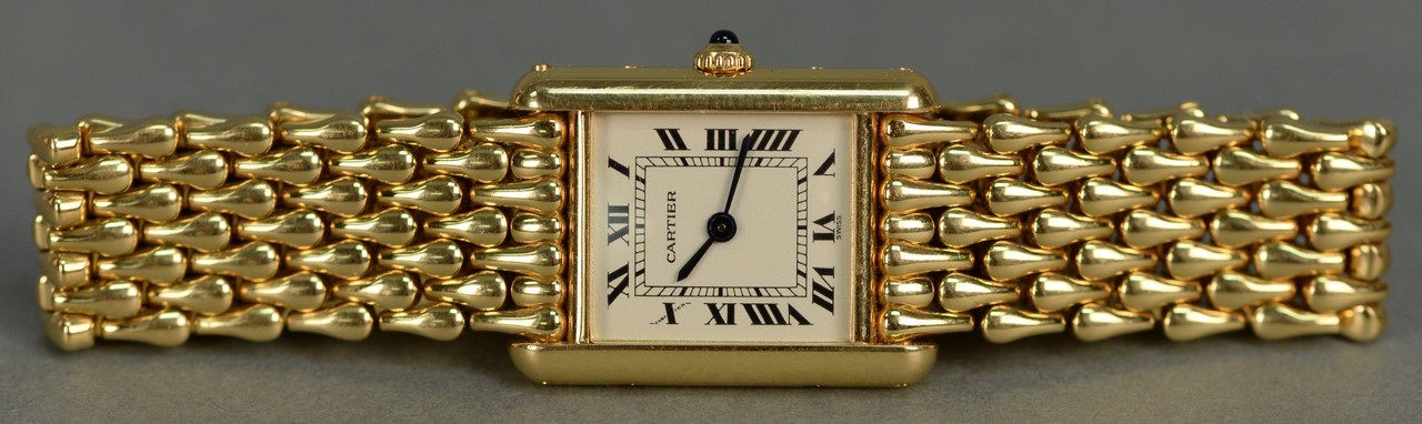 Lot 147: Cartier 18K gold ladies rectangle wristwatch with Cartier 18K mesh bracelet and Cartier box. total weight 86.4 grams