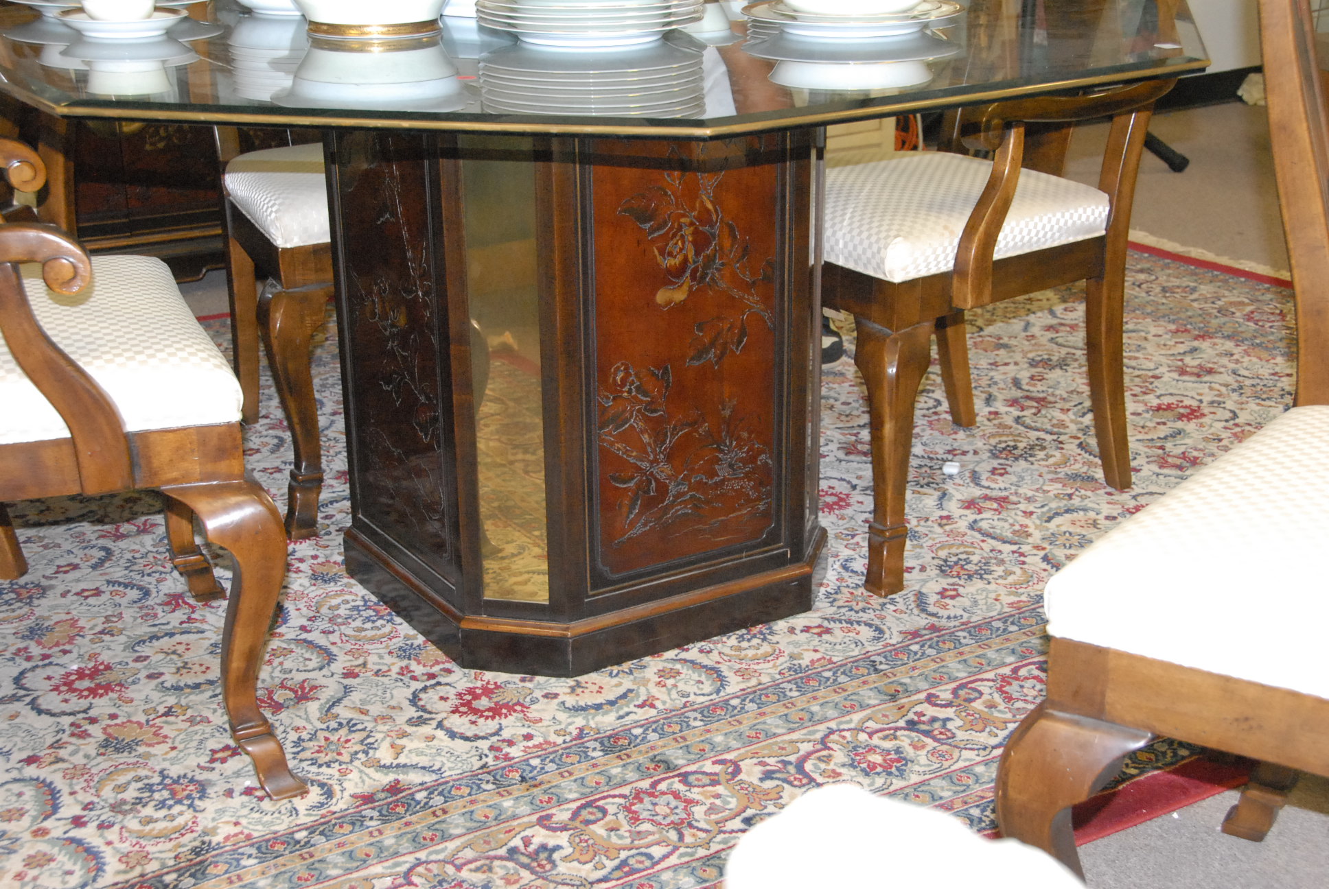 Drexel Heritage octagon glass top dining table with six chairs.