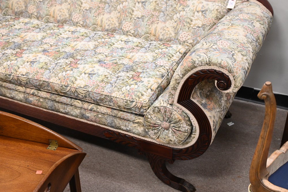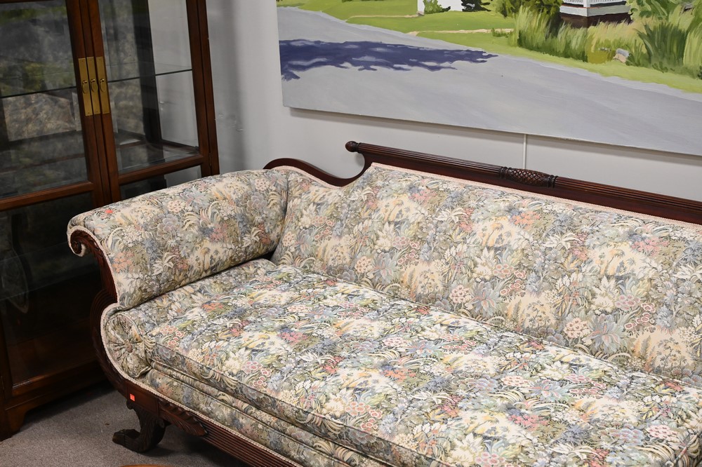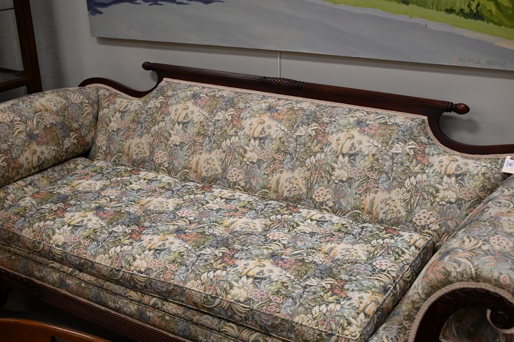 Lot 147: Duncan Phyfe Style Sofa, having tapestry style upholstery, height 33 inches, length 84 inches.
