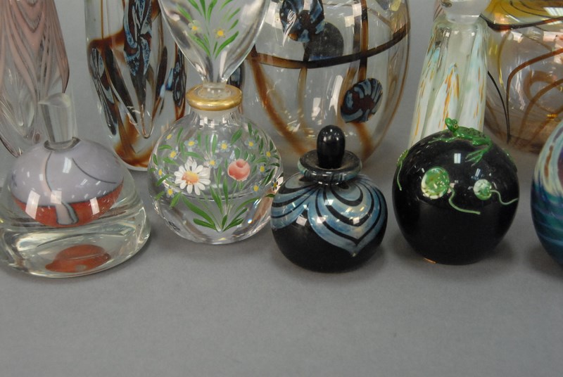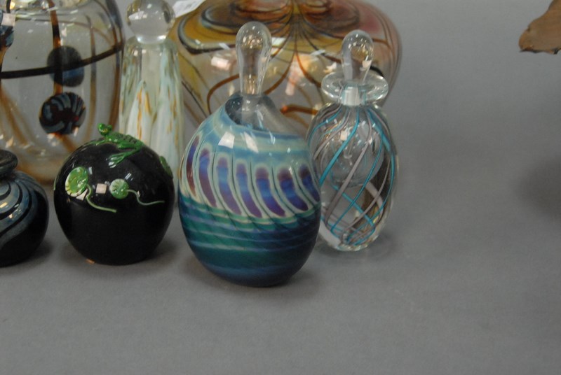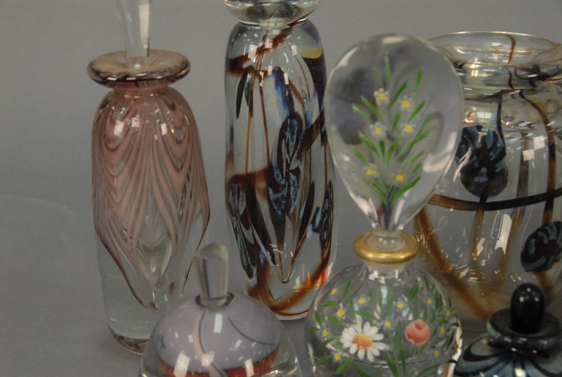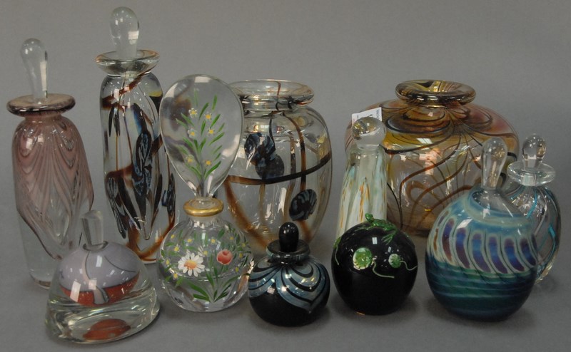 Lot 147: Eleven piece lot to include six Roger gandelman, four art glass perfumes, and frog paper weight.