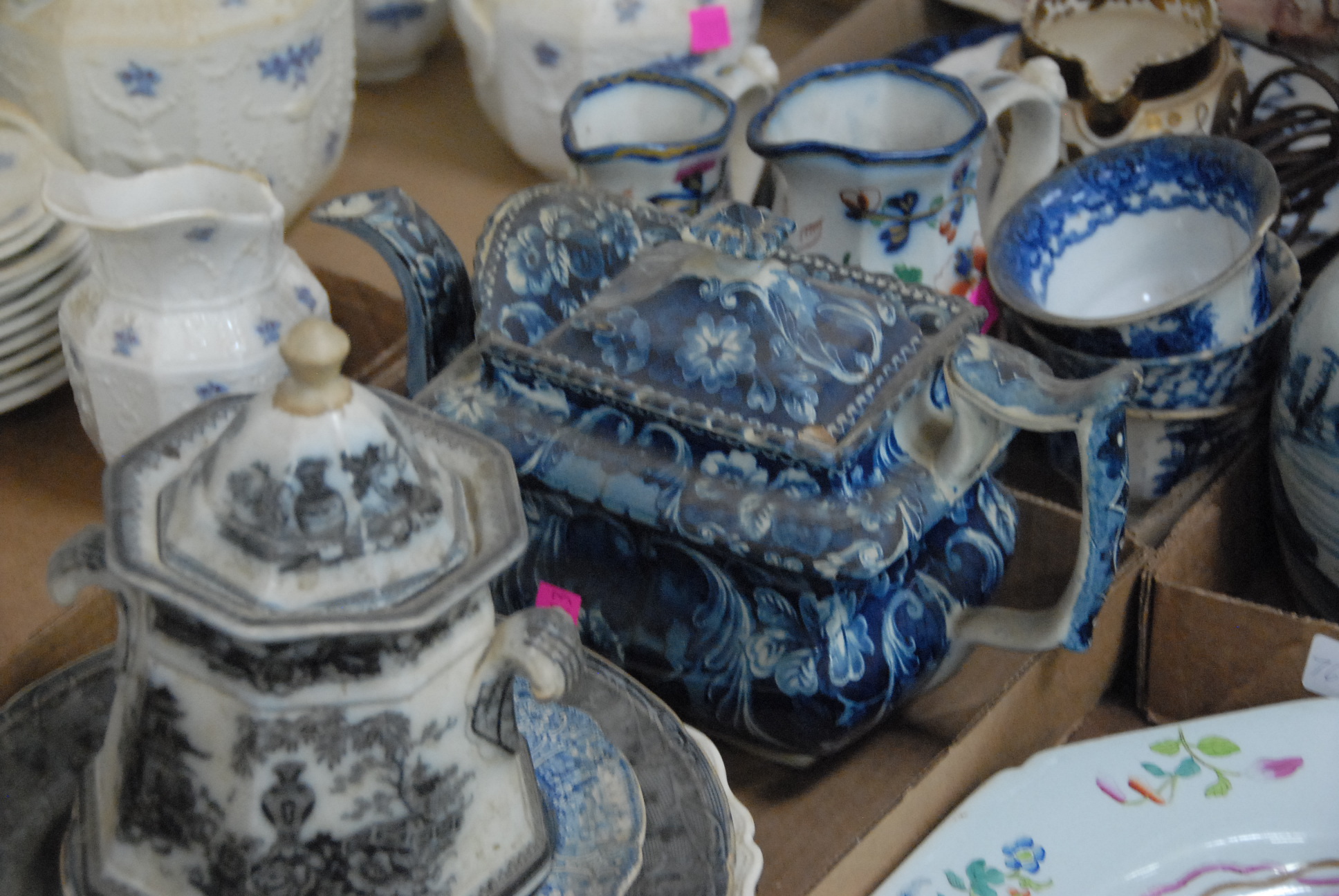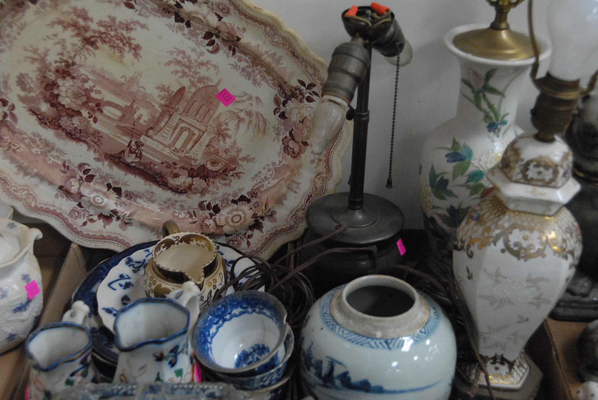 Five box lots to include blue and white Staffordshire, Chelsea and a red and white platter.