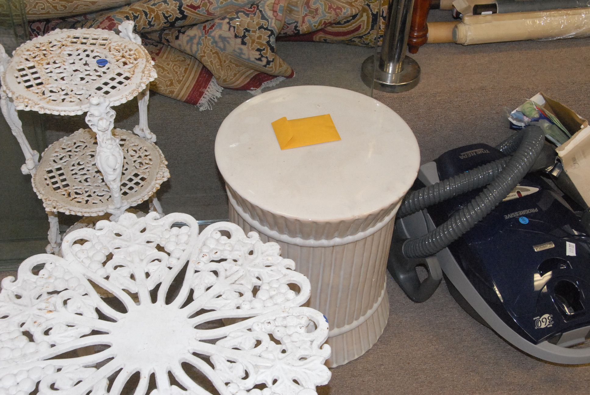 Five piece lot including two iron tables and an iron stand along with a glass top coffee table