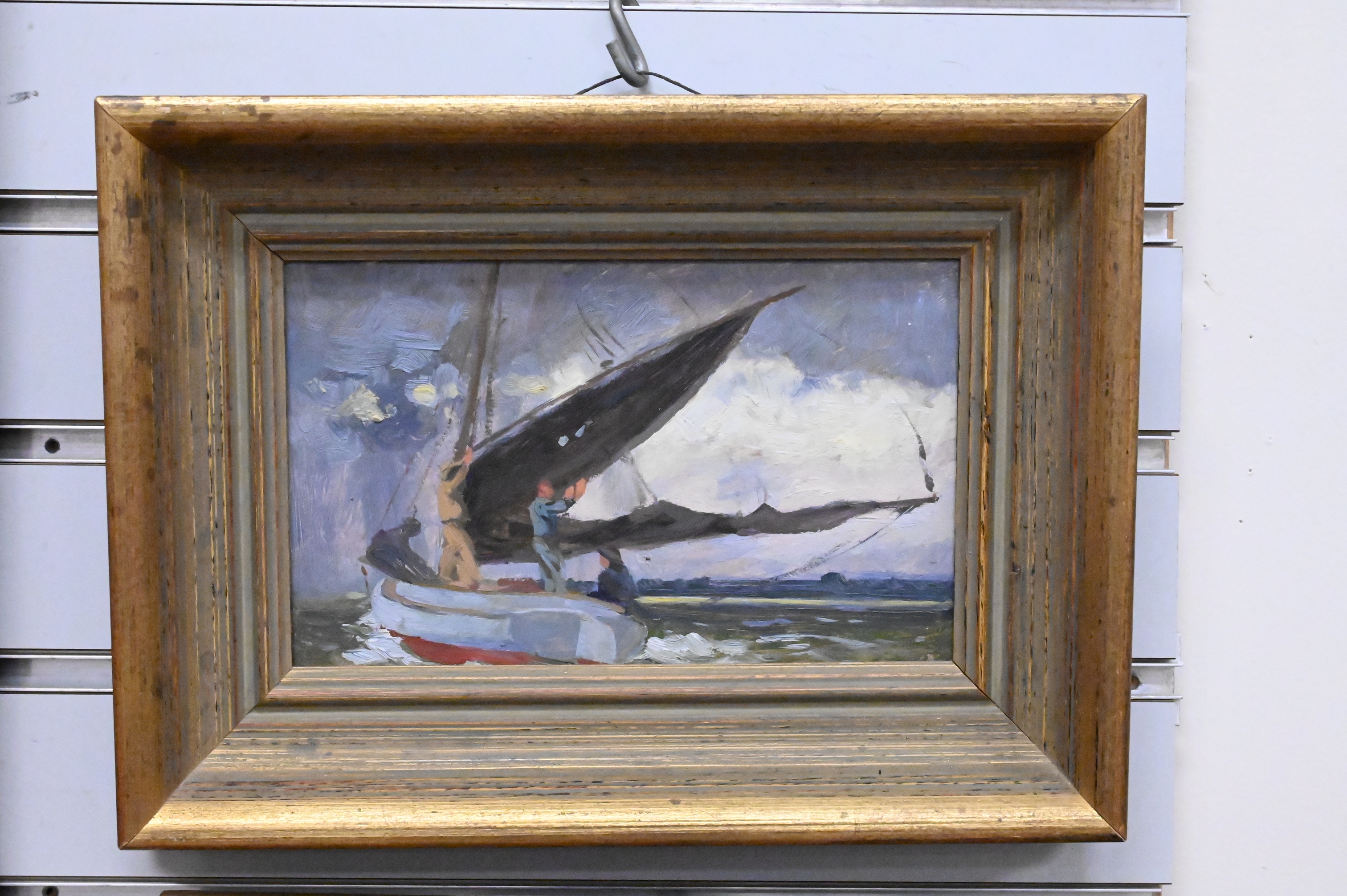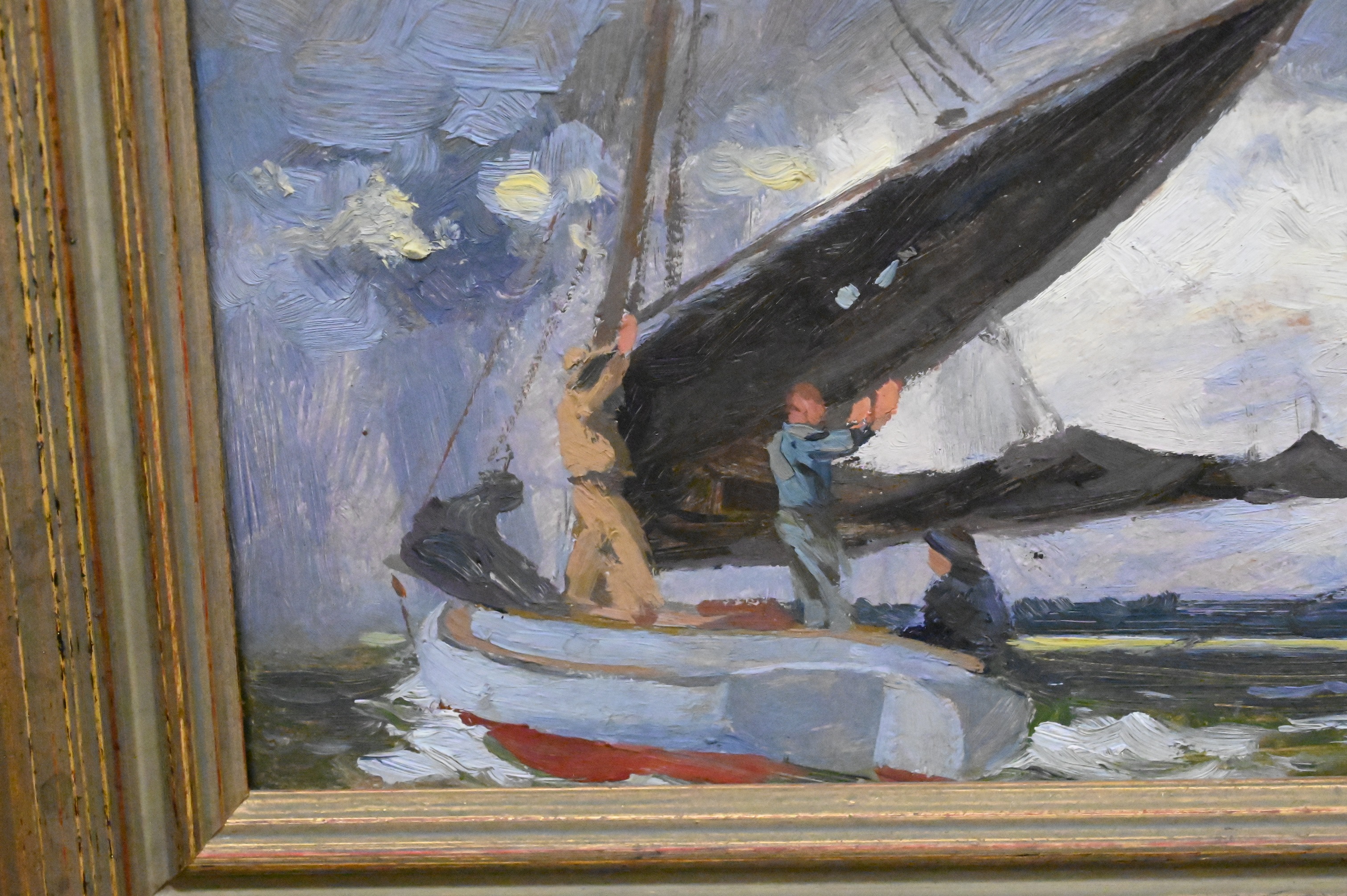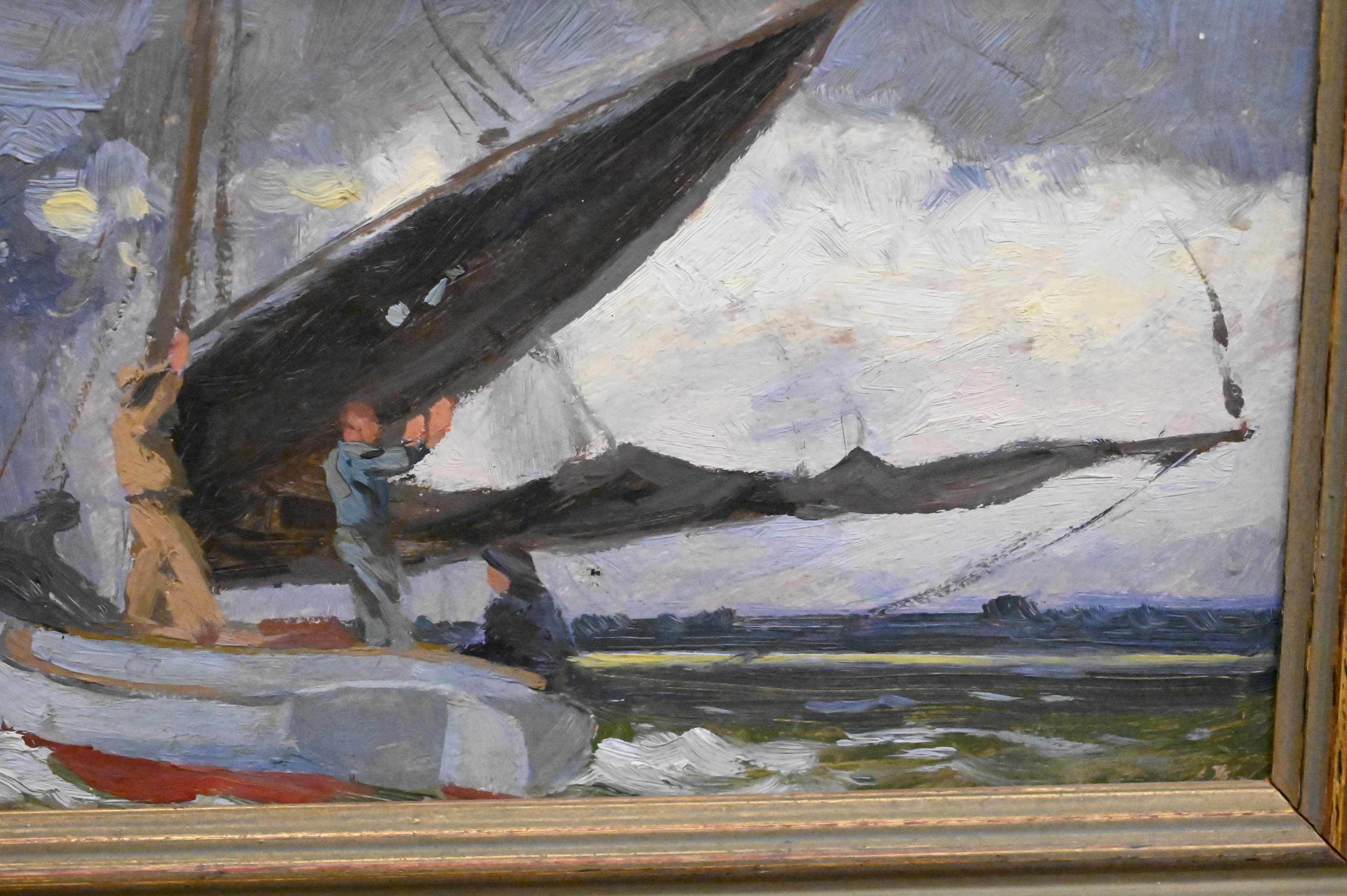 “Hoisting Sails” study of a sailboat on the ocean