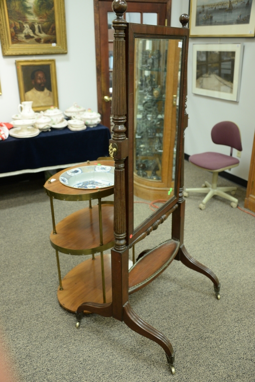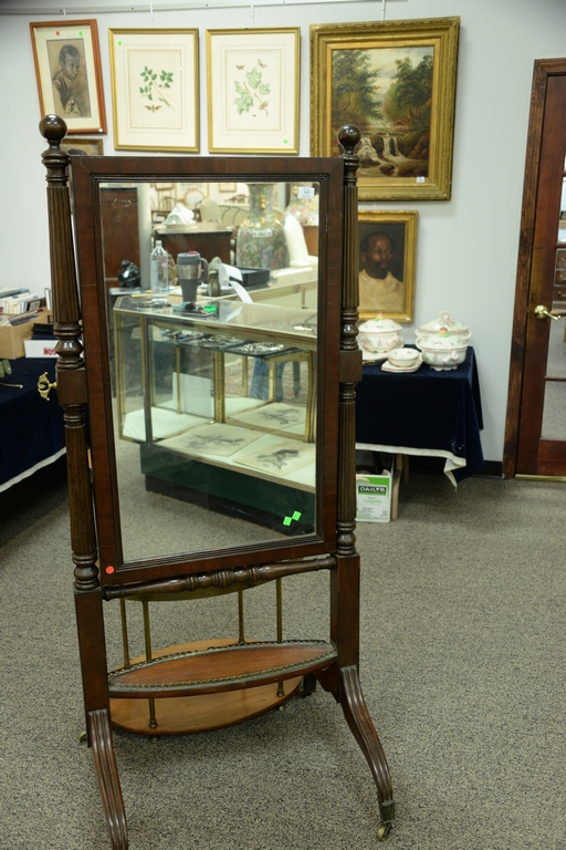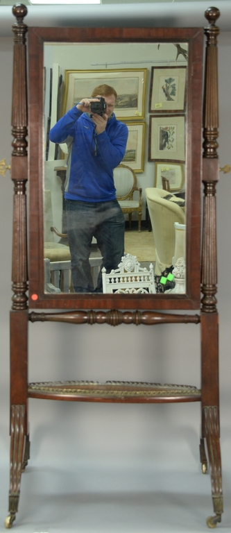 George IV mahogany cheval mirror, rectangle mirror between reeded block and ring turned supports joined by oval tray stretcher on splayed legs. ht. 68 1/2in., wd. 32 1/2in. Provenance: Collection of Anne Jones Willis and the late John Ralph Willis, New Jersey