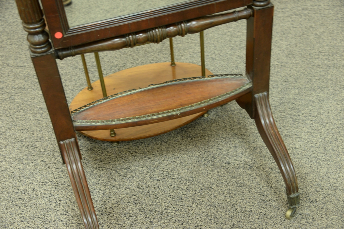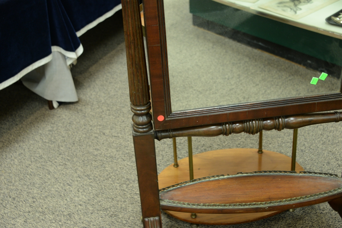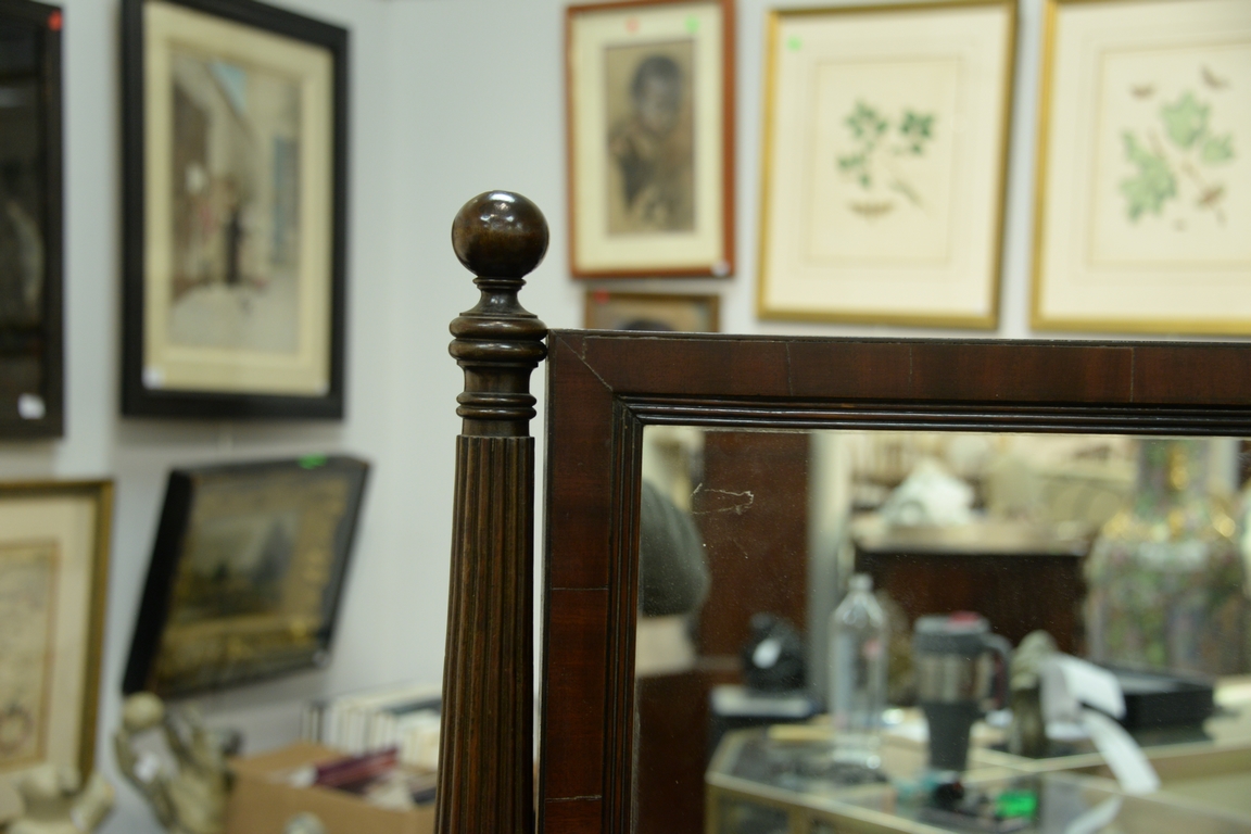 Lot 147: George IV mahogany cheval mirror, rectangle mirror between reeded block and ring turned supports joined by oval tray stretcher on sp…