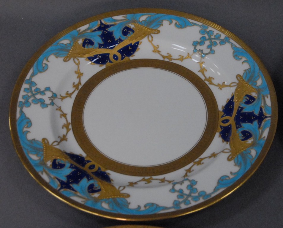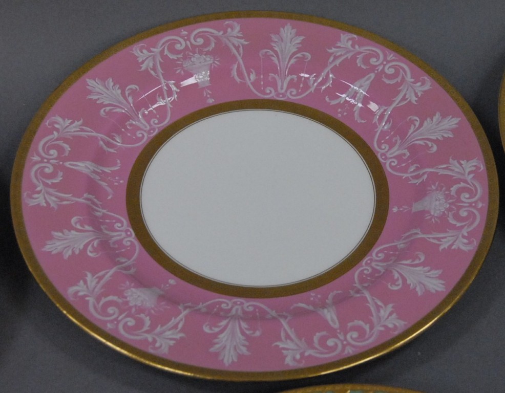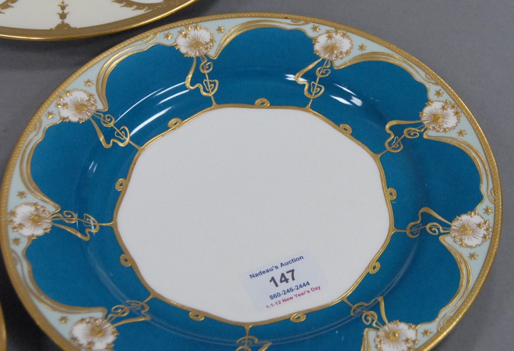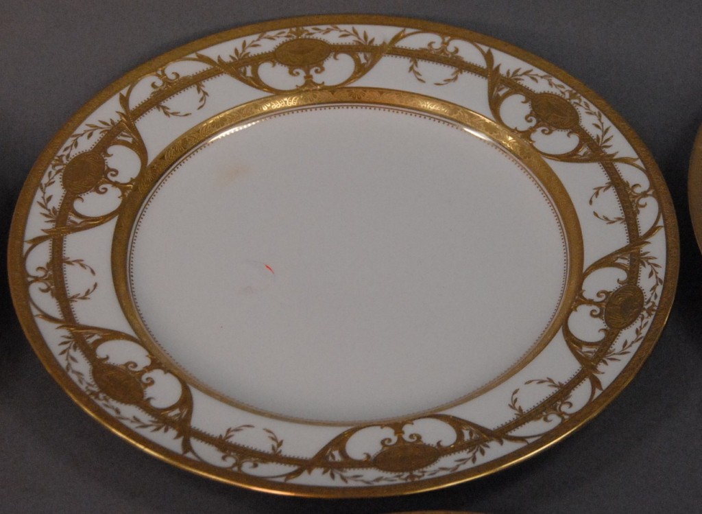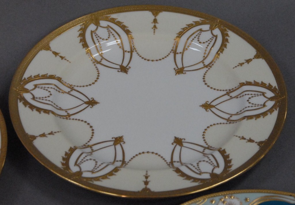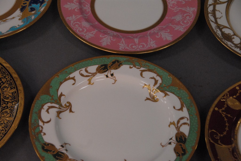 Group of eight service plates, all different patterns all with raised gold decoration, Minton, two are cracked. diameter 10in.