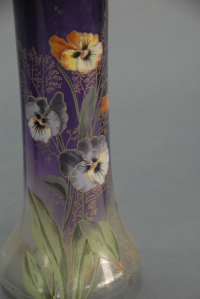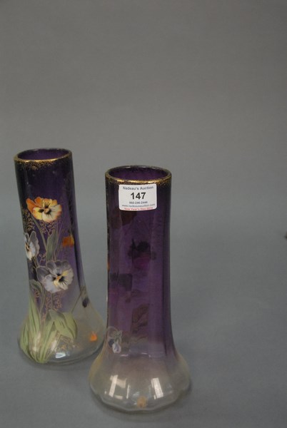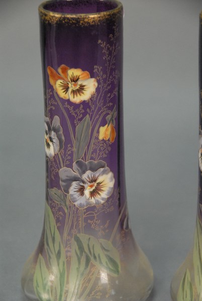 Lot 147: Mont Joye pair of French enameled glass vases Amethyst to clear with heavy enameled flower design. ht. 10in.