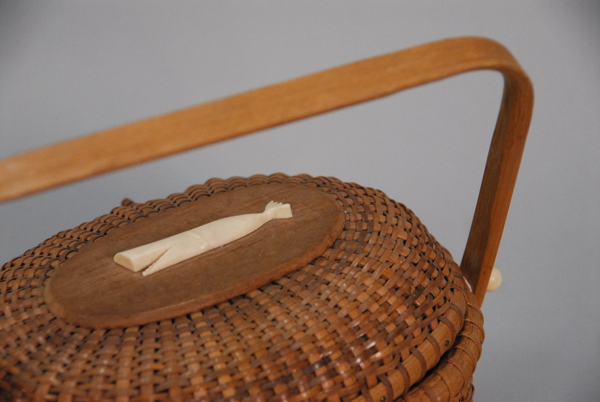 Nantucket lighthouse basket with carved bone whale on oval plaque cover loose. ht. 8in., lg. 10in.