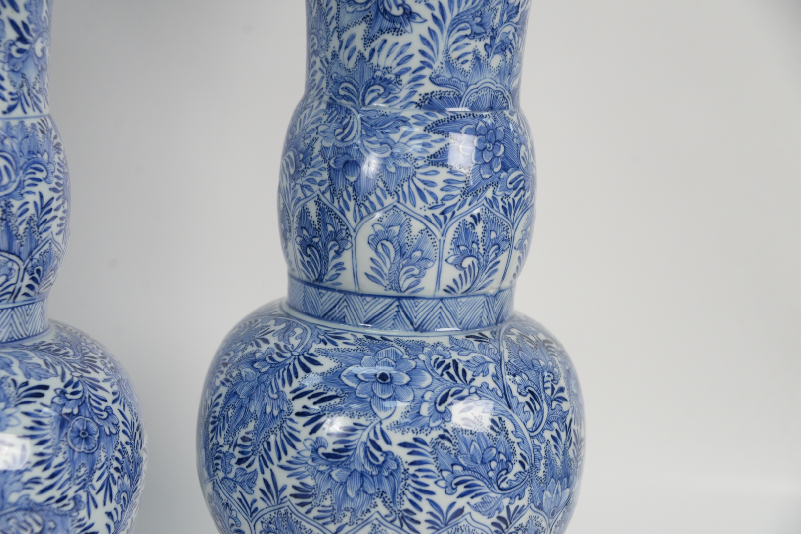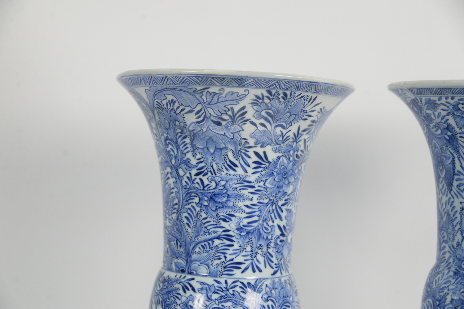 Pair of Chinese Blue and White Yen Yen Vases having flaring rims over slender neck and bulbous body all over foliate design both repaired, heights 17 1/2 inches.