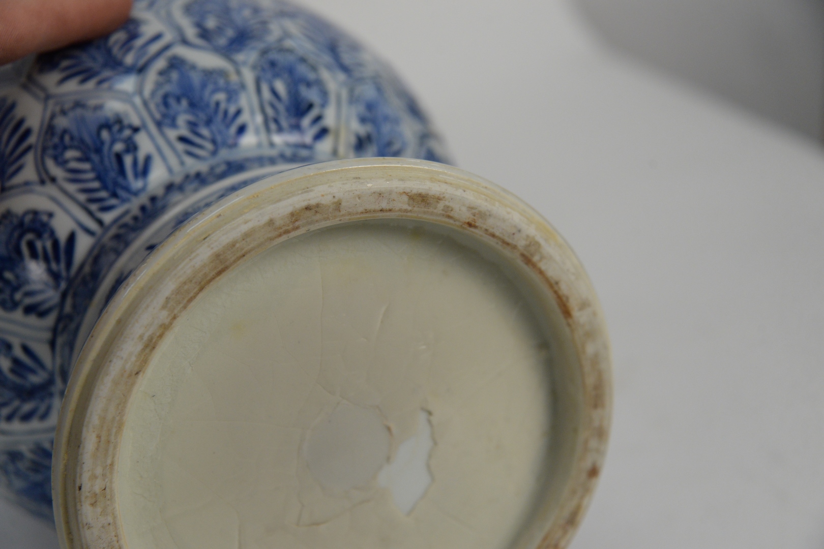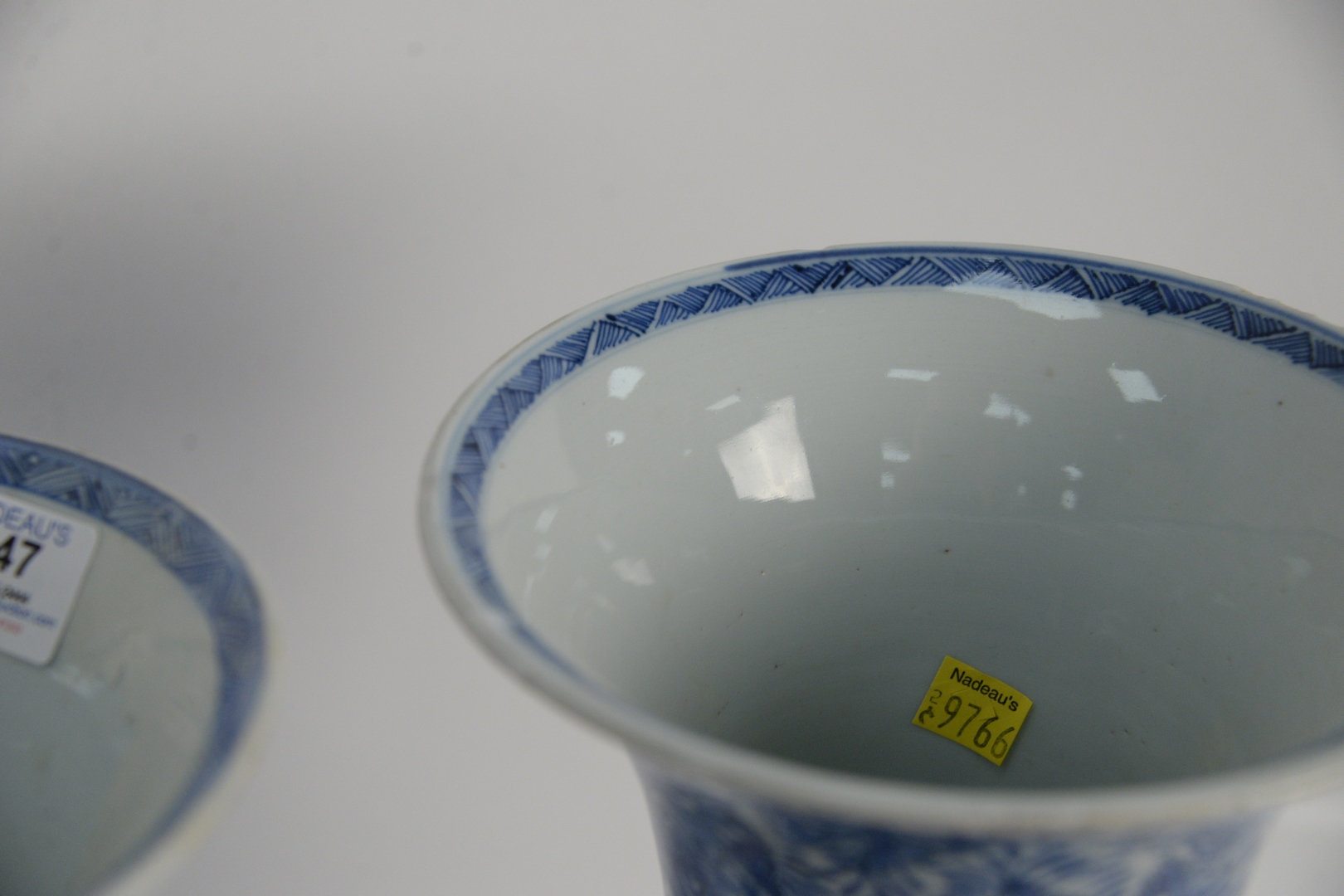 Lot 147: Pair of Chinese Blue and White Yen Yen Vases having flaring rims over slender neck and bulbous body all over foliate design both repaired, heights 17 1/2 inches.