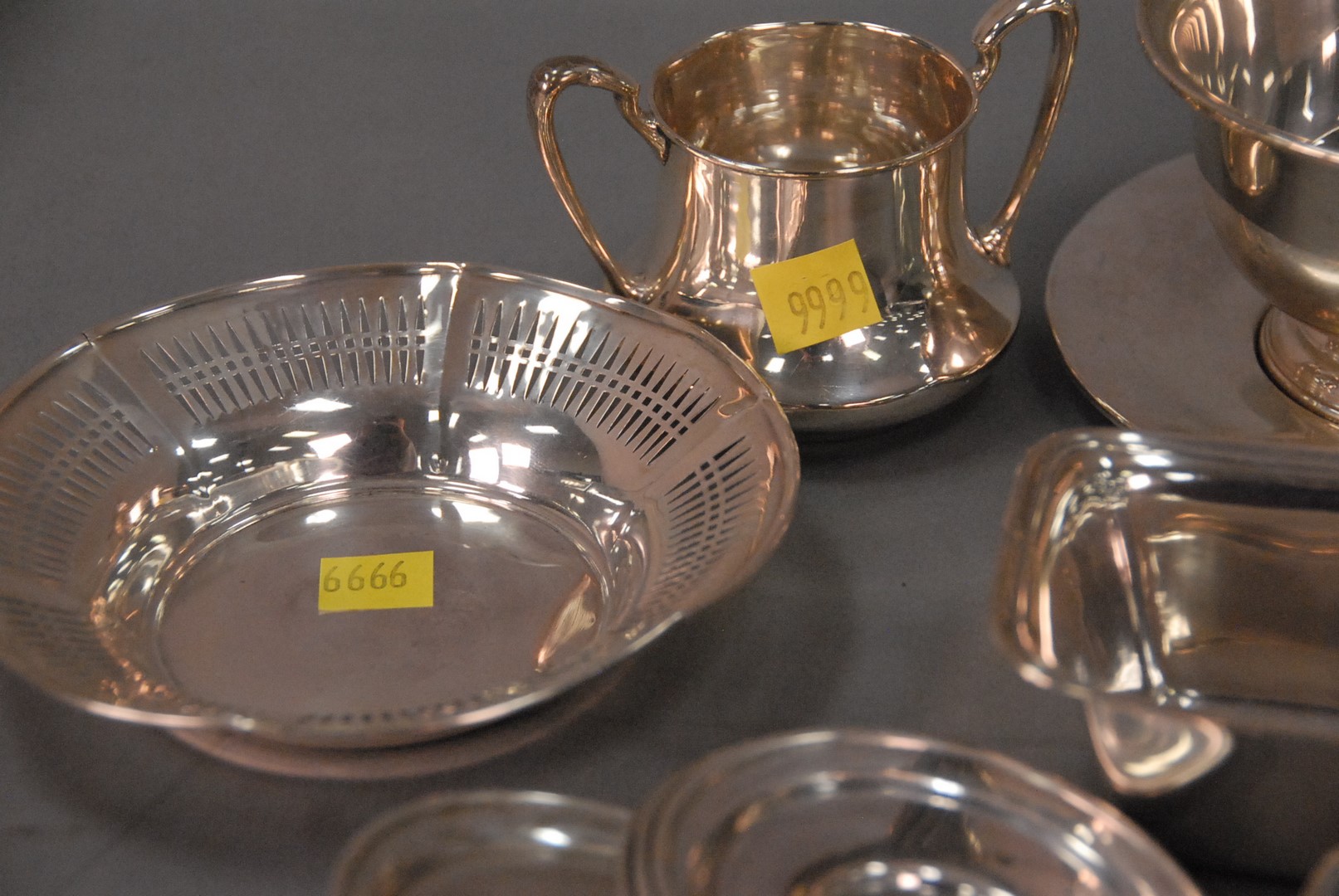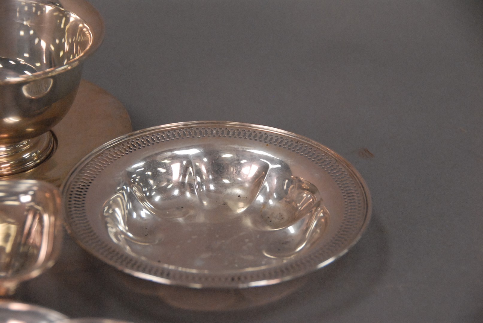 Lot 147: Sterling silver lot to include demi-saucers, sugar bowl, plate, open bowl, two candy dishes, and open sugar bowl. 20 t oz.